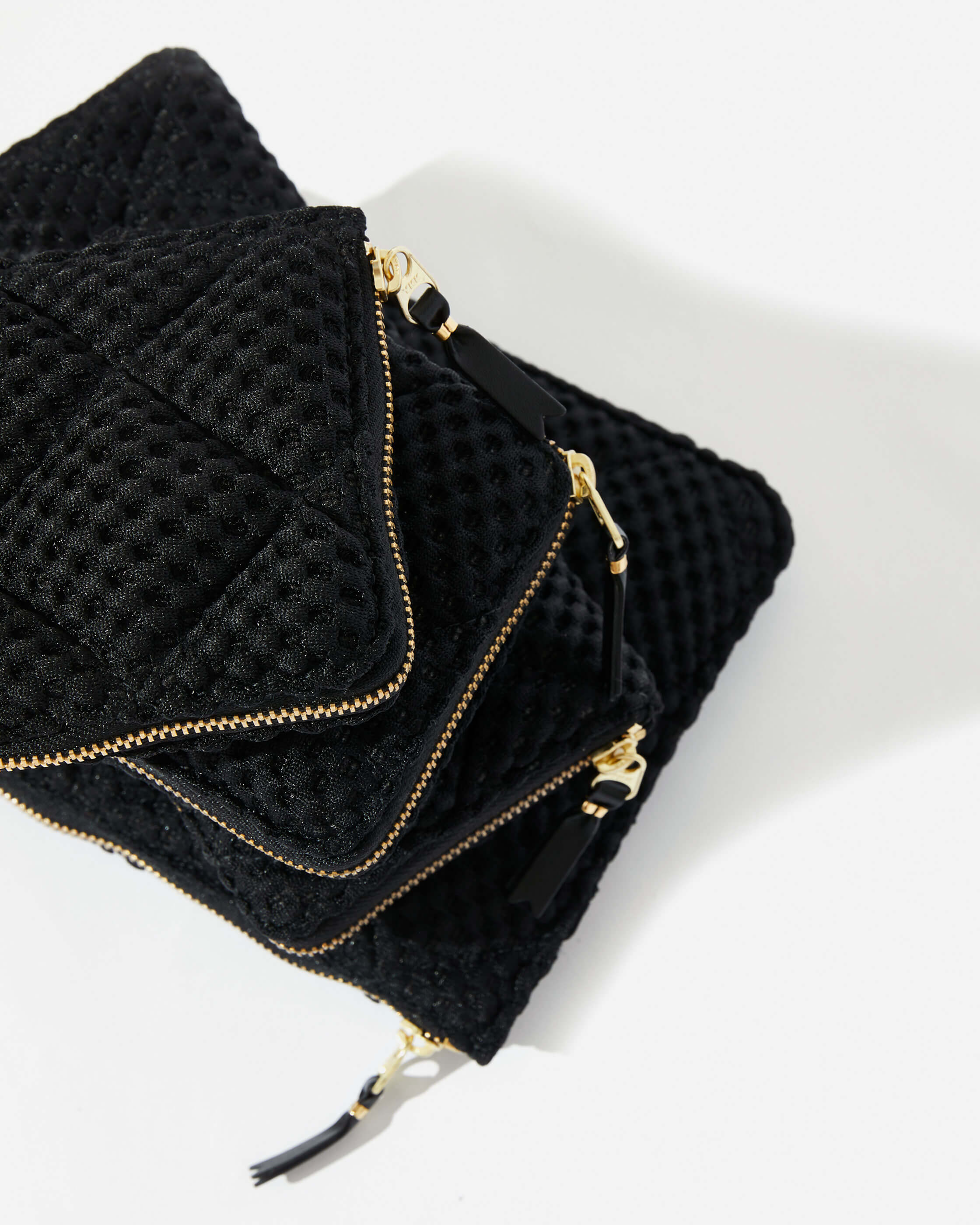 THE ‘FAT TORTOISE’ COLLECTION INCLUDES THE CLASSIC HALF ZIP AND FULL ZIP WALLET STYLES, ALONGSIDE THE LARGER POUCH AND CLUTCH. EACH IS CONSTRUCTED FROM AN EMBOSSED POLY FABRIC STITCHED WITH DIAMONDS AND FILLED, CREATING A UNIQUE PADDED OUTER. THE COLLECTION COMES SOLELY IN BLACK, AND FEATURES GOLD ZIPS AND A MATCHING GOLD COMME DES GARÇONS LOGO PRINTED ON THE INSIDE.