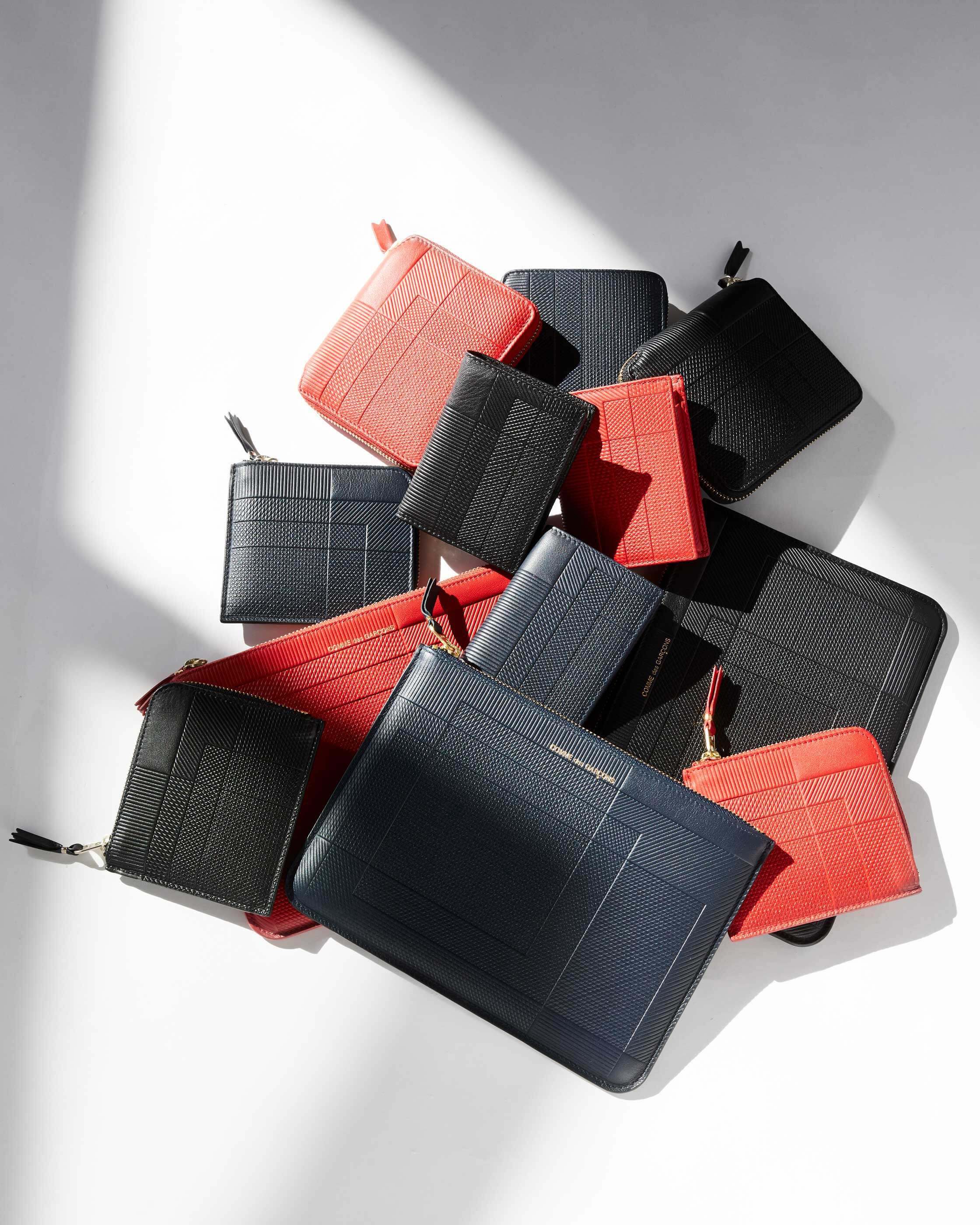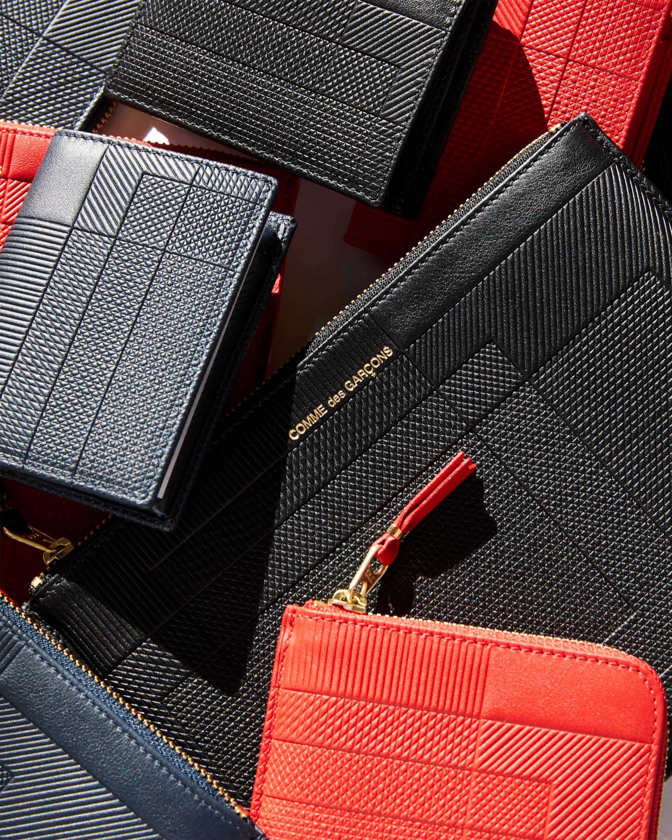 ‘INTERSECTION’ IS THE SECOND COLLECTION, WHICH INCLUDES THE SAME STYLES AS ‘FAT TORTOISE’, WITH THE ADDITION OF A CARD WALLET. AVAILABLE IN RED, NAVY AND BLACK, THE COLLECTION IS MADE FROM 100% COWHIDE LEATHER WHICH HAS BEEN EMBOSSED WITH A SELECTION OF GEOMETRIC SHAPES CREATING AN INTERESTING TEXTURED PATTERN. EACH WALLET IS FINISHED WITH COMME DES GARÇONS CLASSIC GOLD ZIPS AND PRINTED LOGO.