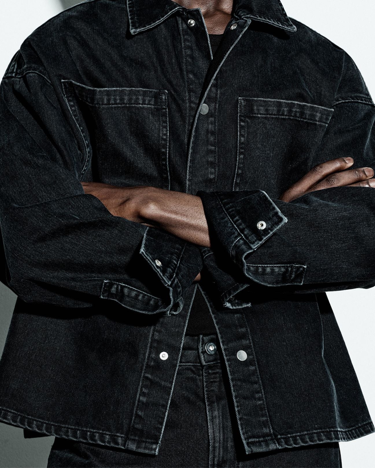 Black wash pieces feature a subtle faded effect, creating a deep, rich tone with a lightly worn-in look across the MKI Denim Box Overshirt and MKI Denim Classic Jean. Both are crafted from durable, structured denim and finished with a leather branding patch for a polished yet rugged aesthetic.