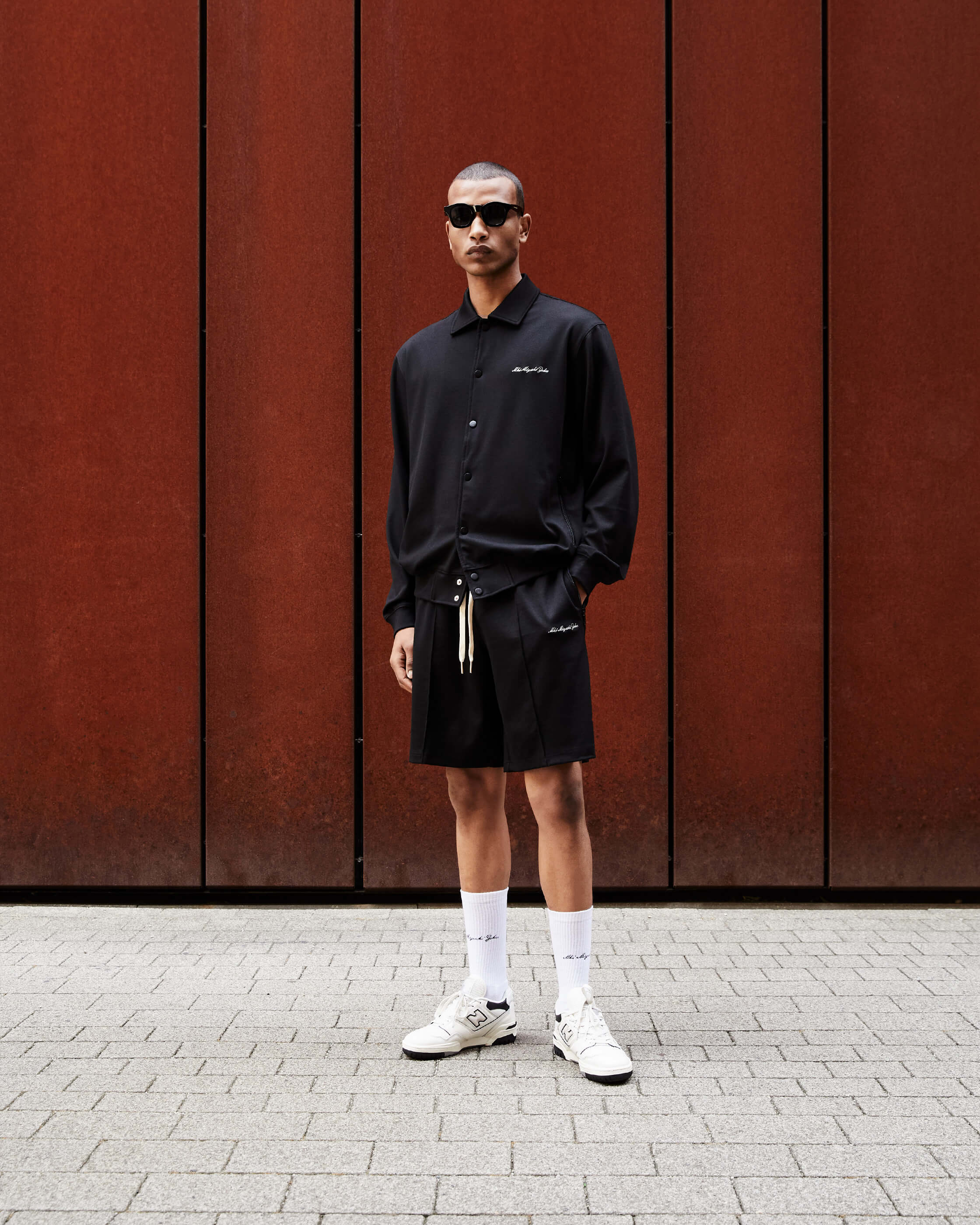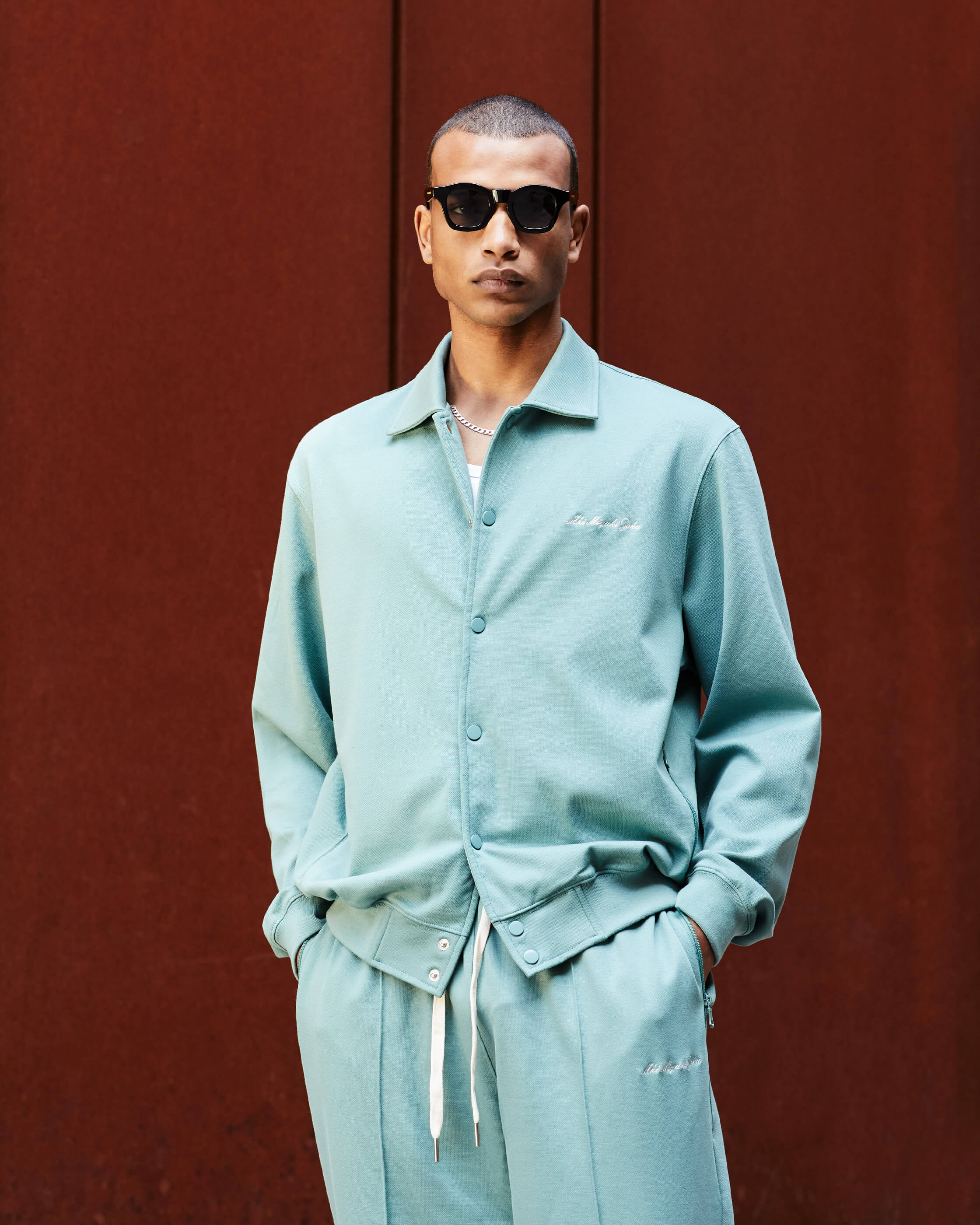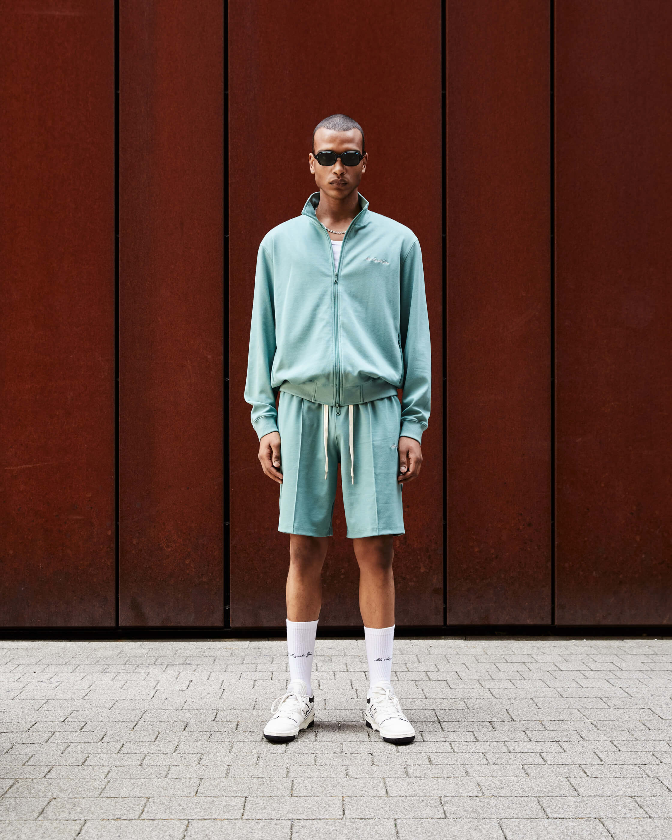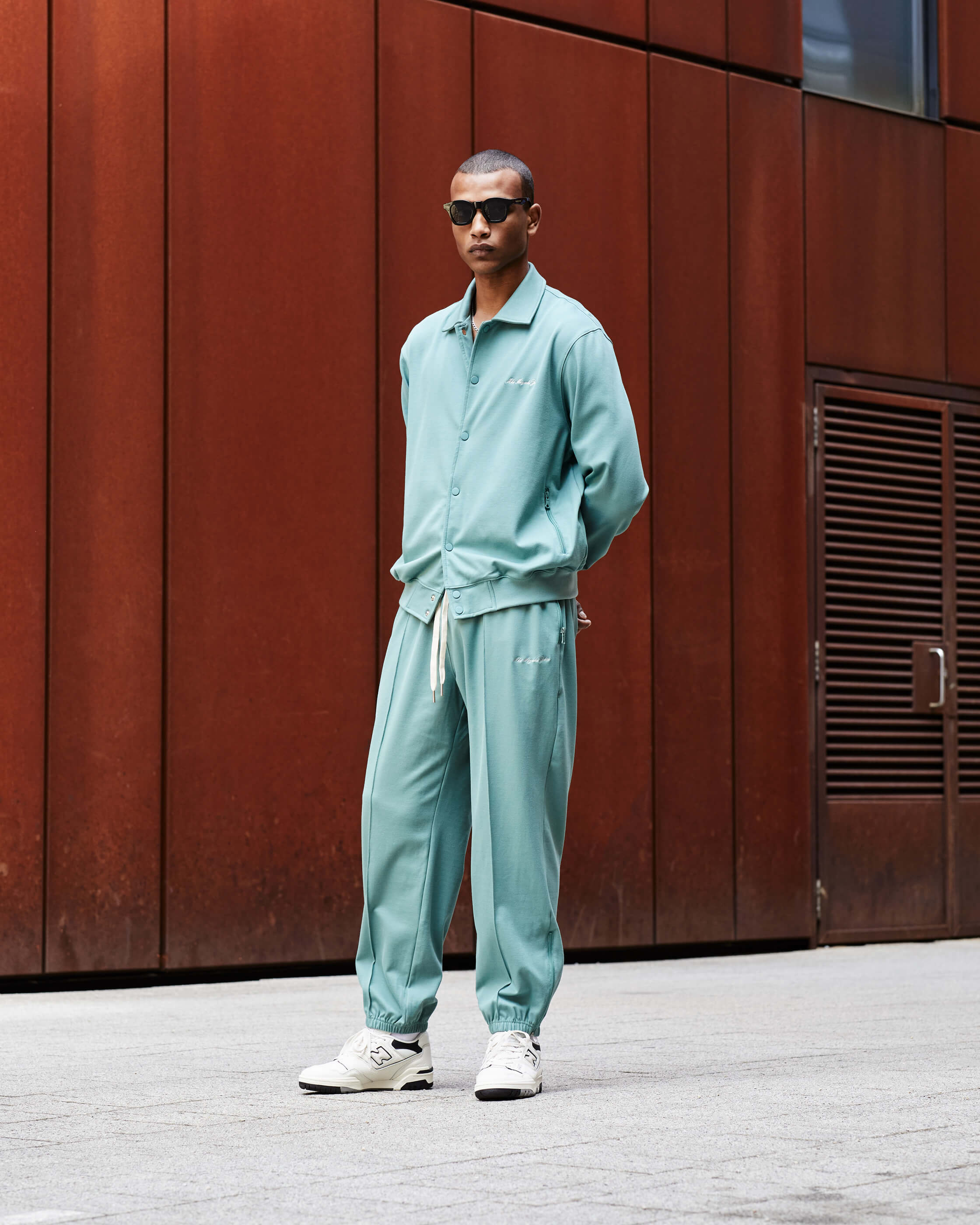 CONSTRUCTED IN A MIDWEIGHT POLY BLEND, THE PIECES ARE FINISHED WITH RIBBED ZIP HEMS, AND UNLINED FOR A LIGHT SUMMER FEEL. RELEASING IN BLACK AND PASTEL GREEN, THE COLLECTION INCLUDES A TRACK JACKET, COACH JACKET, TRACK PANTS AND TRACK SHORTS.