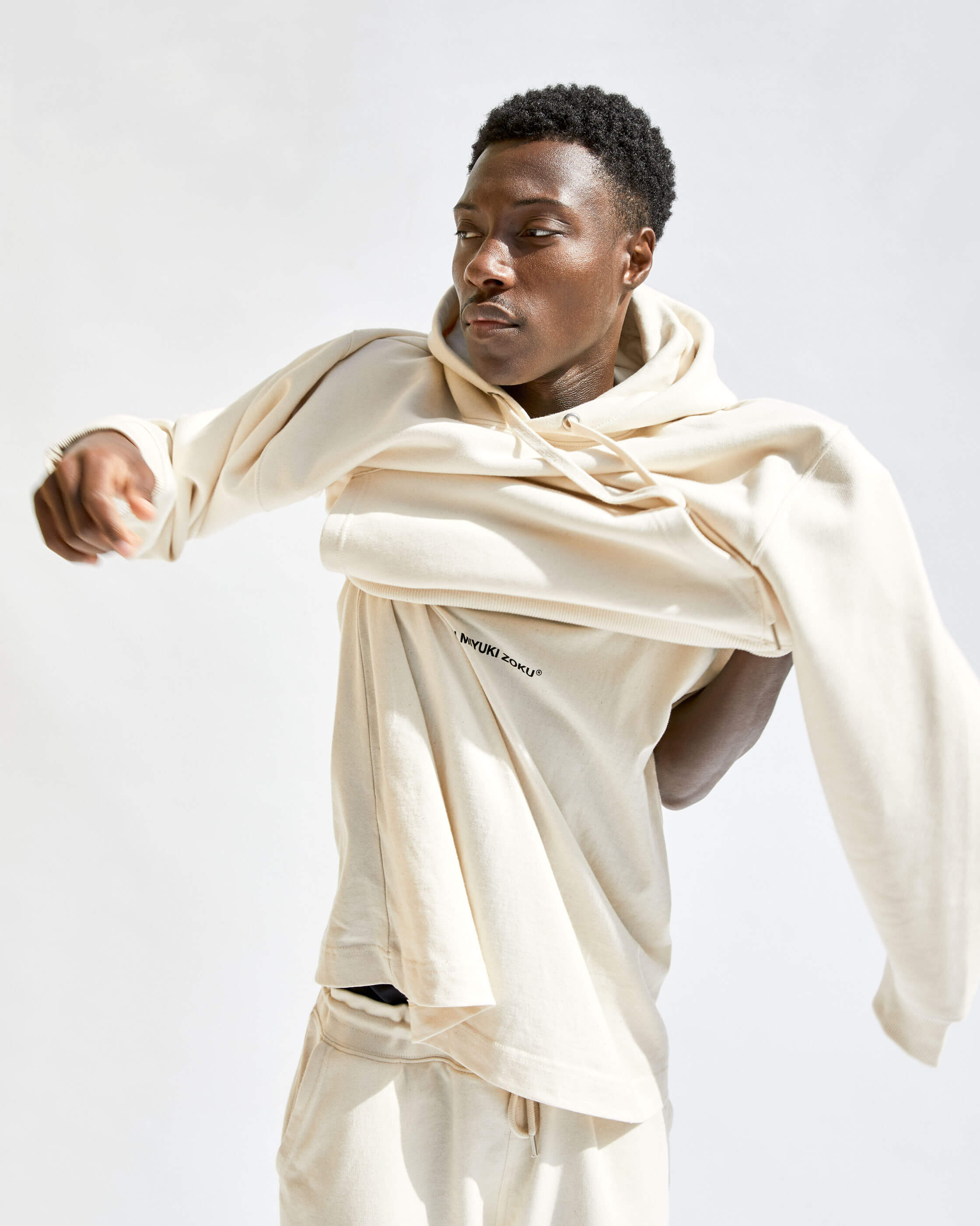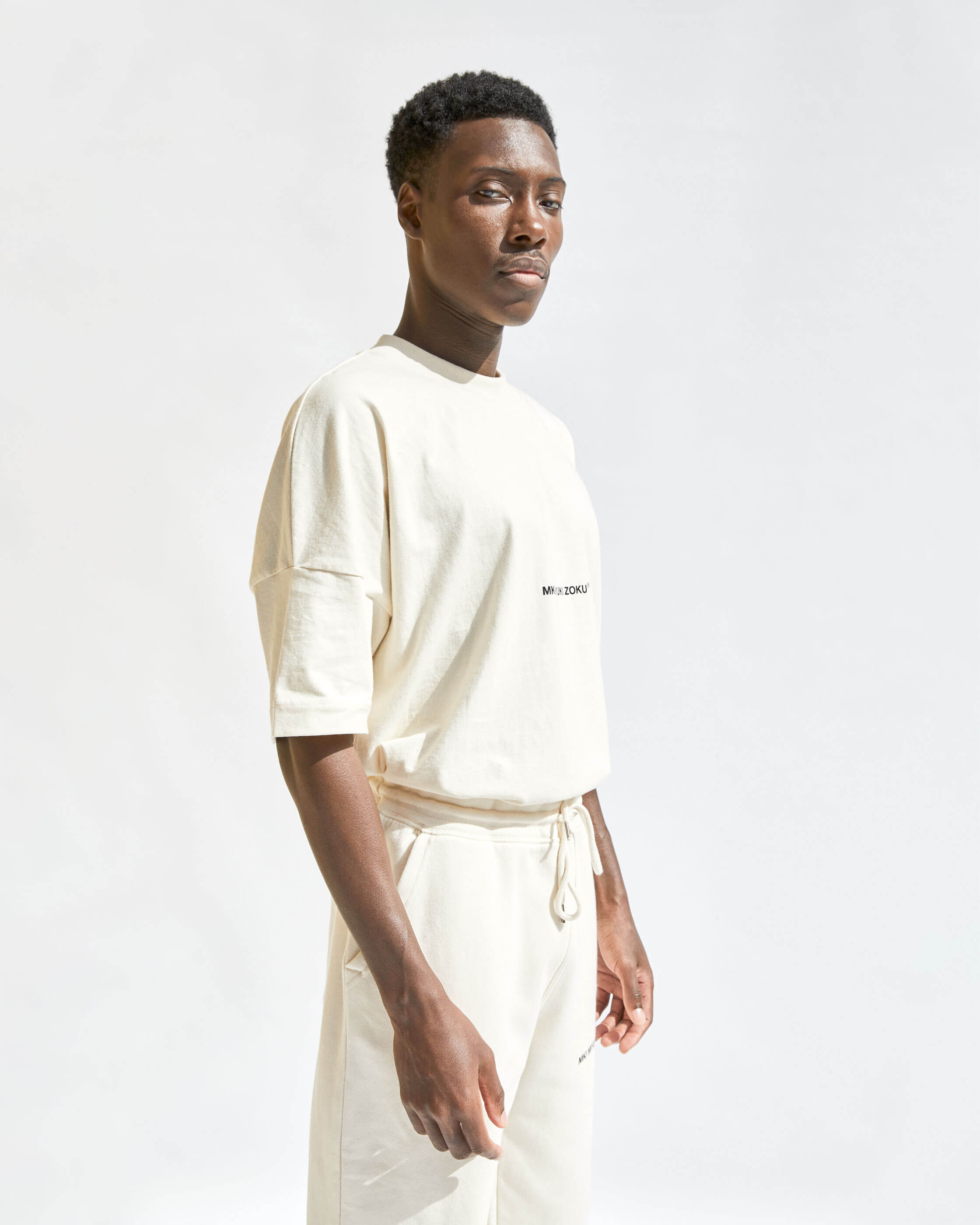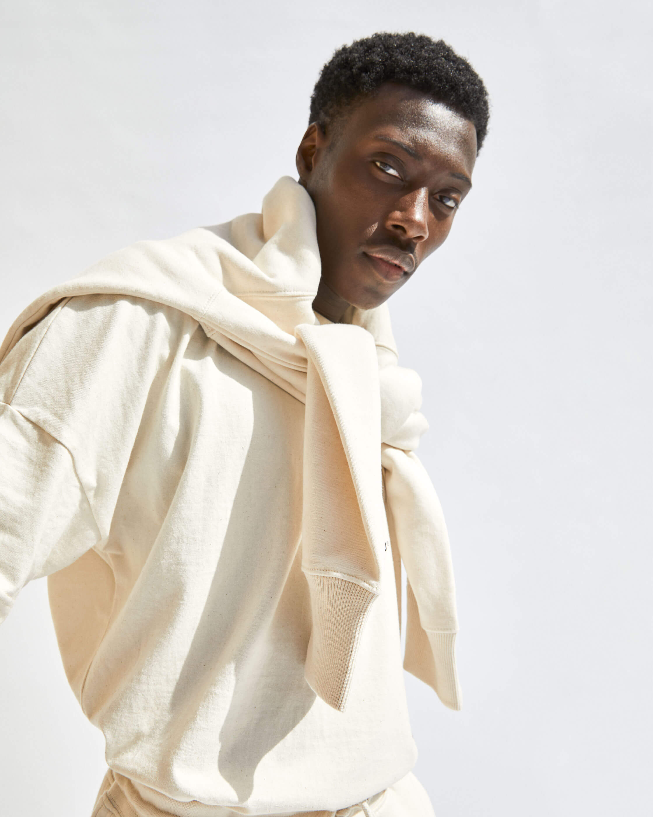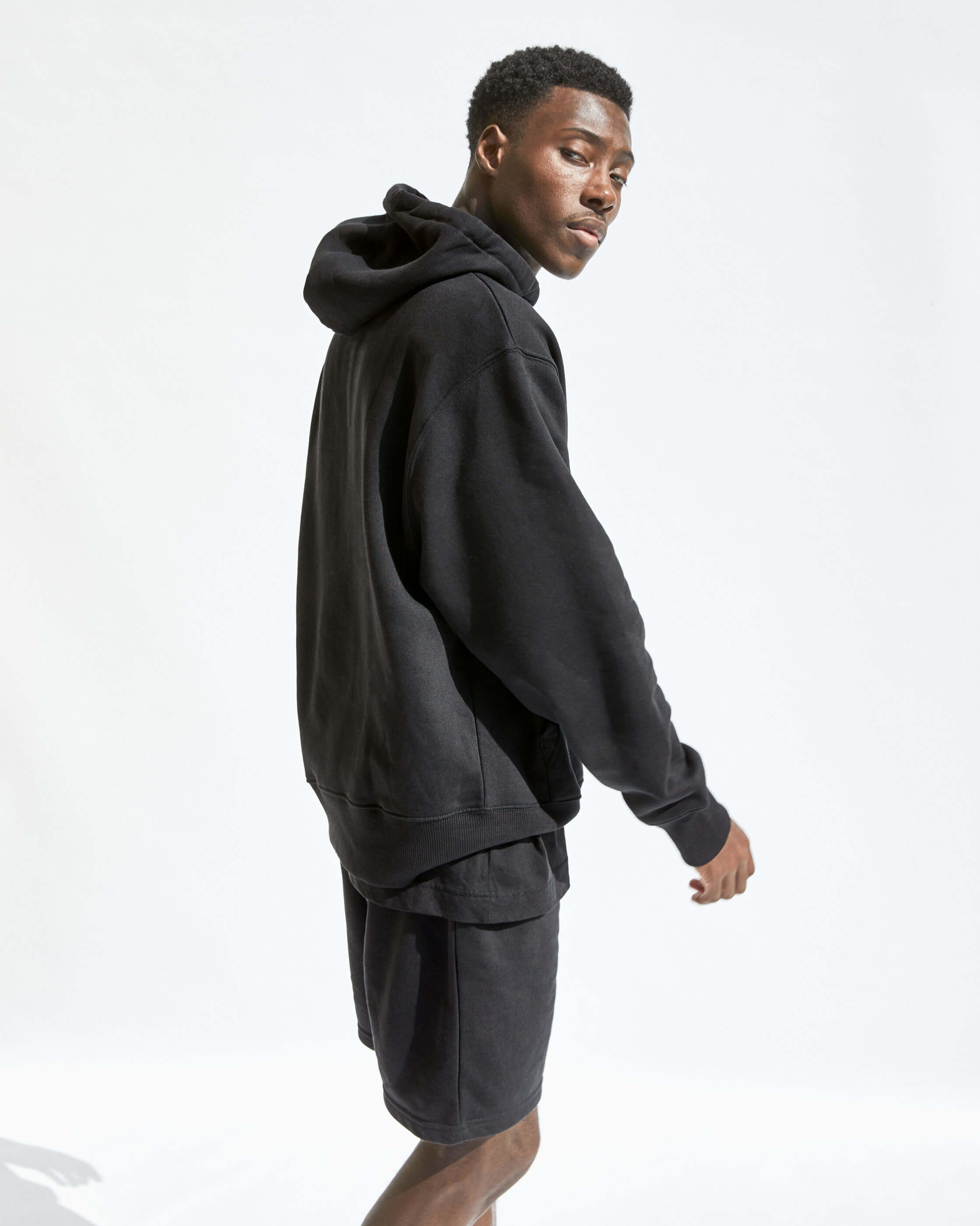 COMPRISED OF TEES, CREWS, HOODS, JOGGERS AND SHORTS. WE'VE OFFERED A NATUAL RAW ECRU AND SOLID BLACK. ALL STYLES ARE MADE FROM ORGANIC COTTON MIXES AND ARE COLOUR MATCHED TO BE PERFECTLY INTERCHANGEABLE.