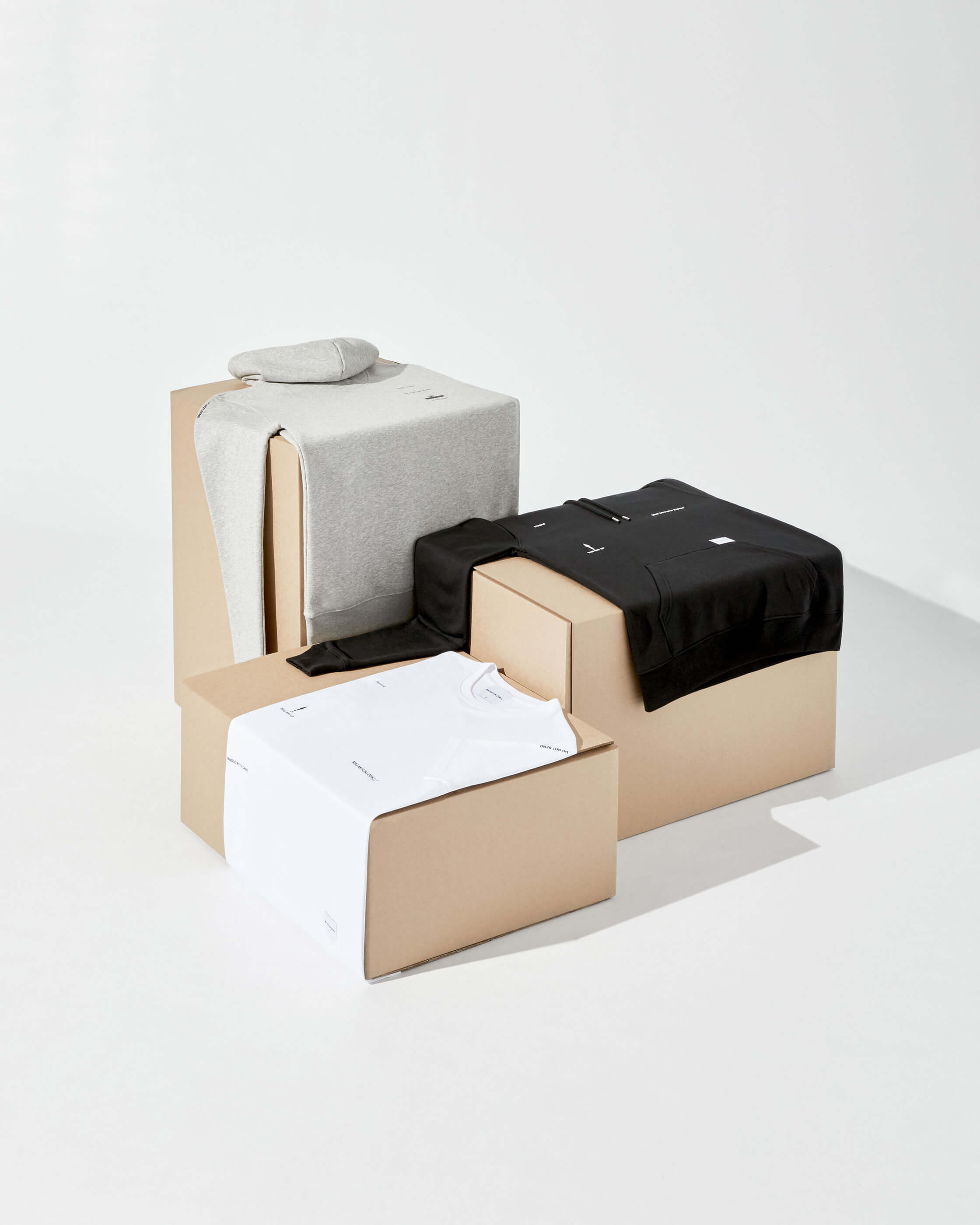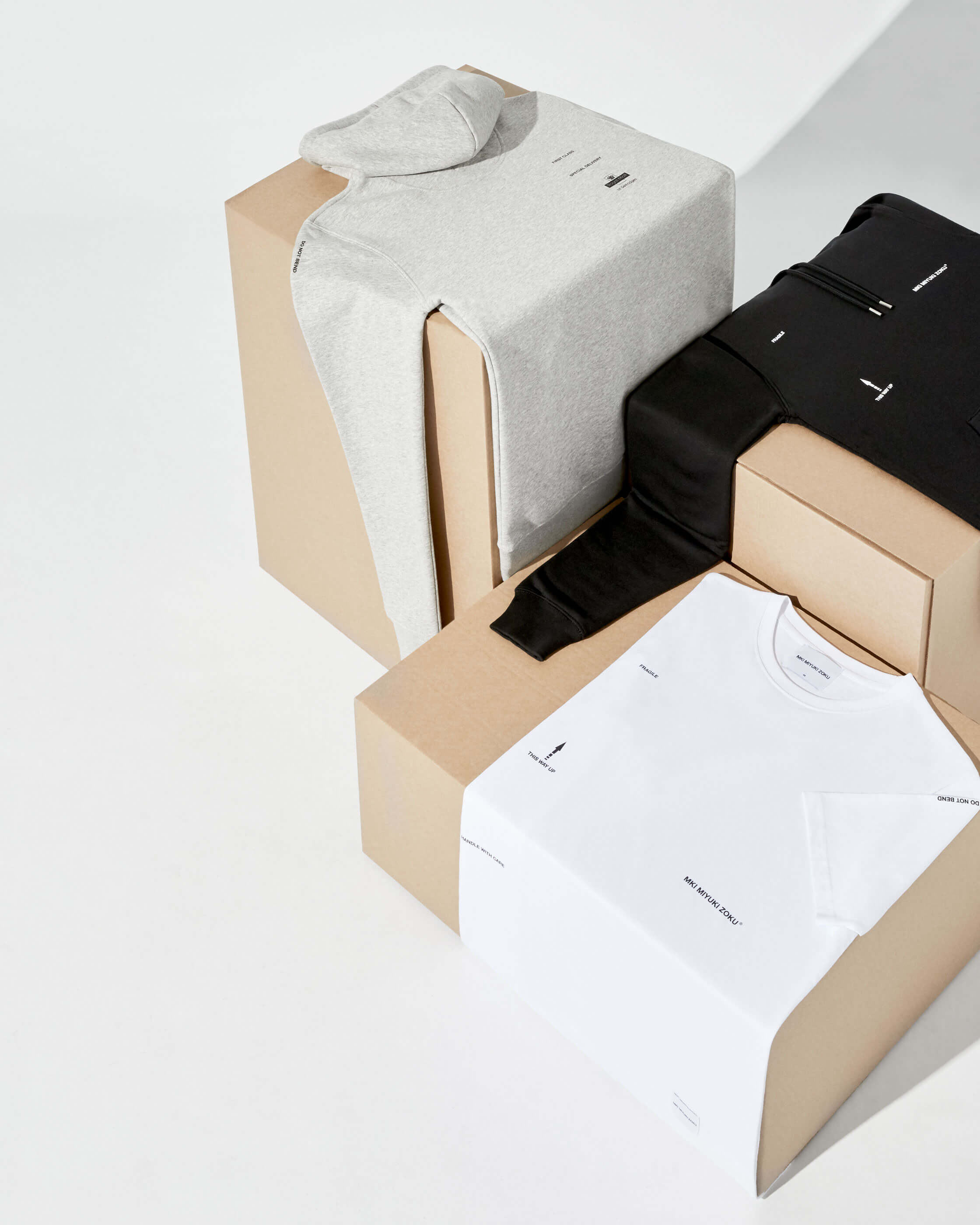 INSPIRED BY THE PHRASES AND MARKINGS THAT WE ARE FAMILIAR WITH SEEING ON LETTERS AND PARCELS, WE HAVE PRODUCED A SELECTION OF GRAPHIC T-SHIRTS, HOODY’S AND CAPS. WITH IRONIC LOGO PLACEMENT INCLUDING ‘DO NOT BEND’ ON THE UPPER ARM, AND ‘THIS WAY UP’ ON THE TORSO, TO CREATE CONVERSATIONAL PIECES FROM A SEEMINGLY SUBTLE DESIGN.