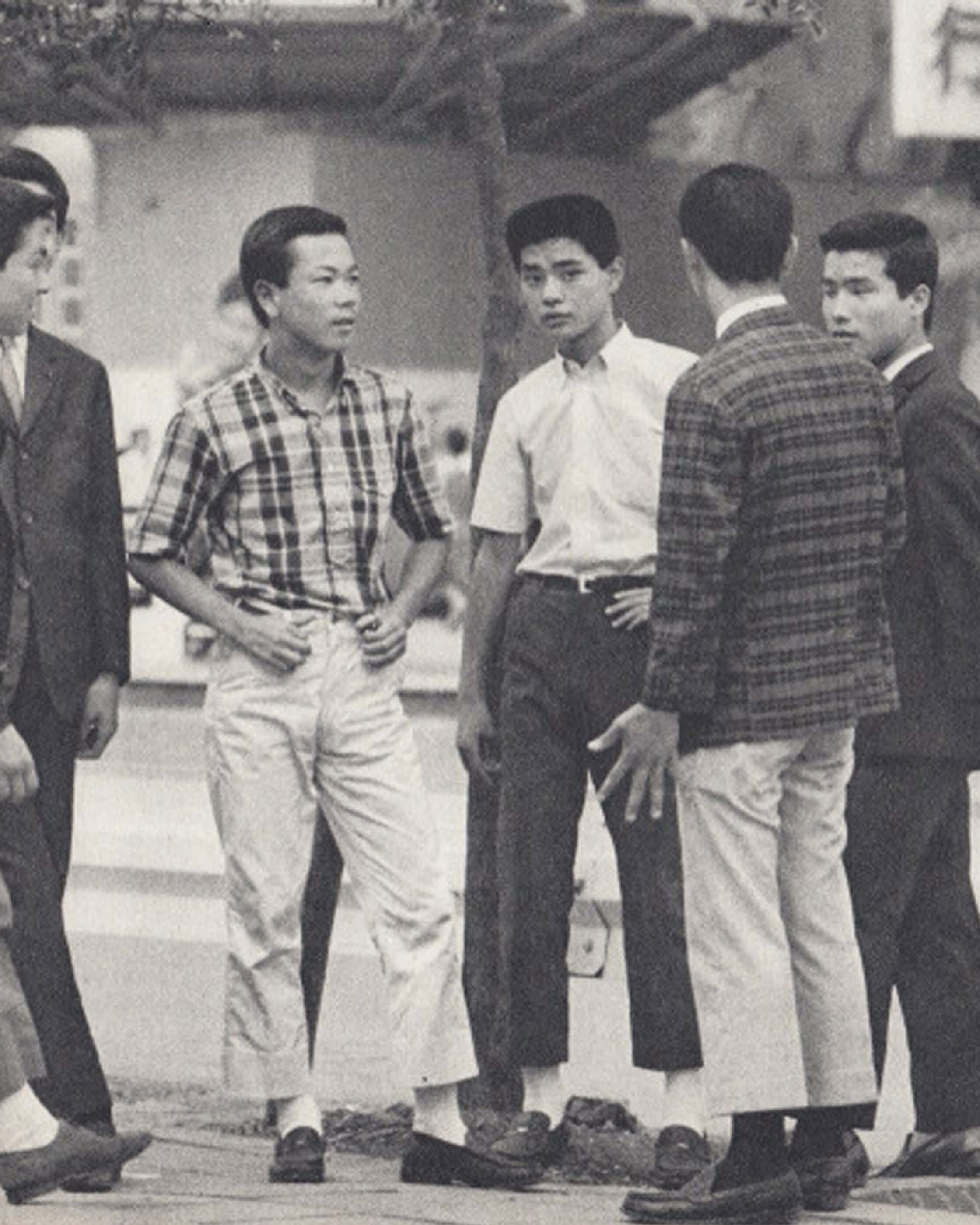 ONCE THEY FINISHED SCHOOL, OR WORK, THEY WOULD USE BATHROOMS TO CHANGE INTO THEIR NEW STYLE, STUFFING THEIR LESS DESIRABLE UNIFORMS INTO THE BROWN PAPER BAGS FROM THE NEW STORES THEY HAD BEEN SHOPPING IN.OVER THE SUMMER OF 1964, GROUPS WOULD LOITER OUTSIDE THEIR FAVOURITE STORES, CAFÉS AND RESTAURANTS ON MIYUKI DORI (OR MIYUKI STREET) WHERE THEY WERE GIVEN THE MONIKER OF THE MIYUKI ZOKU (MIYUKI TRIBE). THE MIYUKI ZOKU IN PARTICULAR PUSHED THE IVY STYLE FURTHER BY RAISING THE HEM OF THEIR TROUSERS BY 10-15CM, IN DIRECT CONTRADICTION TO THE STIFF, TRADITIONAL FIT OF THE SUITS AND UNIFORMS THEIR PARENTS WOULD WEAR.