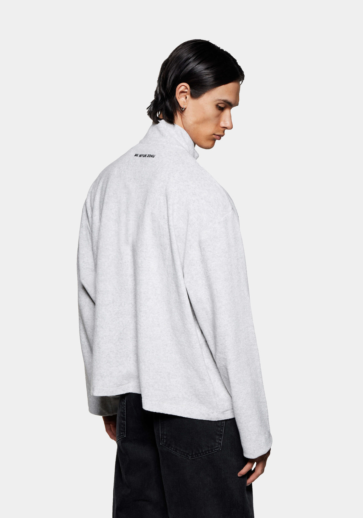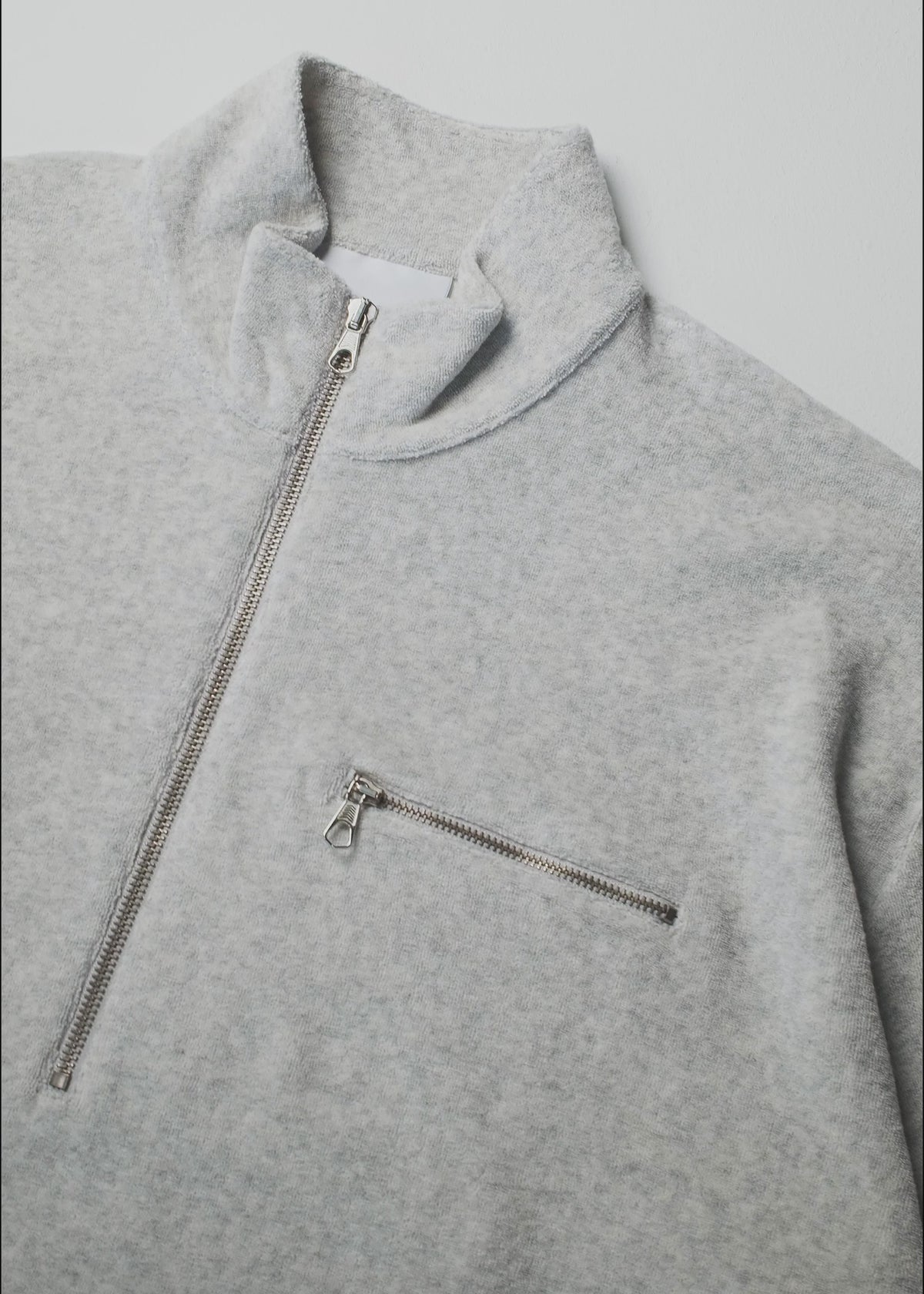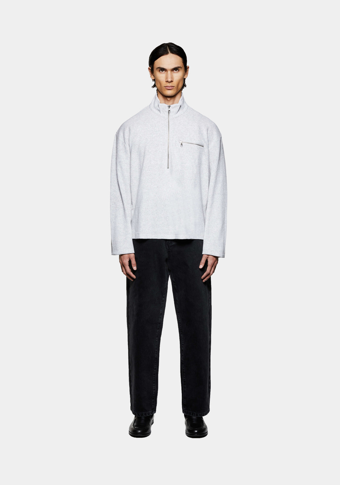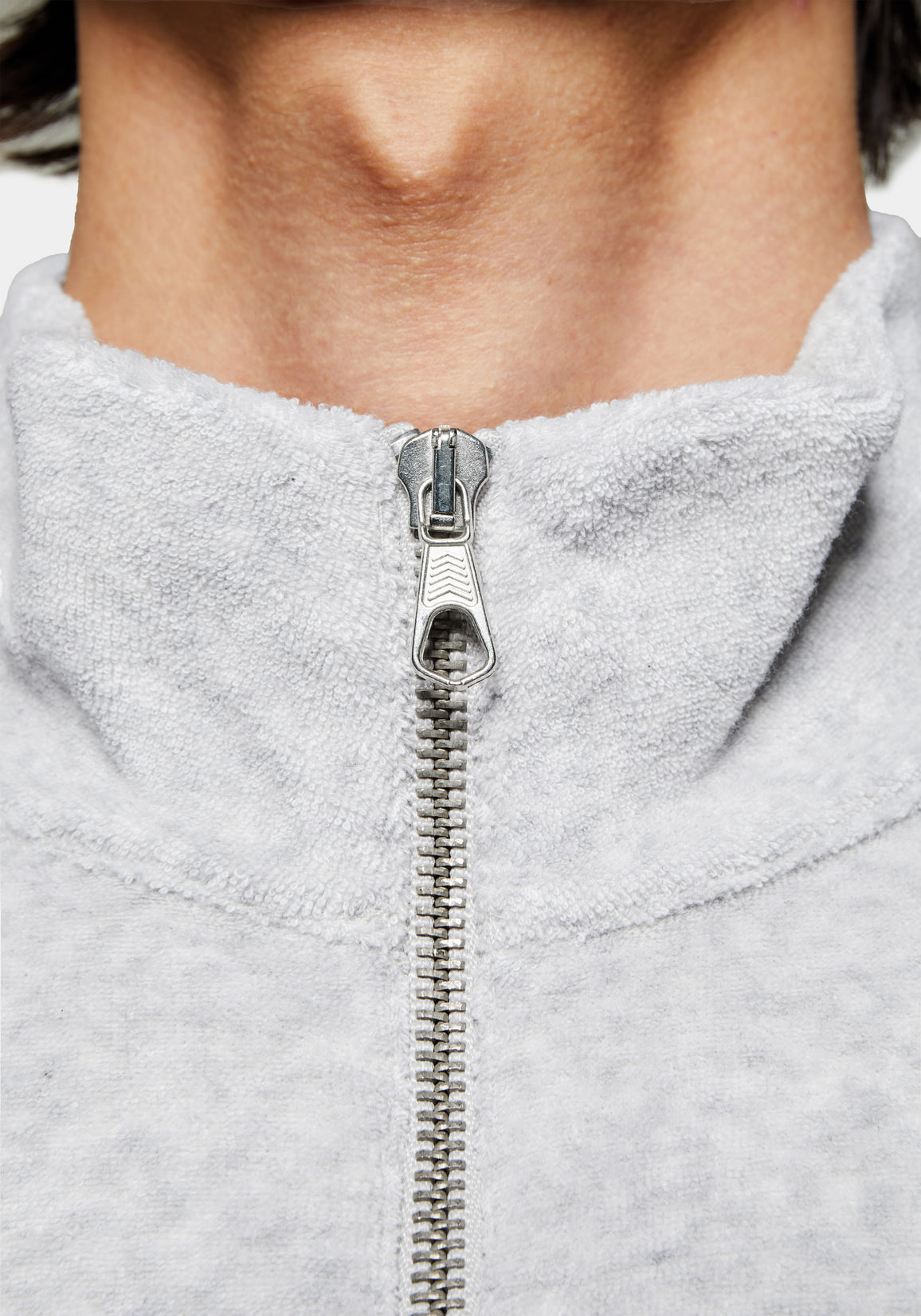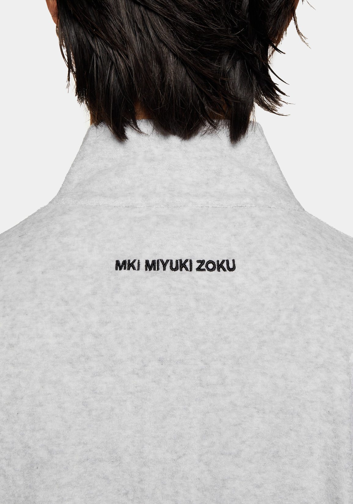 MKI TOWELLING QUARTER ZIP IN ASH. A NEW ADDITION TO MKI’S ENGINEERED JERSEY PROGRAMME, THE TOWELLING COLLECTION REIMAGINES THE SIGNATURE 220 GSM SLUB SILHOUETTE IN A TEXTURED LOOPBACK KNIT. CRAFTED FROM MELANGE STRETCH JERSEY, IT OFFERS A SOFT, TACTILE HANDLE AND A RELAXED DRAPE THAT MOVES EFFORTLESSLY WITH THE BODY.