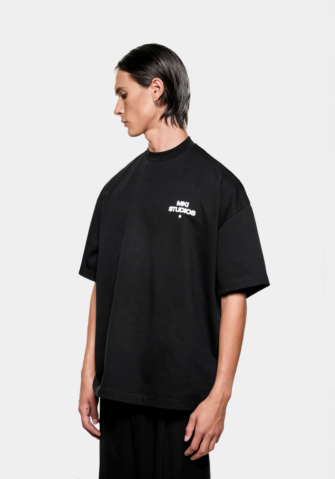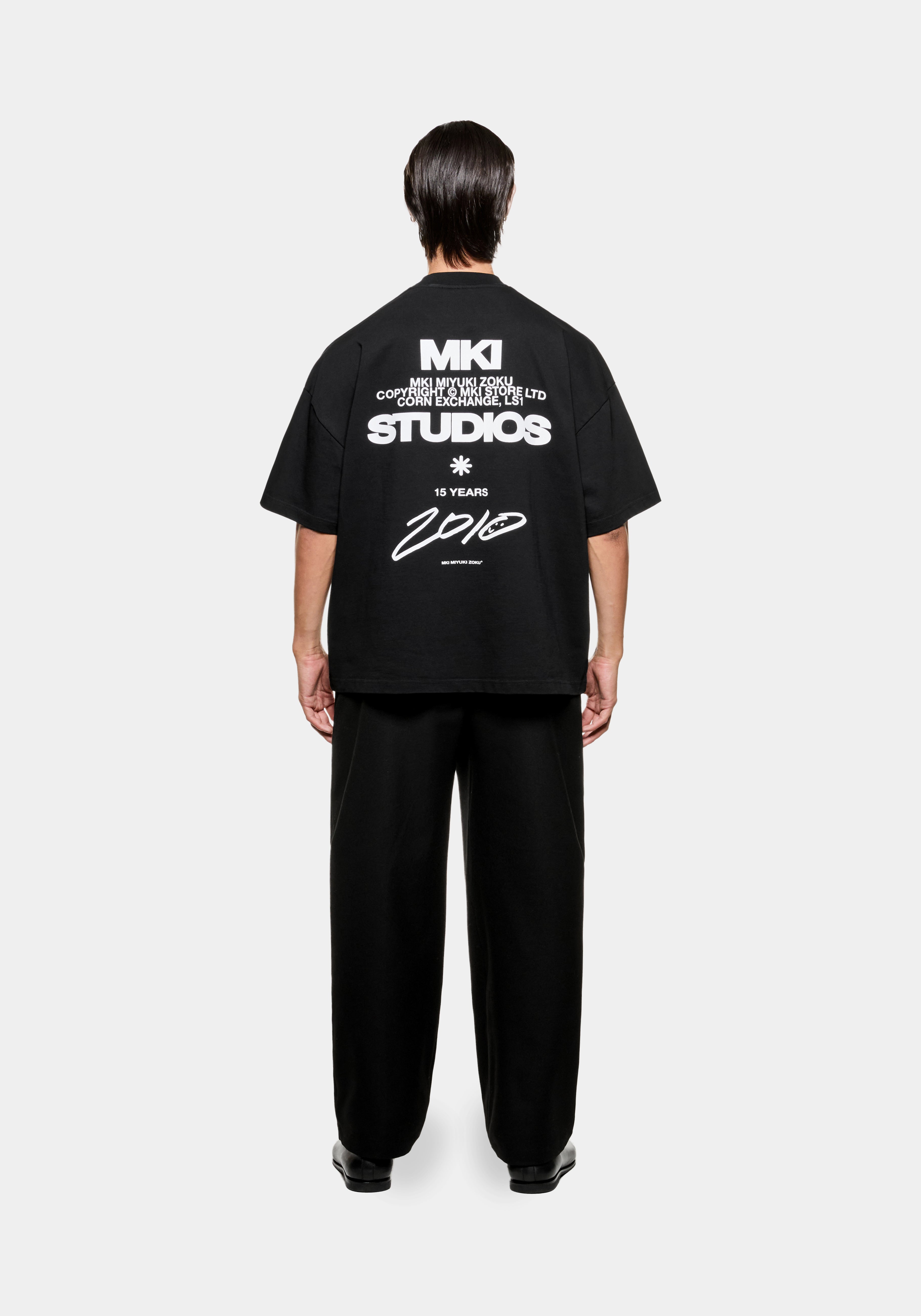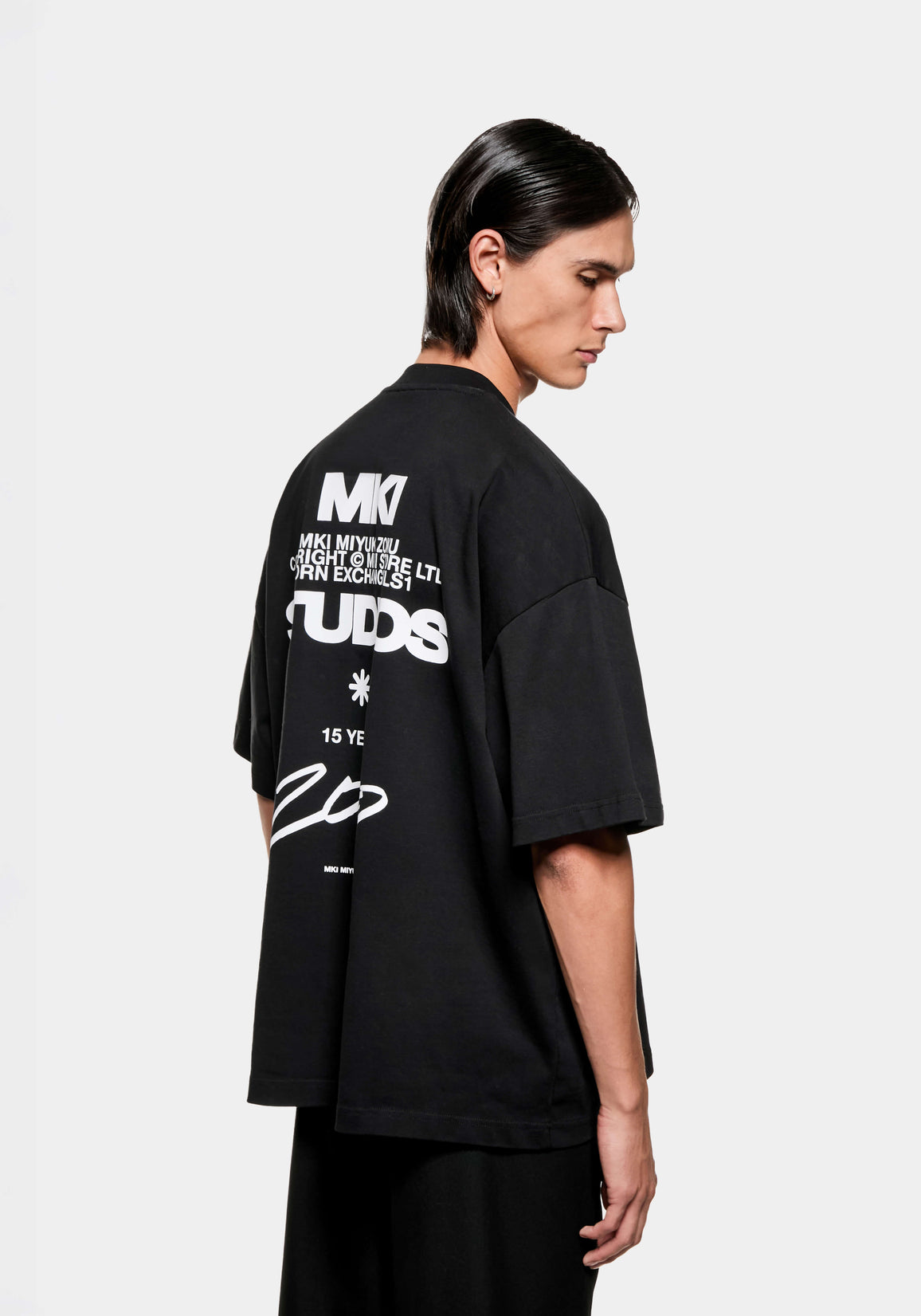 MKI 15 YEARS T-SHIRT IN BLACK. THE MKI 15 YEARS T-SHIRT CELEBRATES 15 YEARS OF ACCESSIBLE, CONTEMPORARY MENSWEAR THROUGH BOLD GRAPHICS, SCREEN-PRINTED ON 300GSM COTTON JERSEY. AVAILABLE IN MKI’S SIGNATURE, OVERSIZED BOX FIT, THE HEAVYWEIGHT T-SHIRT FEATURES DROPPED SHOULDERS AND A CLOSE-FITTING NECKLINE.