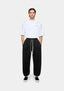 THE MODEL IS 6FT, HAS A 29' WAIST, CHEST MEASURING 37', AND WEARS A SIZE LARGE. THE MODEL IS ALSO WEARING MKI UNIFORM LONGSLEEVE T-SHIRT IN WHITE.
