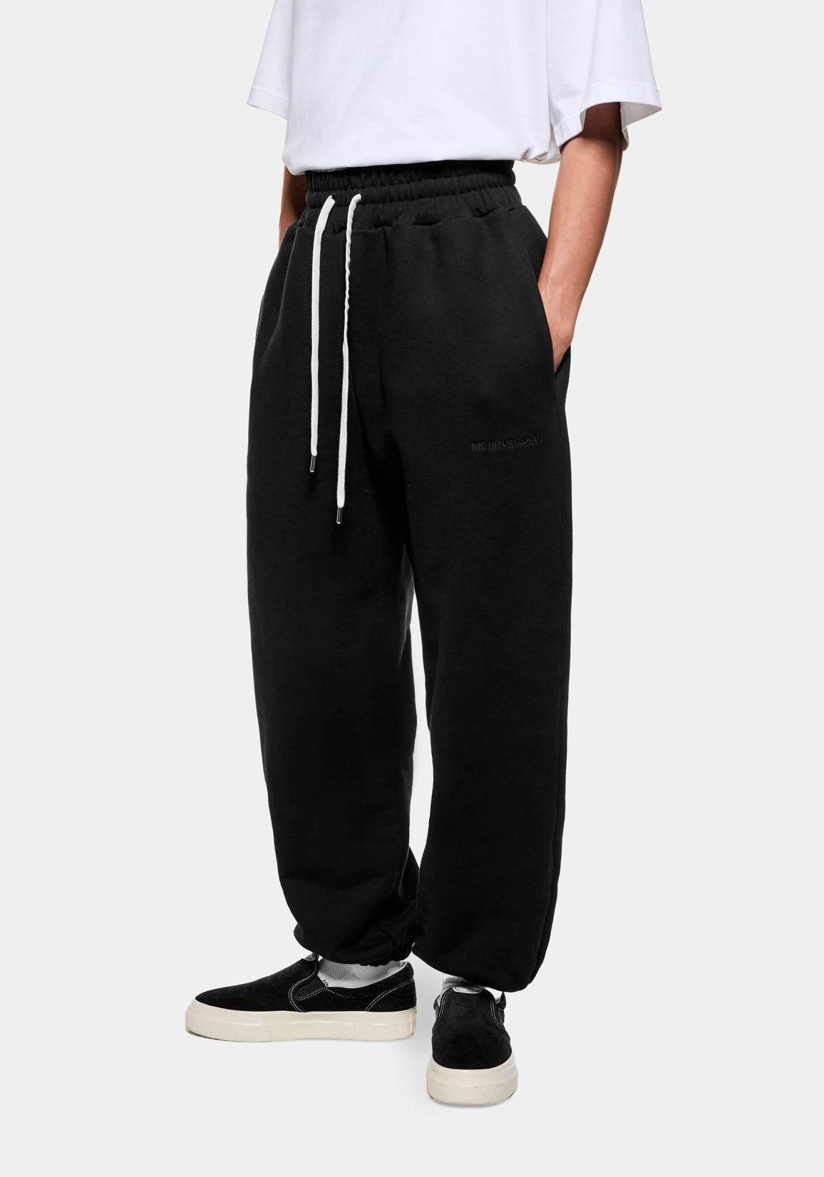 MKI 800 GSM SUPERWEIGHT CUFFED JOGGERS IN BLACK. THE MKI SUPERWEIGHT CUFFED JOGGERS ARE CRAFTED FROM SUPER HEAVYWEIGHT, 800GSM COTTON JERSEY, DELIVERING MAXIMUM COMFORT AND A CONSIDERED LOOSE FIT. THE BLACK COLOURWAY EXTENDS TO THE TONAL LOGO EMBROIDERY, CONTRASTING AGAINST THE WHITE, METAL TIPPED DRAWSTRINGS. DETAILS INCLUDE THE ELASTICATED HEM AND CUFFS, ALONGSIDE TWIN SIDE POCKETS AND TWO PATCH POCKETS AT THE REAR.