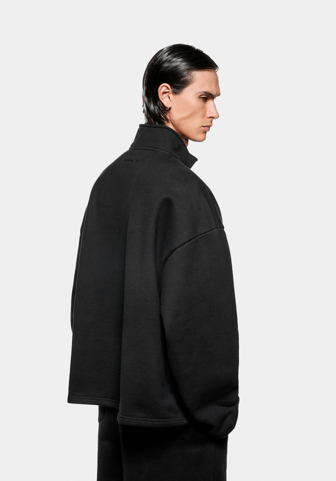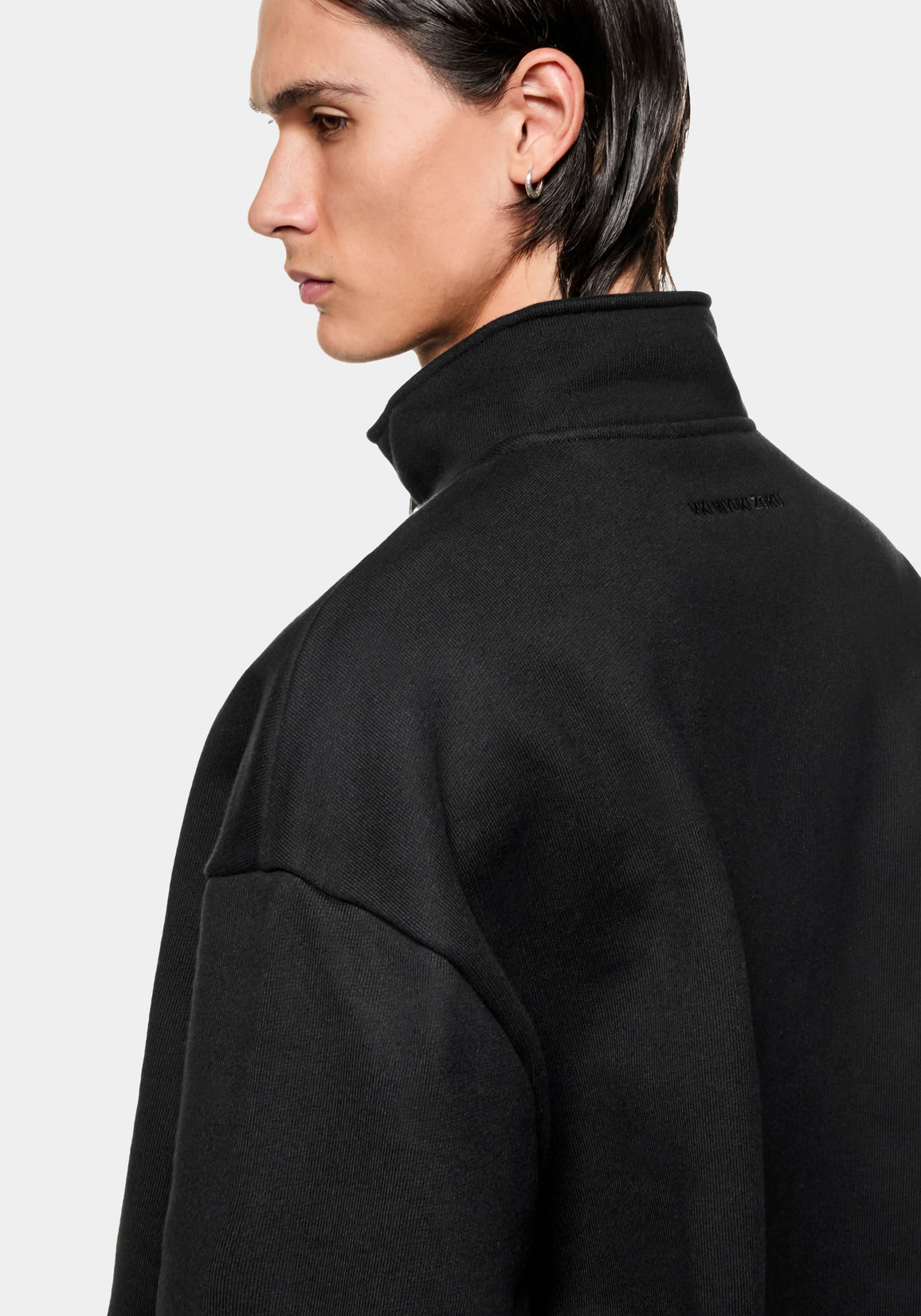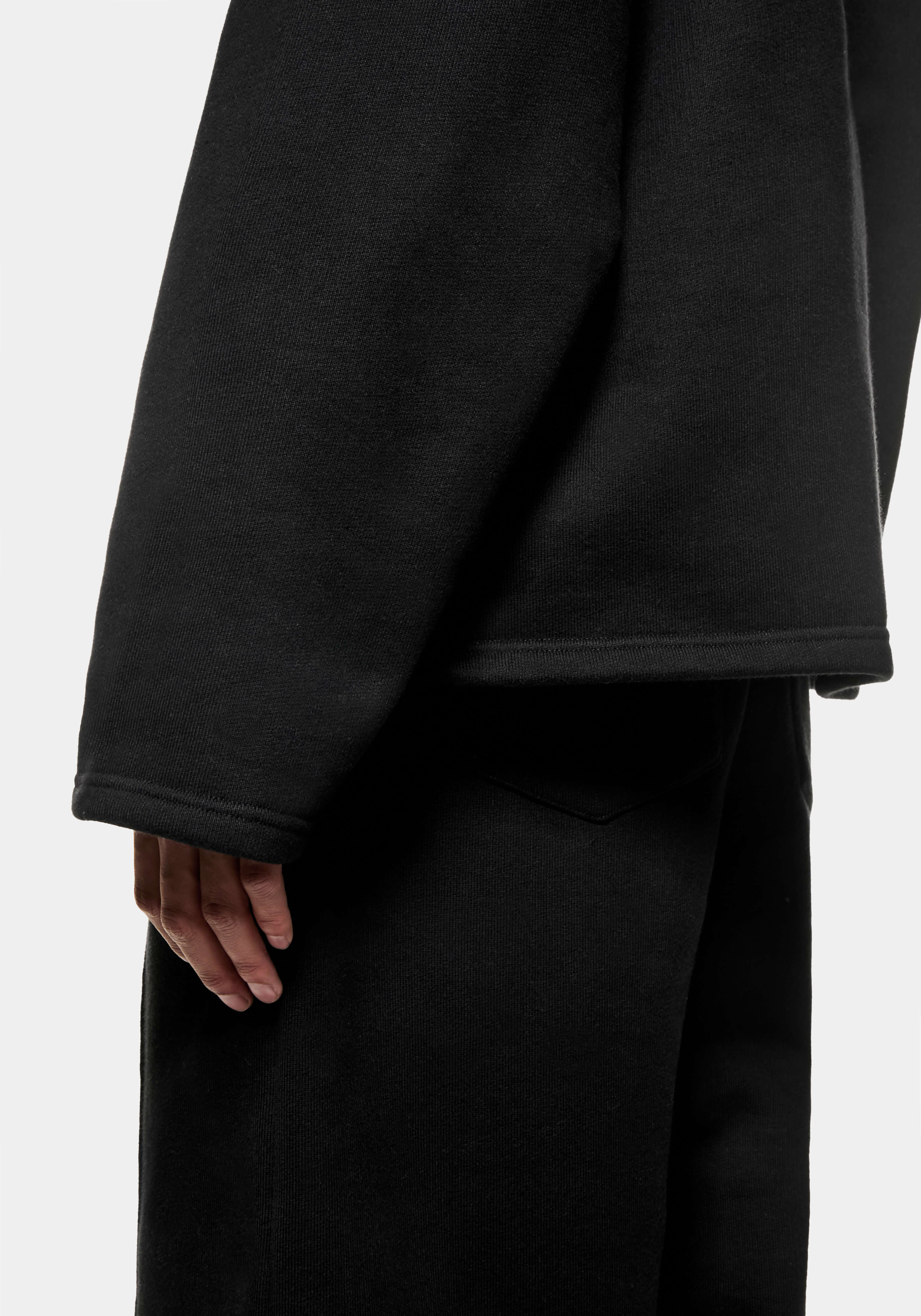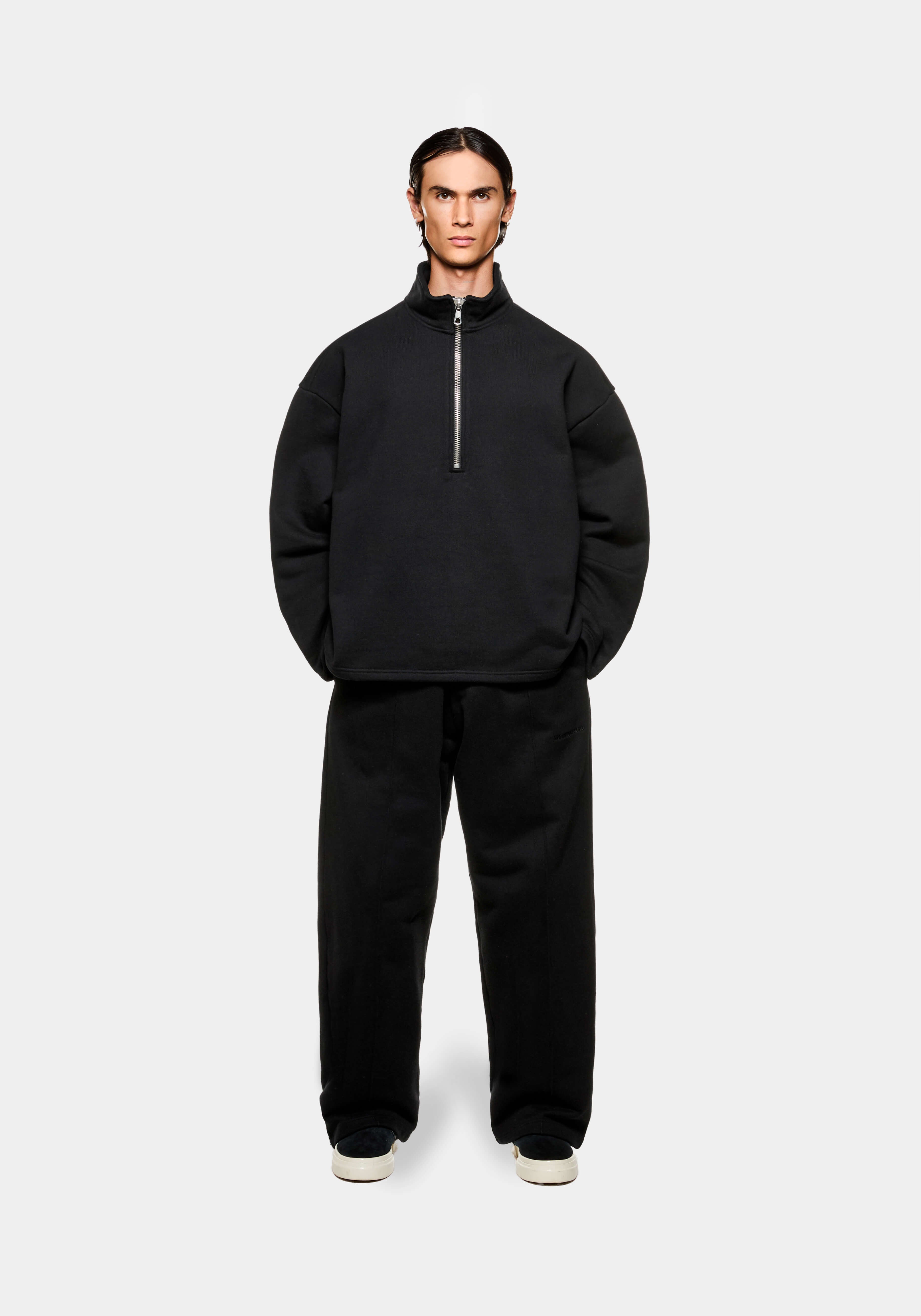 MKI 800 GSM SUPERWEIGHT QUARTER ZIP IN BLACK. THE HEAVIEST JERSEY MKI HAS TO OFFER RETURNS FOR FW25 IN A NEW QUARTER ZIP STYLE. DESIGNED TO RETAIN ITS SHAPE THROUGHOUT A LIFETIME OF WEAR, THE 100% COTTON LOOPBACK FABRIC LENDS TO THE OVERSIZED, YET CONSIDERED DRAPE – ACHIEVED THROUGH THE OPEN HEM AND CUFFS AND ADJUSTABLE, #8 METAL ZIP FRONT. PRESENTED IN BLACK, THE SUPERWEIGHT QUARTER ZIP SWEATSHIRT IS SIGNED OFF WITH TONAL MKI EMBROIDERY AT THE REAR NECKLINE.