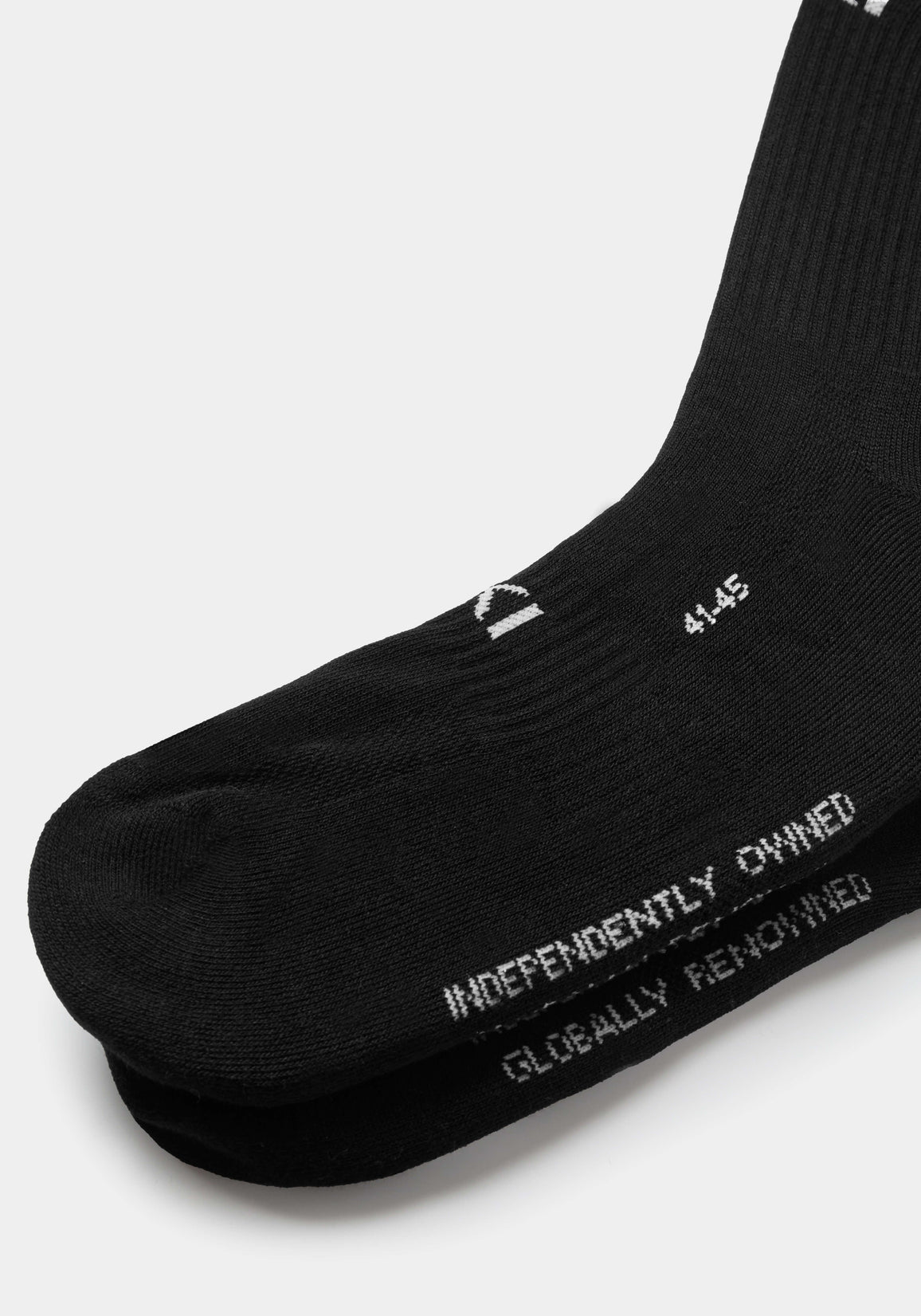 MKI CLASSIC SOCKS IN BLACK. A CONSTANT IN THE MKI ACCESSORIES COLLECTION, THE MKI CLASSIC SOCKS ARE CRAFTED FROM A COMBED COTTON/ NYLON BLEND, DESIGNED WITH COMFORT AND DURABILITY IN MIND. CLASSIC MKI BRANDING IS APPLIED TO THE SHAFT AND FOREFOOT, WHILE MKI’S MOTTO OF “INDEPENDENTLY OWNED, GLOBALLY RENOWNED" FEATURES ON THE BASE.