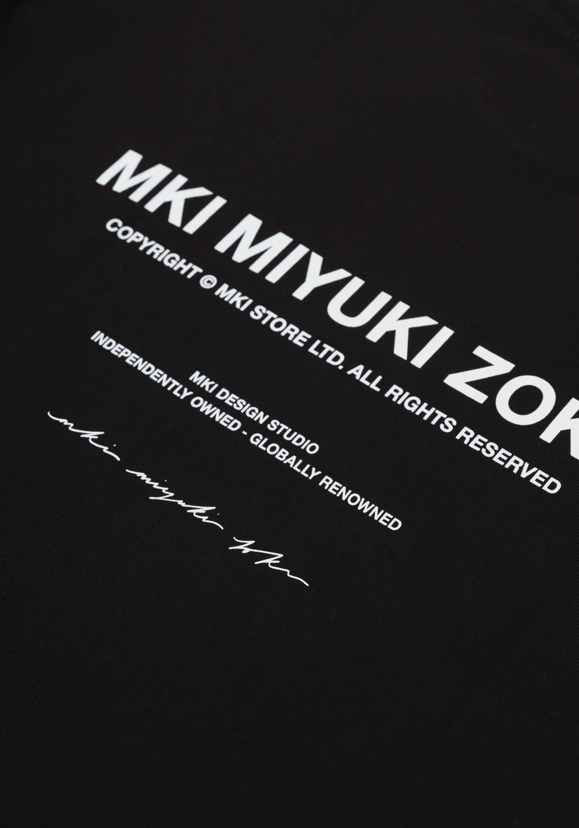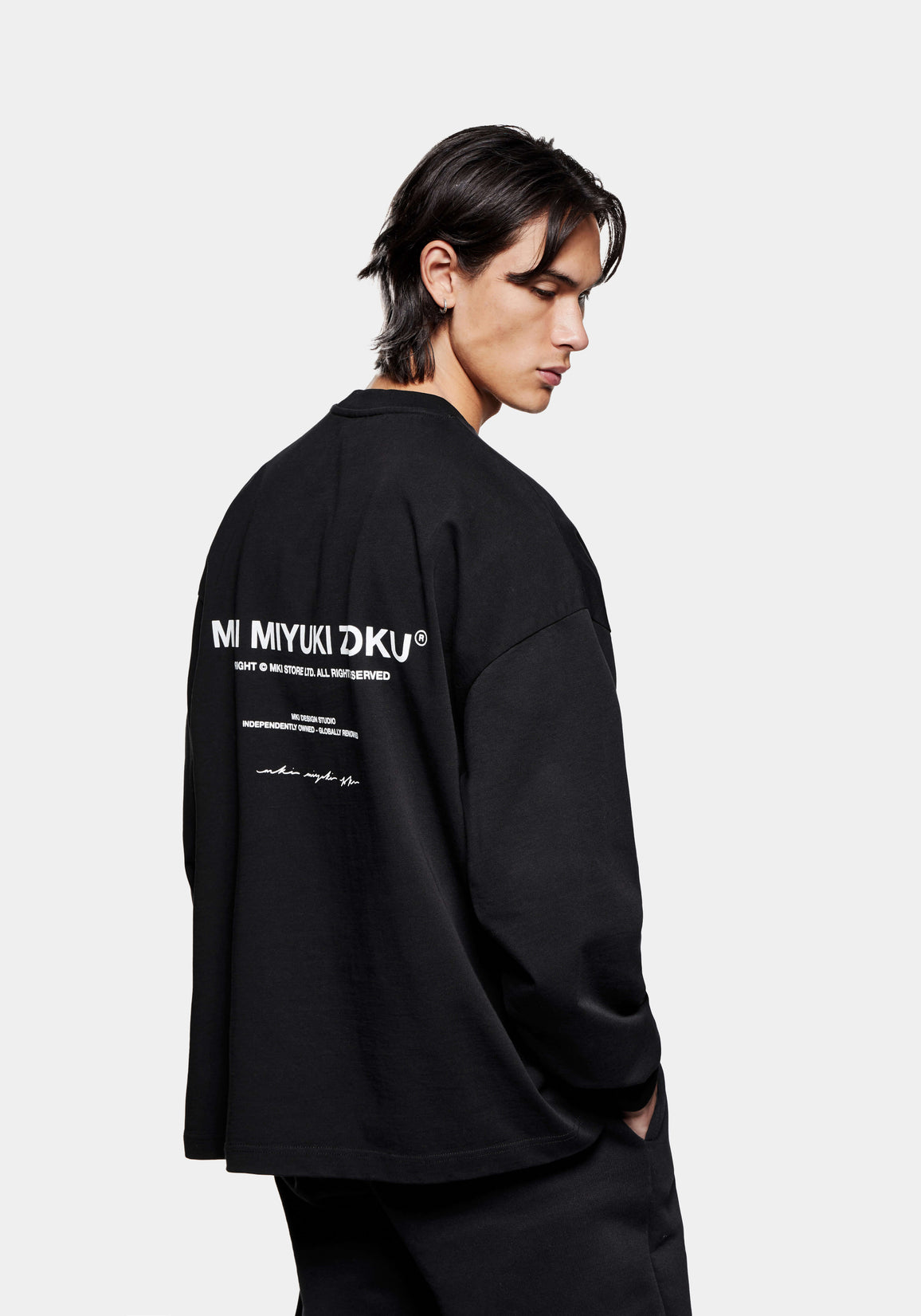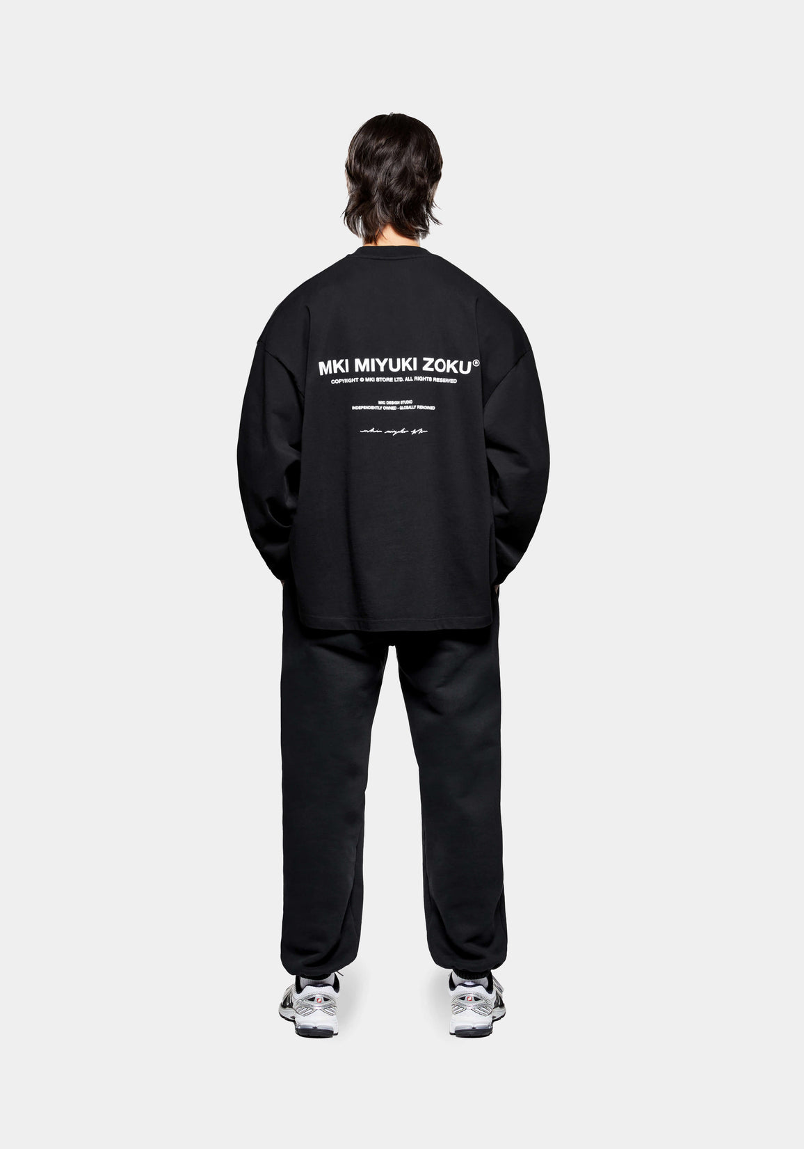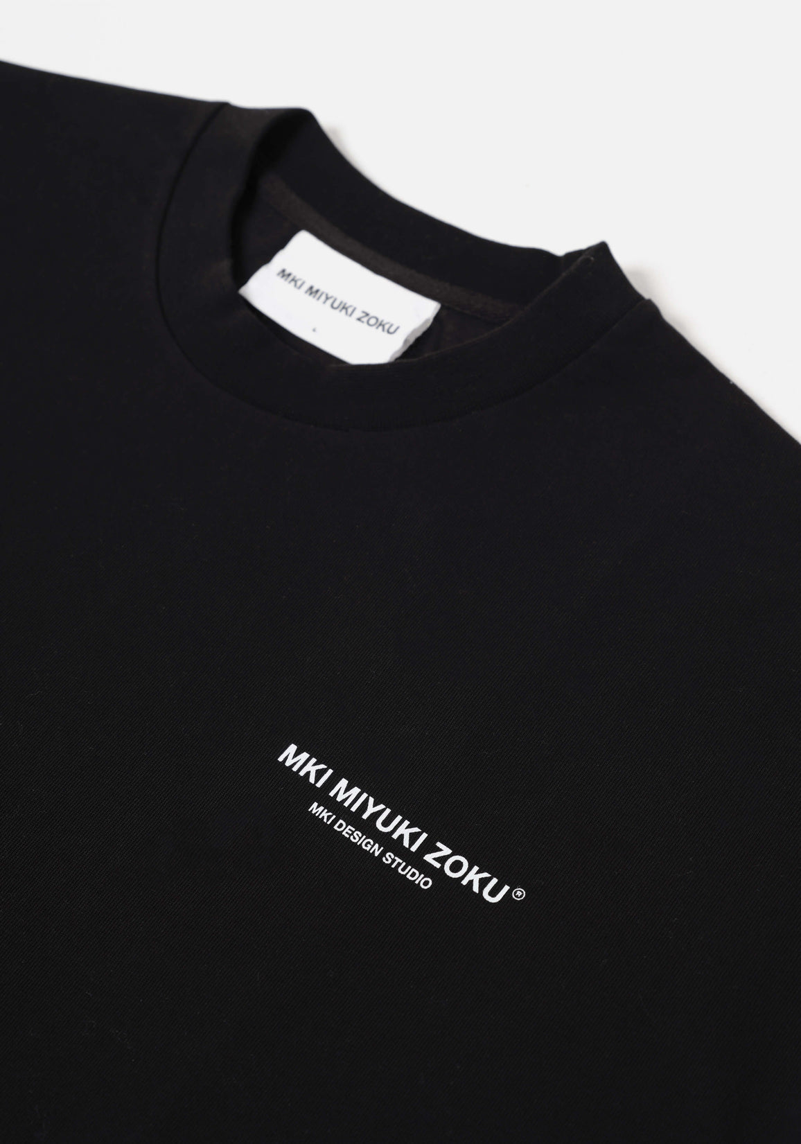 MKI DESIGN STUDIO LONGSLEEVE T-SHIRT IN BLACK. THE LONGSLEEVE VERSION OF MKI’S STAPLE DESIGN STUDIO T-SHIRT IS PRESENTED IN A MONOCHROMATIC COLOUR PALETTE, COMPRISING WHITE GRAPHICS SCREEN-PRINTED ON A BLACK, HEAVYWEIGHT COTTON BASE. THE 300GSM JERSEY T-SHIRT IS PRESENTED IN MKI’S SIGNATURE OVERSIZED BOX FIT, FEATURING DROPPED SHOULDERS AND A CLOSE-FITTING NECKLINE.