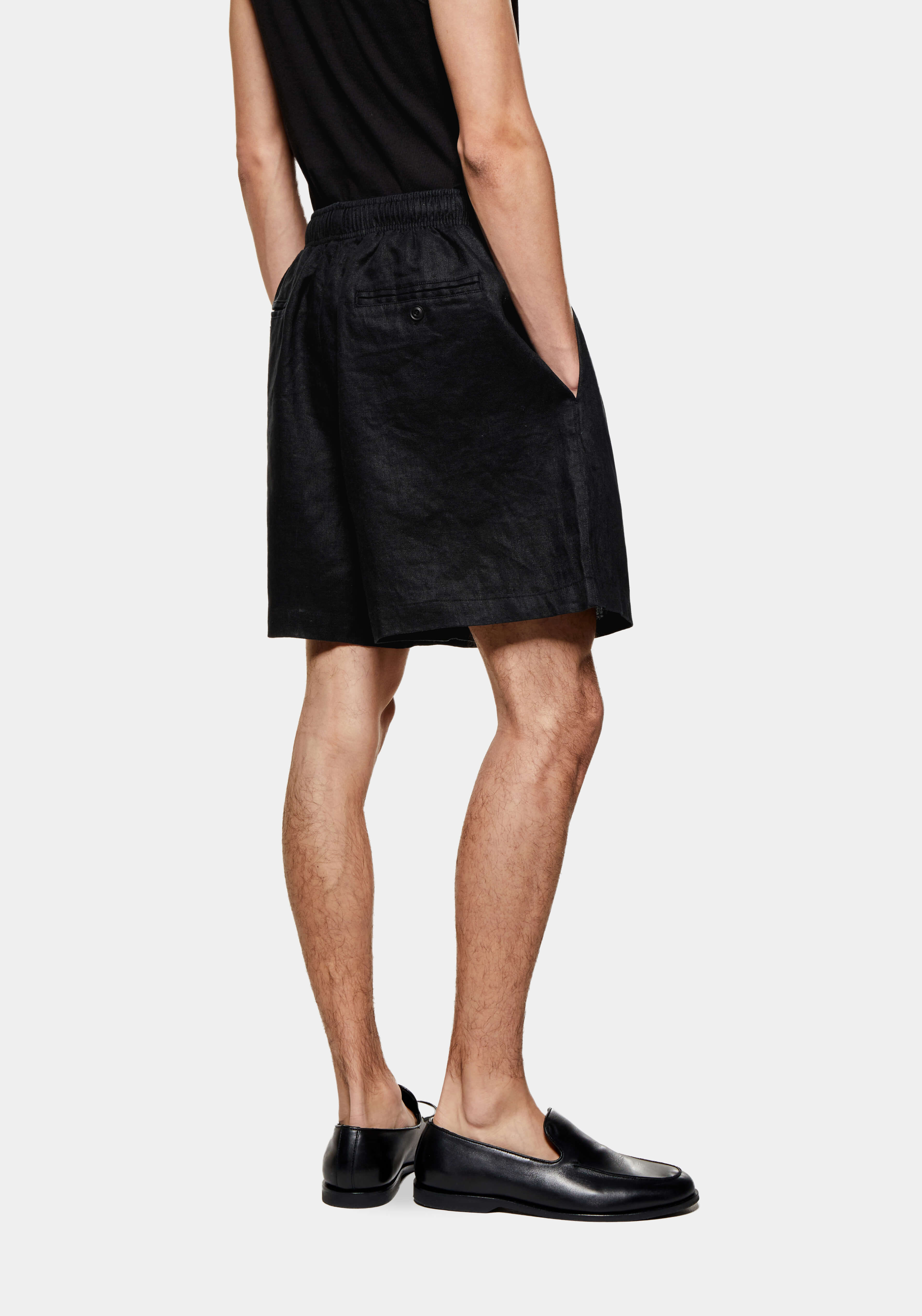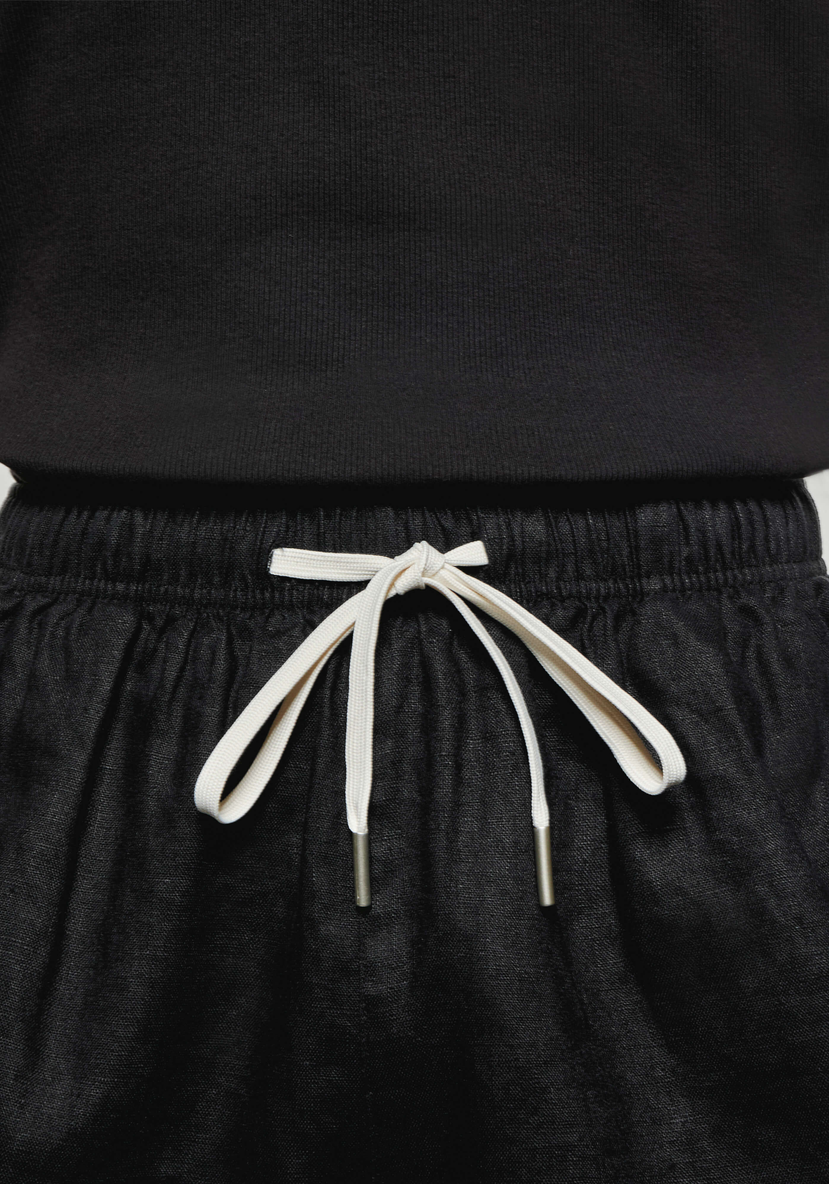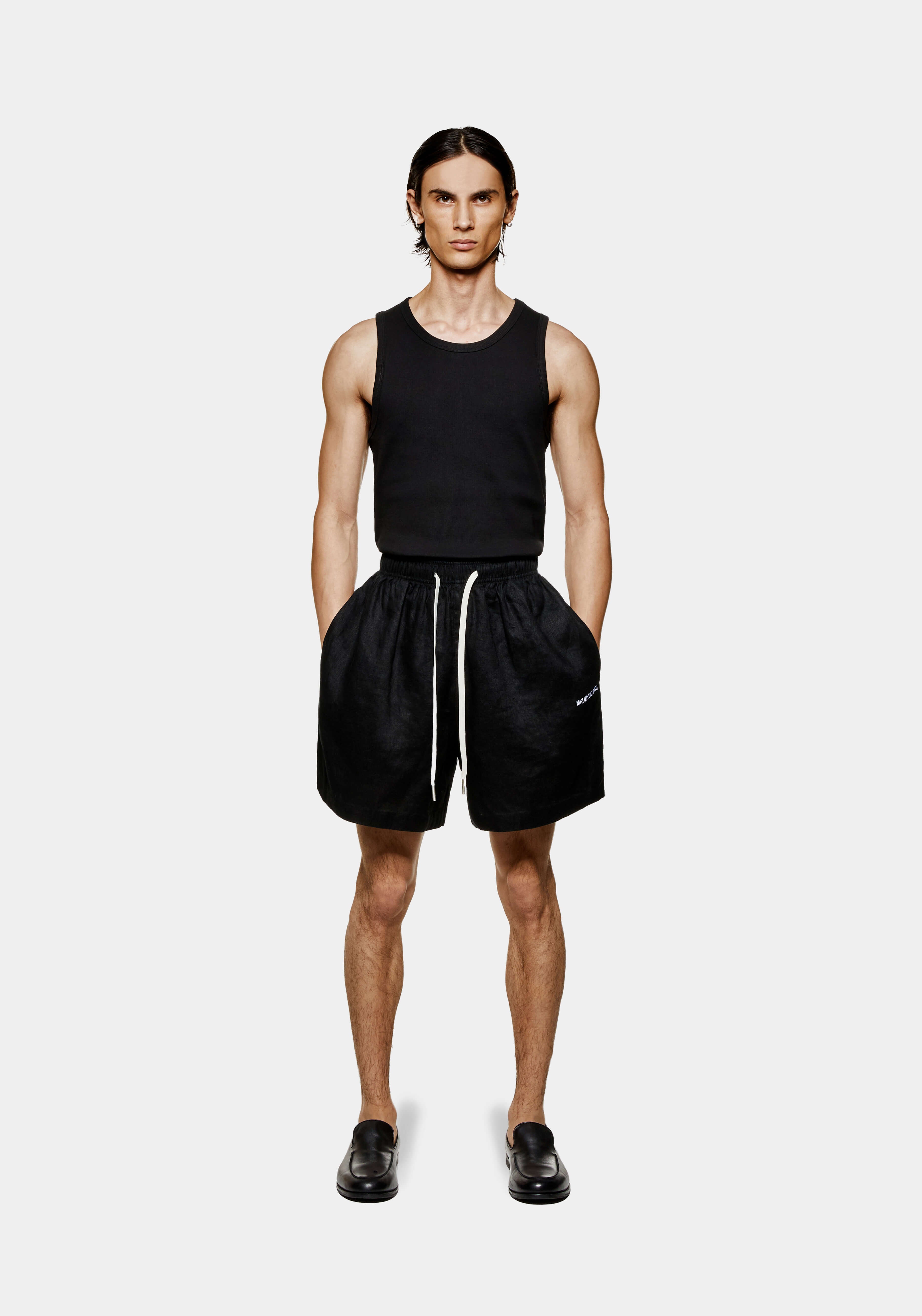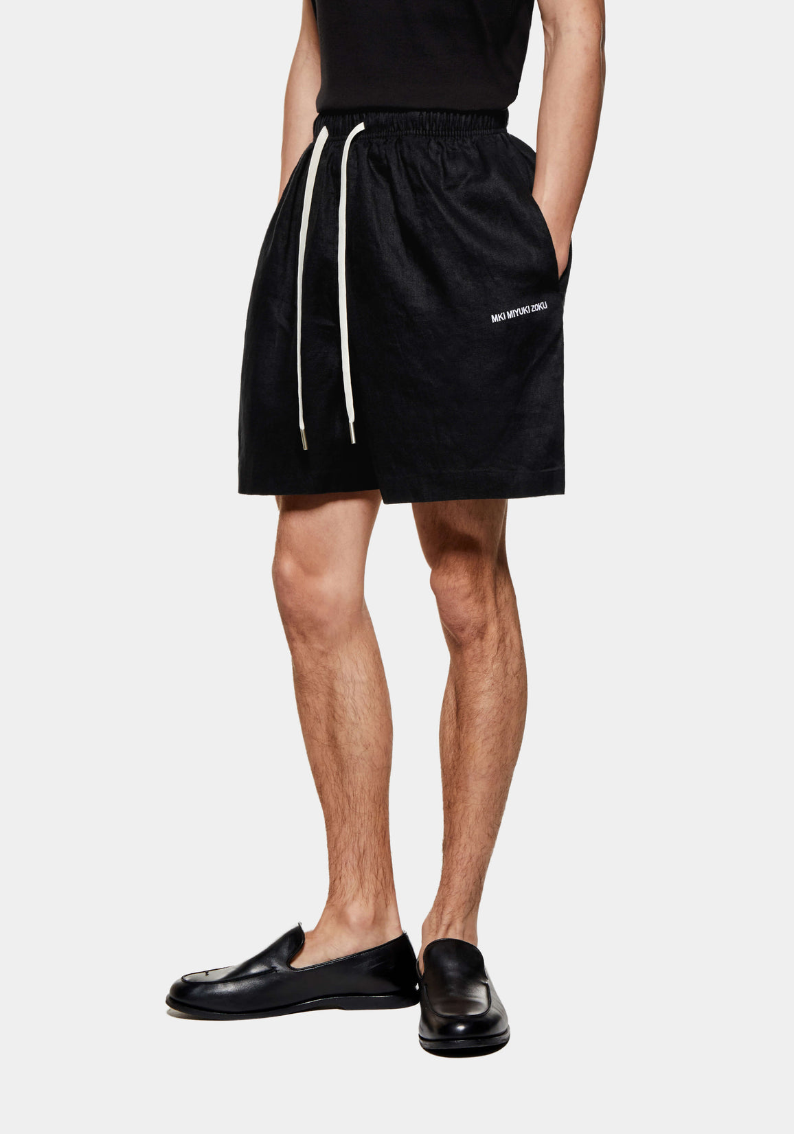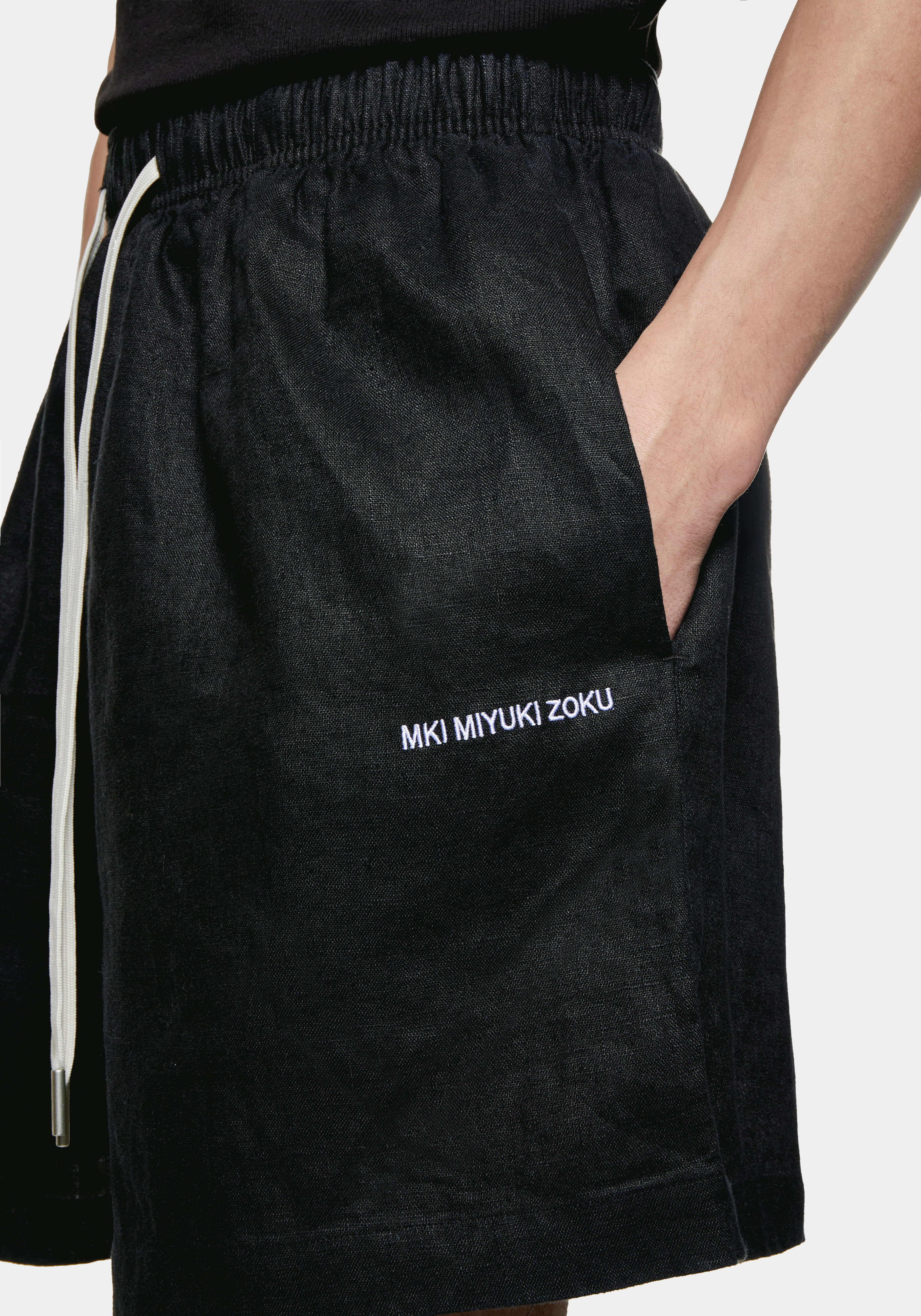 MKI LINEN SHORTS IN BLACK. THE MKI SHORTS ARE MADE FROM BREATHABLE LINEN AND FEATURE A COMFORTABLE ELASTICATED WAISTBAND WITH DRAWSTRINGS. THESE SHORTS OFFER A WIDE, RELAXED FIT, MAKING THEM PERFECT FOR SUMMER DAYS.