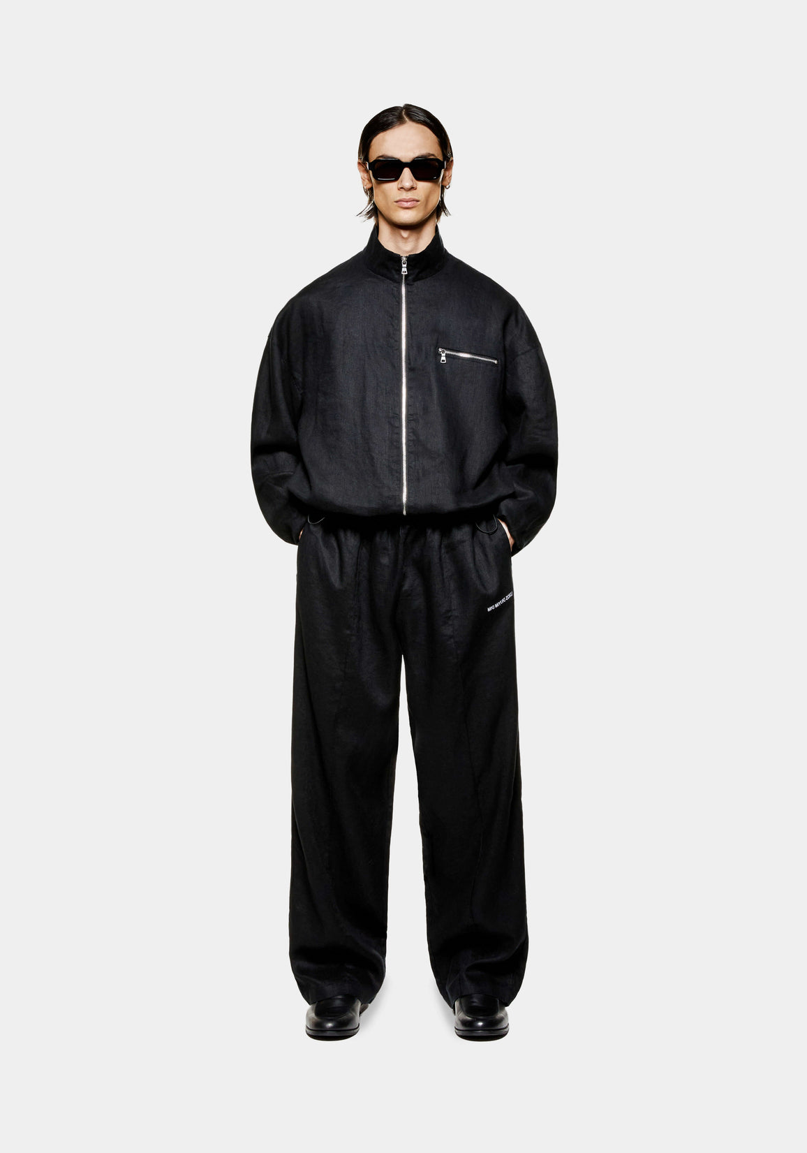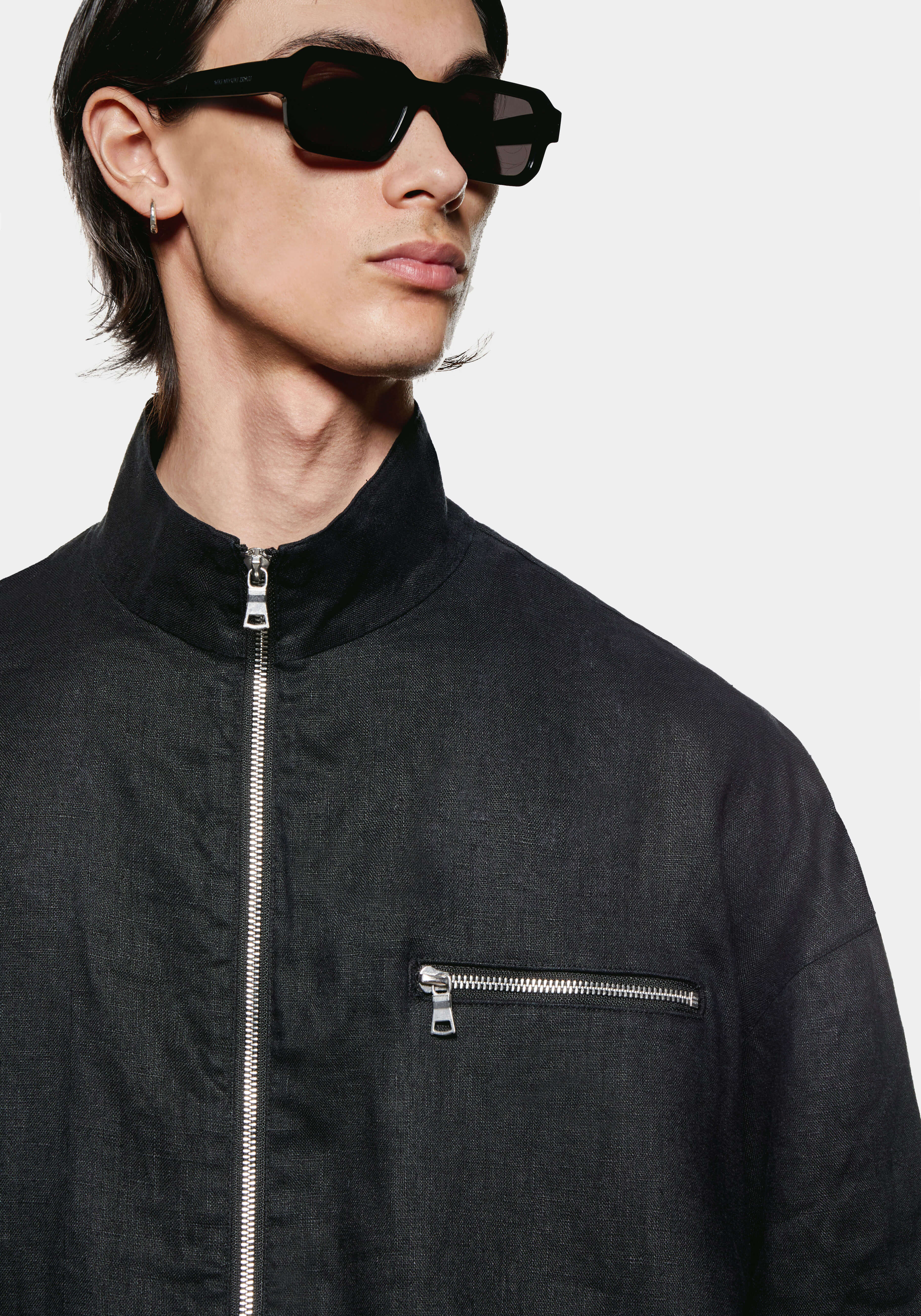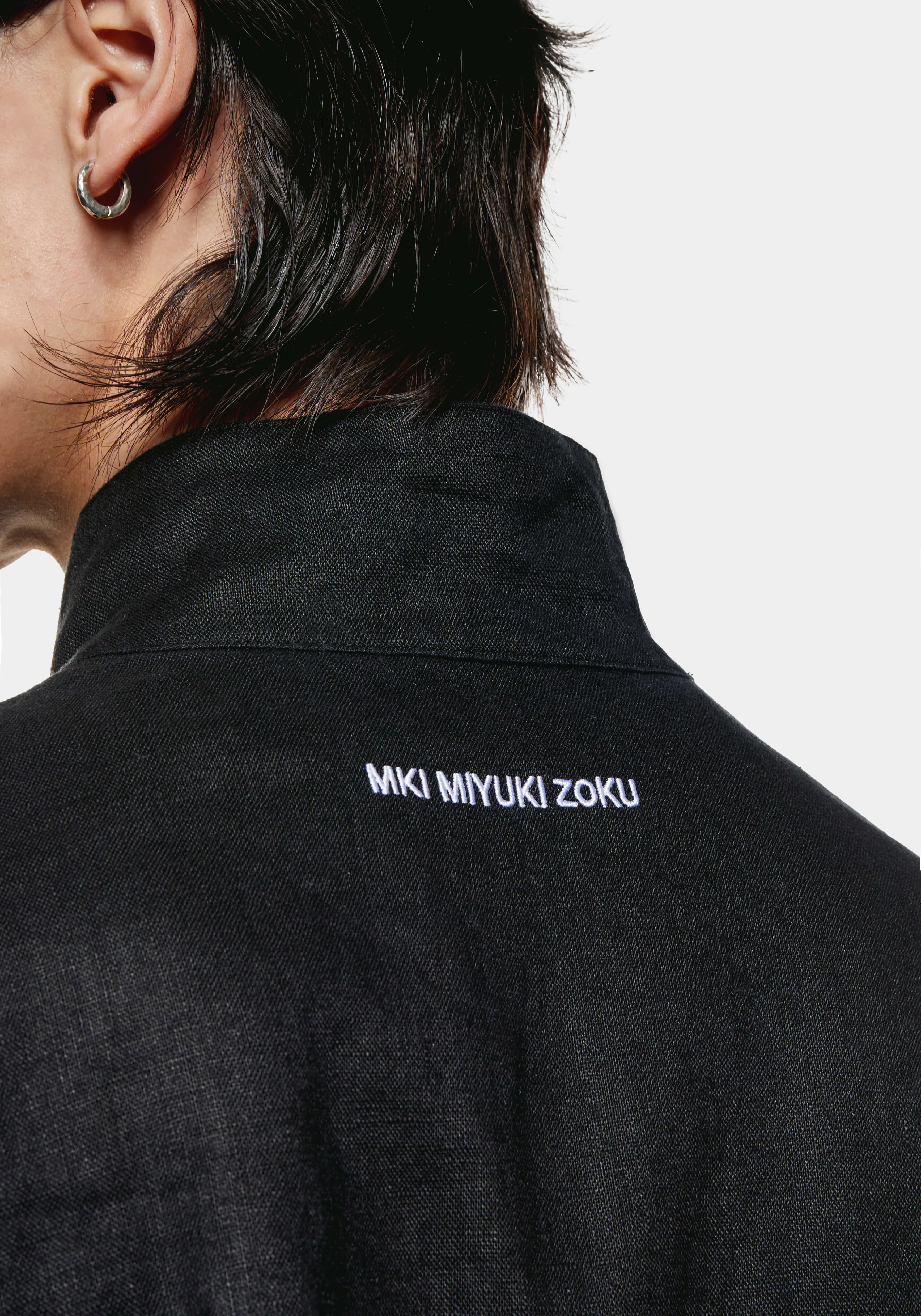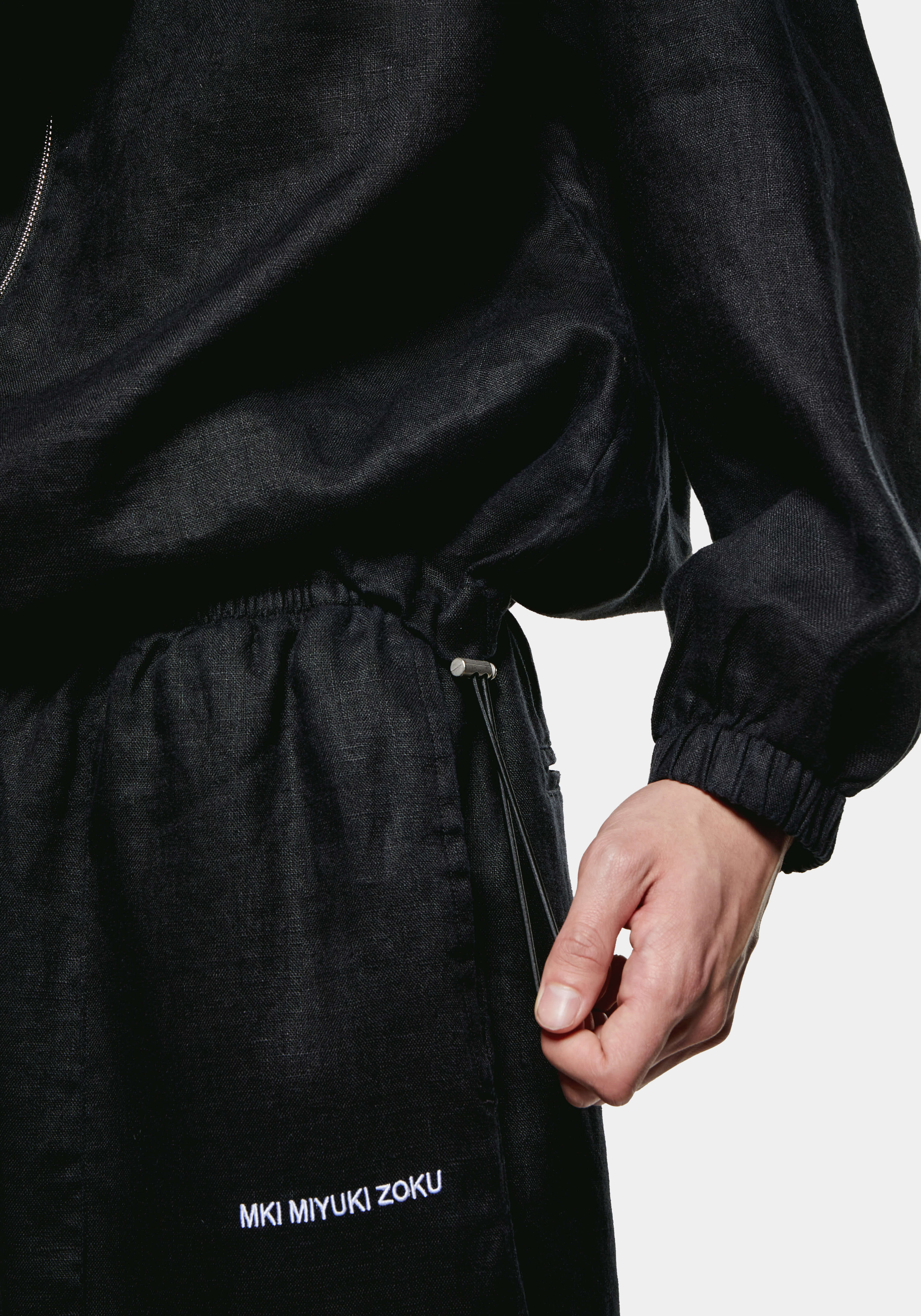 MKI LINEN TRACK JACKET IN BLACK. THE LINEN COLLECTION FEATURES A TEXTURED WEAVE HIGHLIGHTING THE NATURAL APPEARANCE OF THE FABRIC. FINISHED WITH SILVER METAL HARDWARE, THIS PIECE IS BREATHABLE AND LIGHTWEIGHT WITH A SOFT HAND FEEL. THE MIDWEIGHT LINEN GIVES THE PERFECT STRUCTURE AND DRAPE.