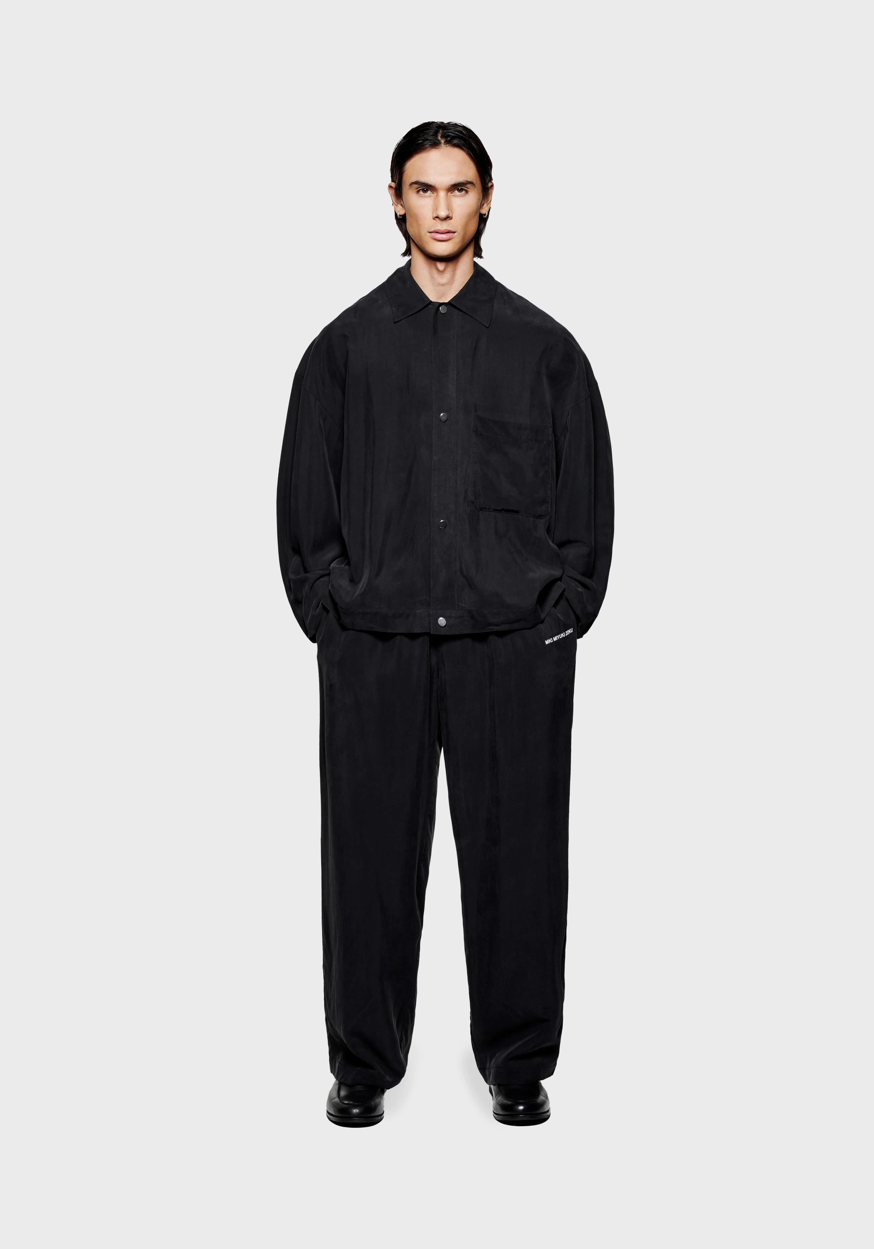 MKI SANDWASH CUPRO TRUCKER JACKET IN BLACK. THE SS25 SANDWASH CUPRO COLLECTION INTRODUCES A LIGHTWEIGHT FABRIC WITH A SUEDE LIKE FINISH THAT PROVIDES A SOFT AND EFFORTLESS DRAPE. THE COLLECTION COMBINES MODERN STYLE WITH EVERYDAY COMFORT.