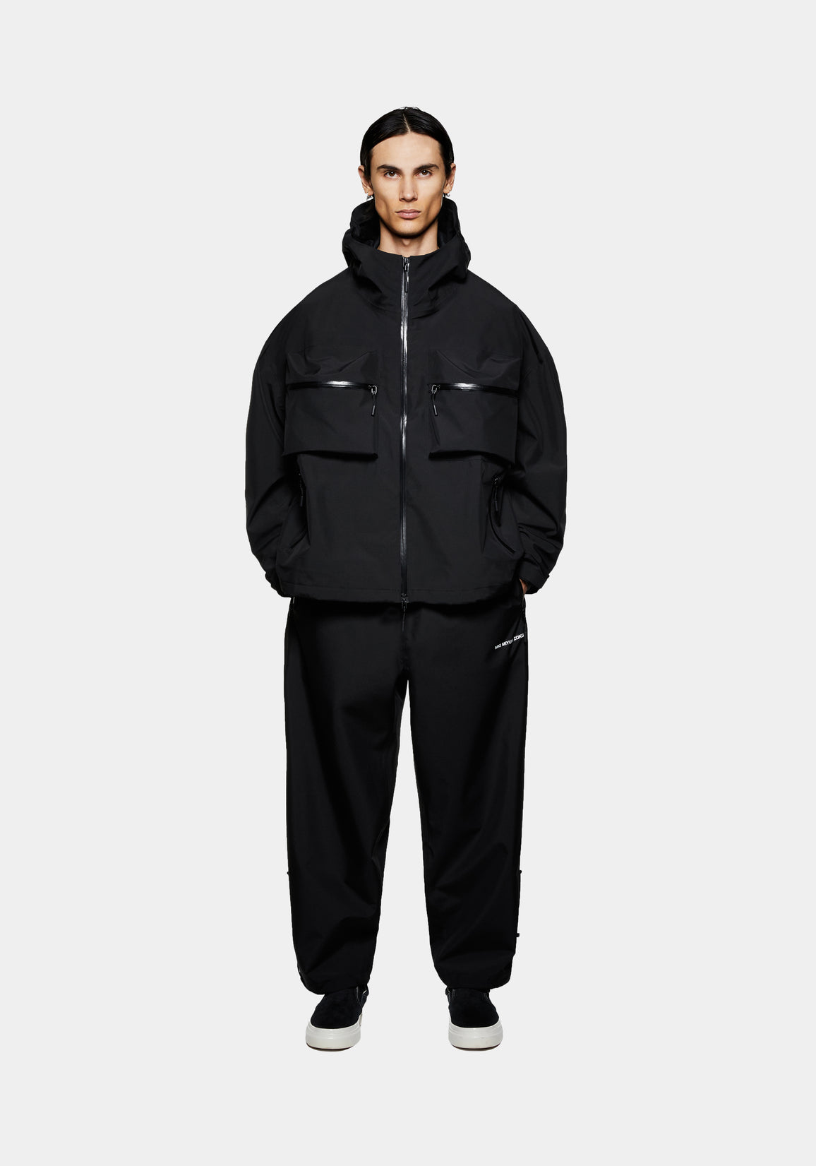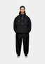 THE MODEL IS 6FT, HAS A 29' WAIST, CHEST MEASURING 37', AND WEARS A SIZE LARGE. THE MODEL IS ALSO WEARING MKI V3 SHELL TRACK PANTS IN BLACK.