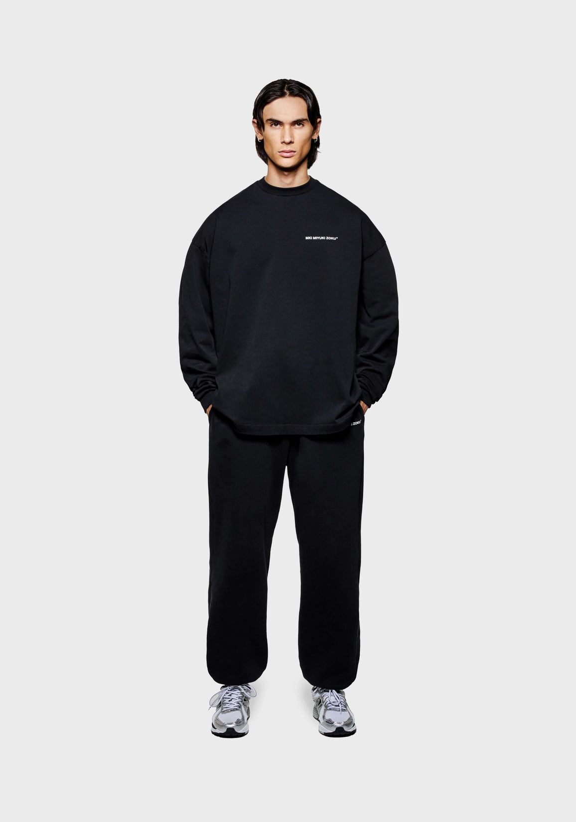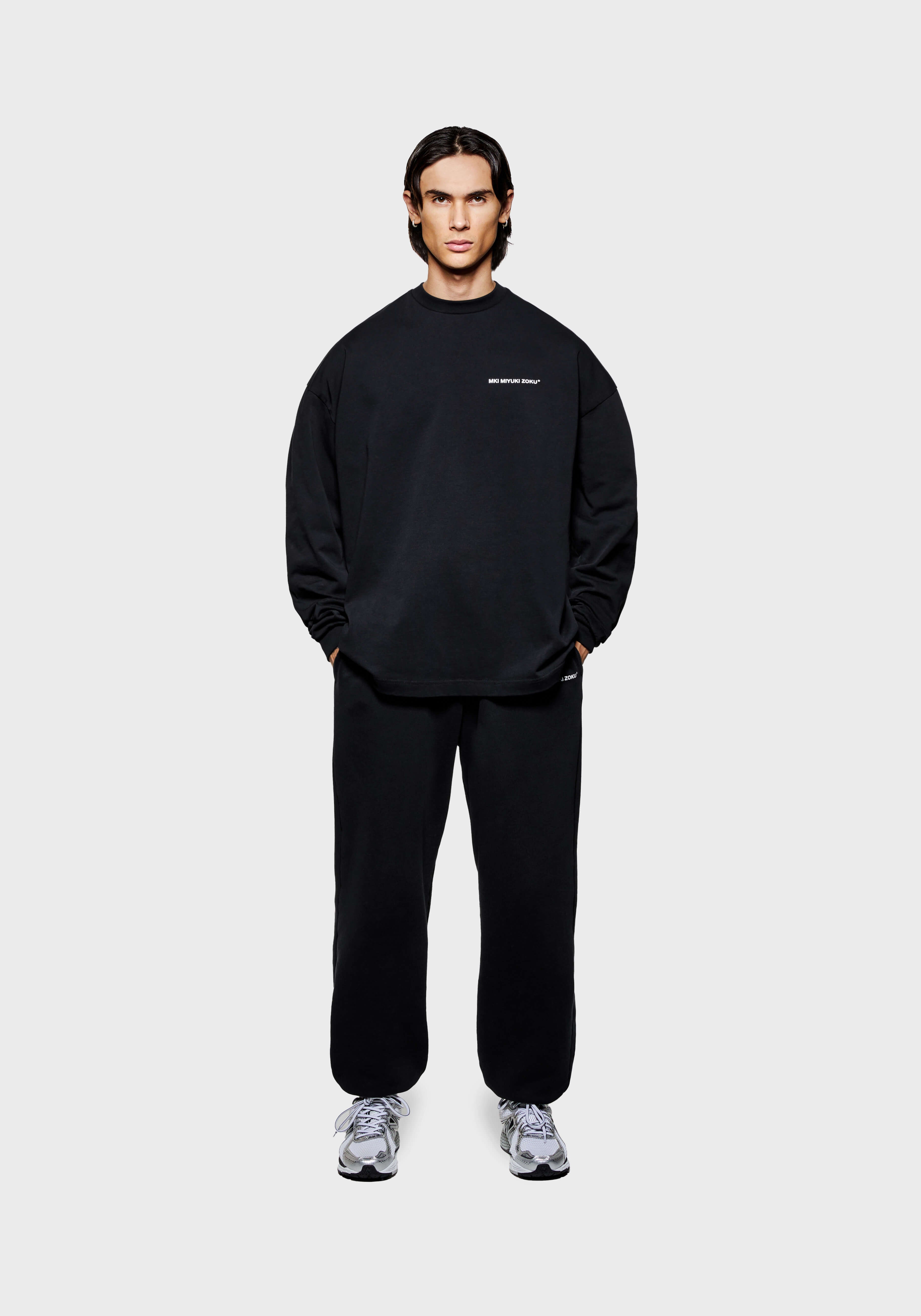 THE MODEL IS 6FT WITH A 38" CHEST AND 31" WAIST AND HAS BEEN STYLED IN A MEDIUM. WE RECOMMEND PURCHASING YOUR REGULAR SIZE, FOR THE DESIRED OVERSIZED FIT. THE MODEL IS ALSO WEARING MKI UNIFORM JOGGERS IN BLACK.