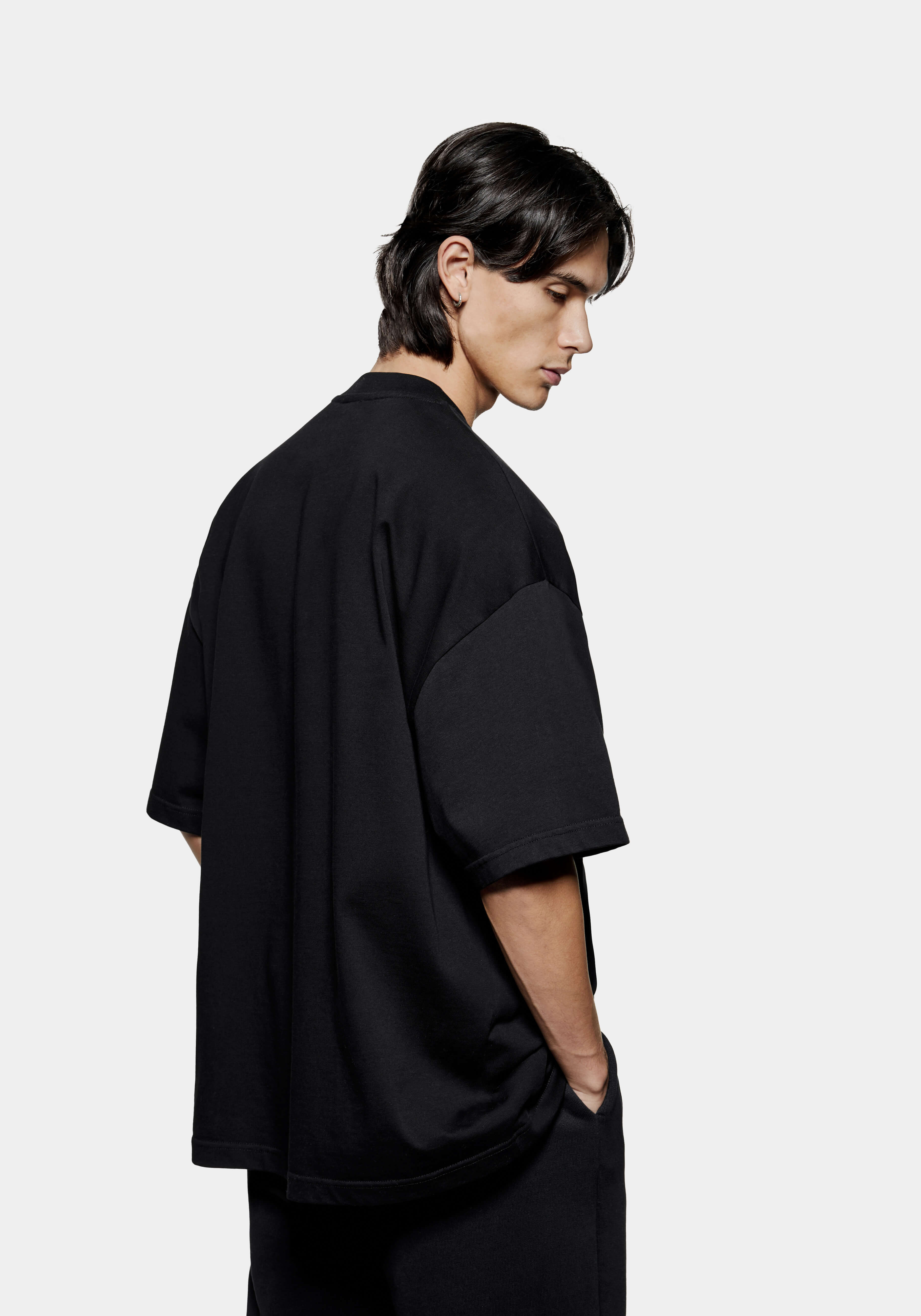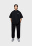 THE MODEL IS 6FT WITH A 38" CHEST AND 31" WAIST AND HAS BEEN STYLED IN A MEDIUM. WE RECOMMEND PURCHASING YOUR REGULAR SIZE, FOR THE DESIRED OVERSIZED FIT. THE MODEL IS ALSO WEARING MKI UNIFORM JOGGERS IN BLACK.