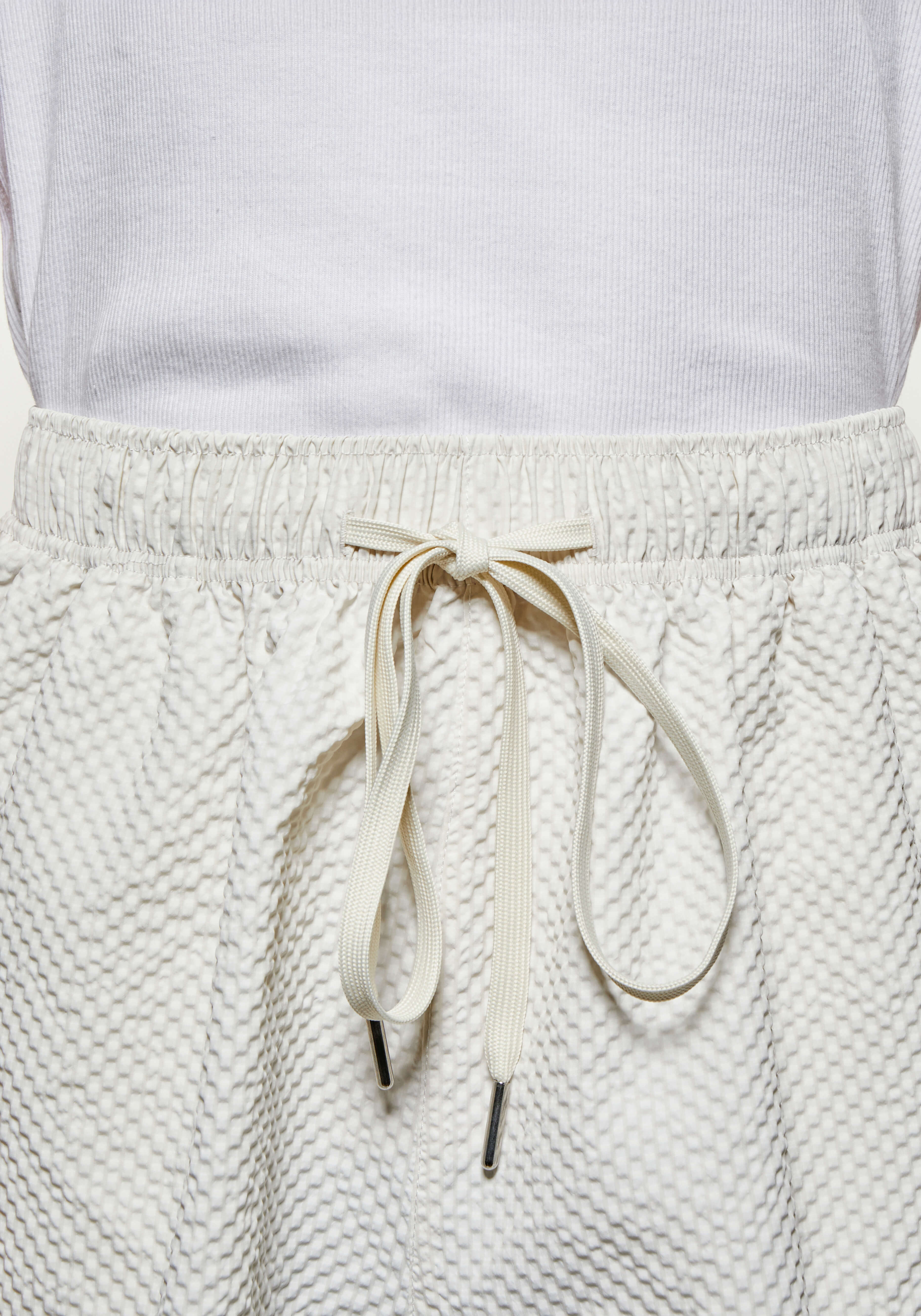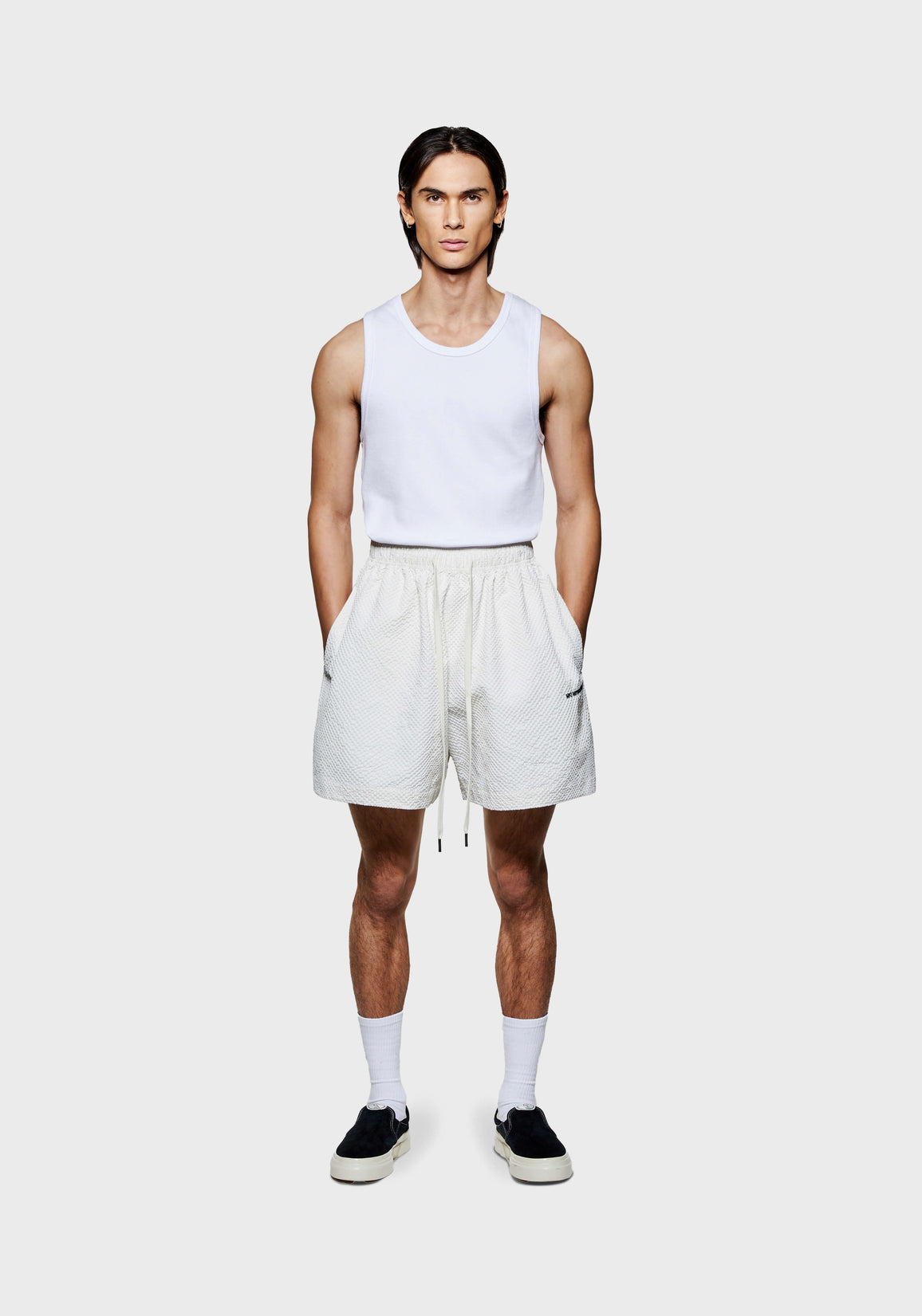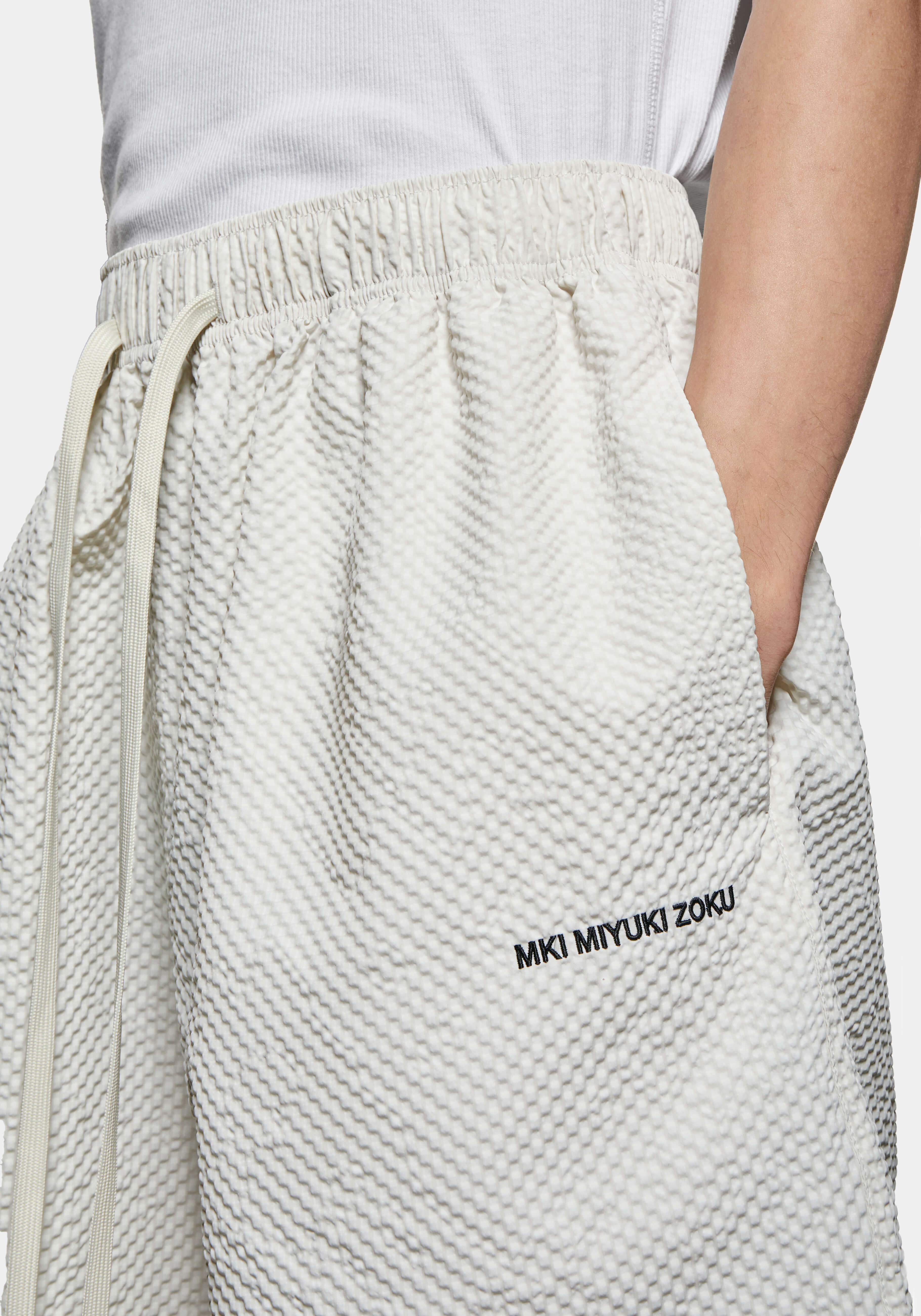 MKI SEERSUCKER SHORTS IN BONE. MADE FROM SEERSUCKER FABRIC, THESE SHORTS FEATURE A DISTINCT TEXTURE CREATED BY WEAVING THREADS AT DIFFERENT TENSIONS. THIS RESULTS IN A DURABLE, BREATHABLE MATERIAL THAT OFFERS A STRUCTURED DRAPE AND A COMFORTABLE FIT.