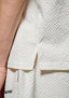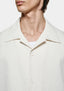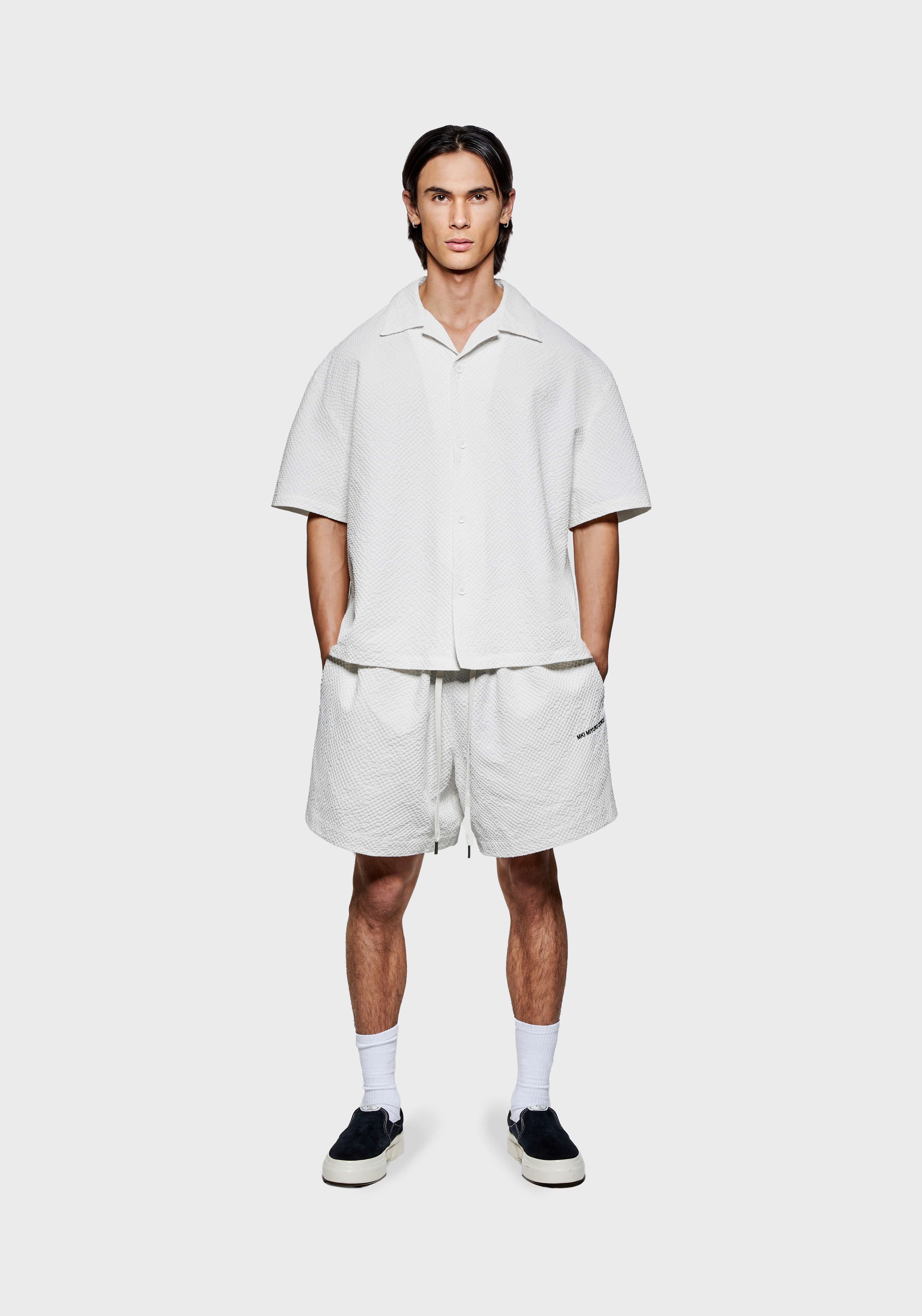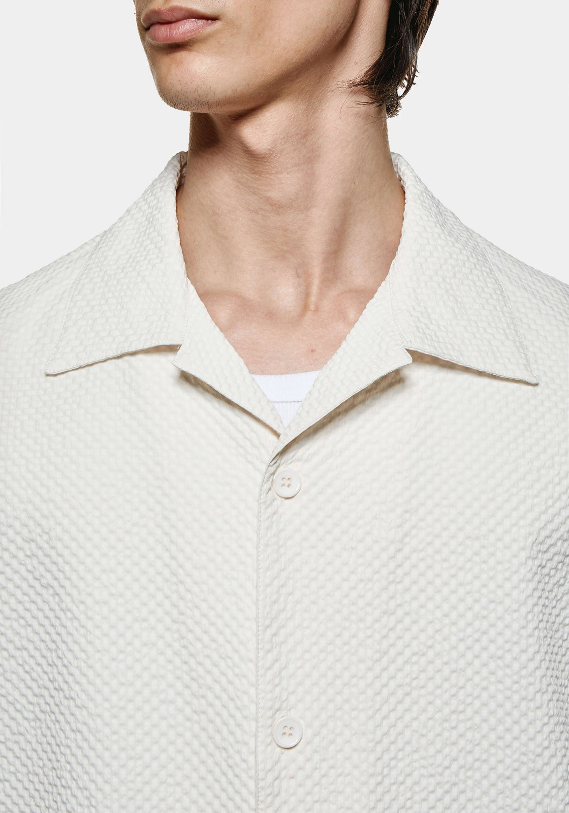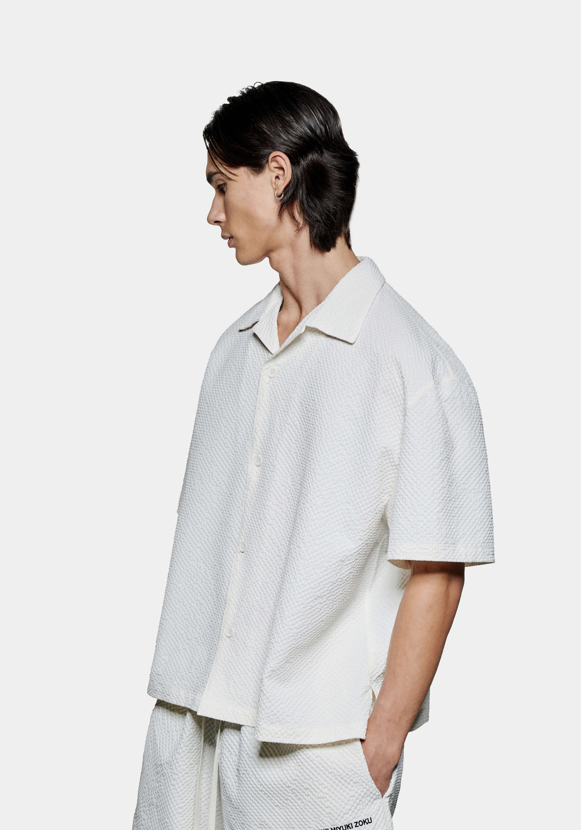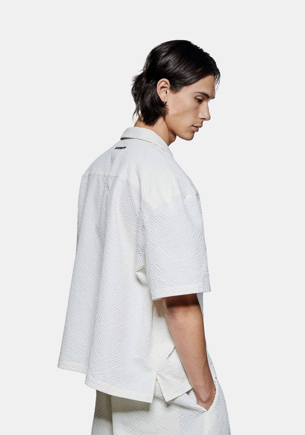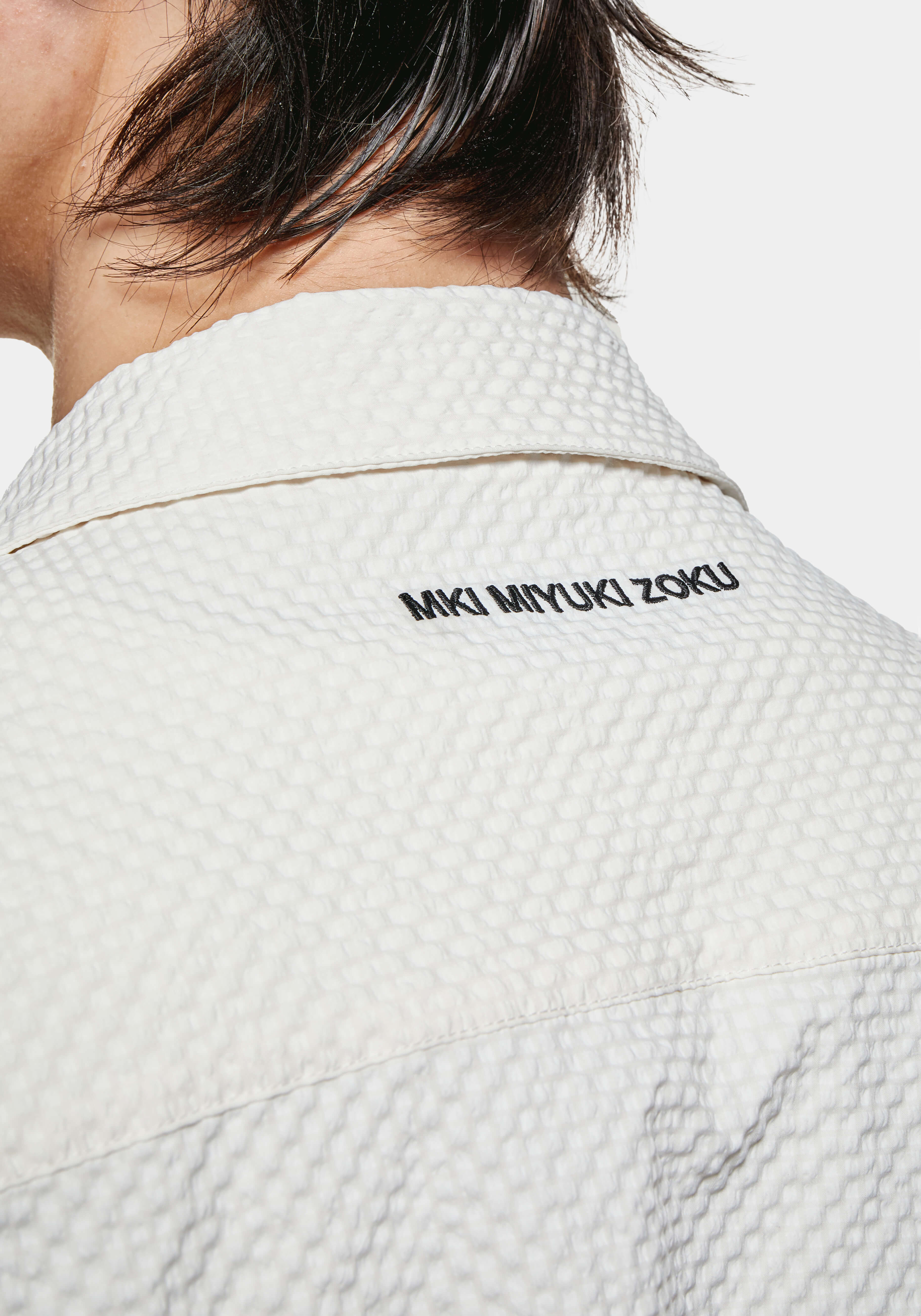 MKI SEERSUCKER VACATION SHIRT BONE. CRAFTED FROM SEERSUCKER FABRIC, THE COLLECTION OFFERS A DURABLE AND BREATHABLE FEEL, WITH A UNIQUE CORRUGATED TEXTURE CREATED THROUGH ADVANCED WEAVING TECHNIQUES, GIVING THE PIECES A STRUCTURED YET RELAXED DRAPE.