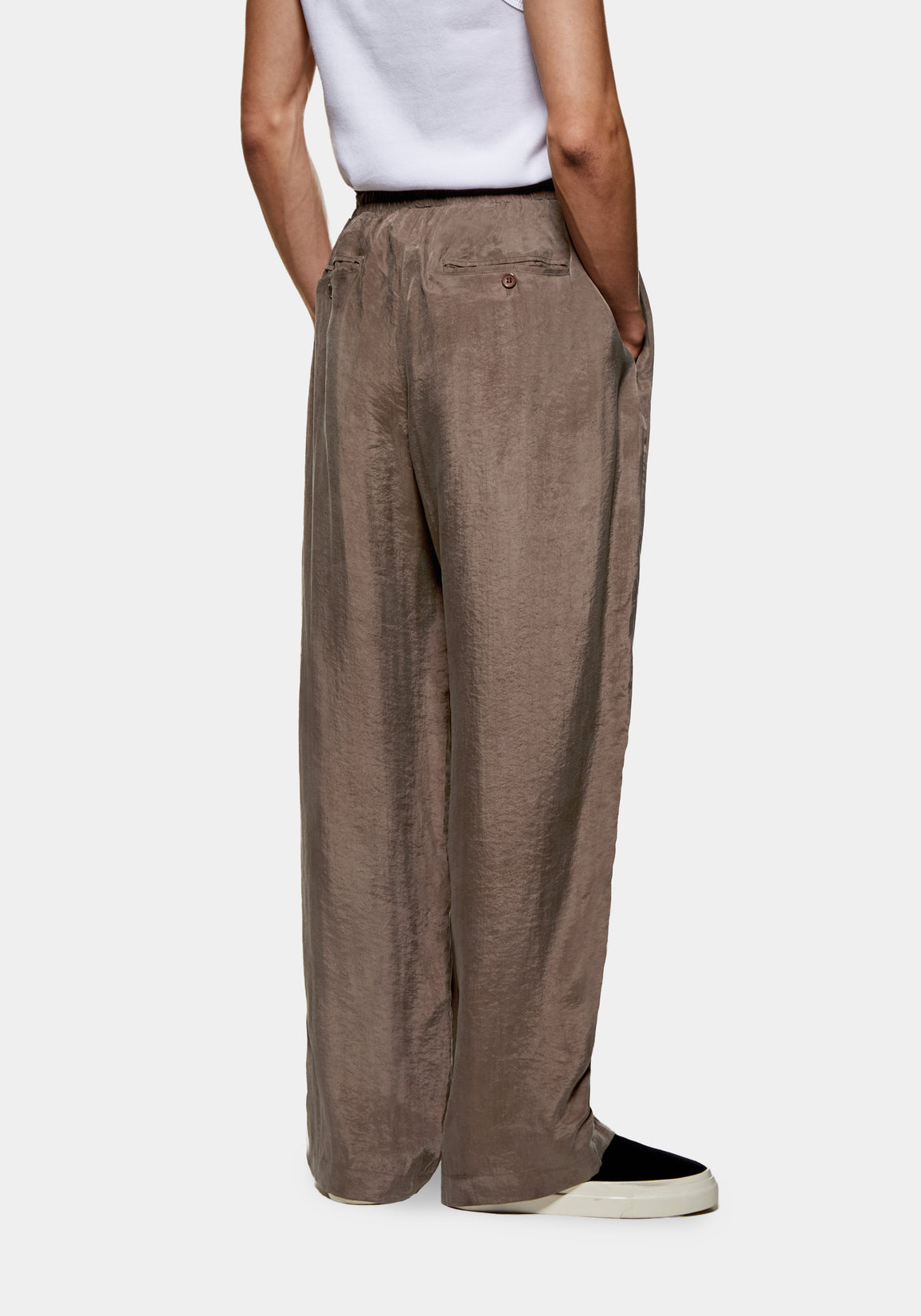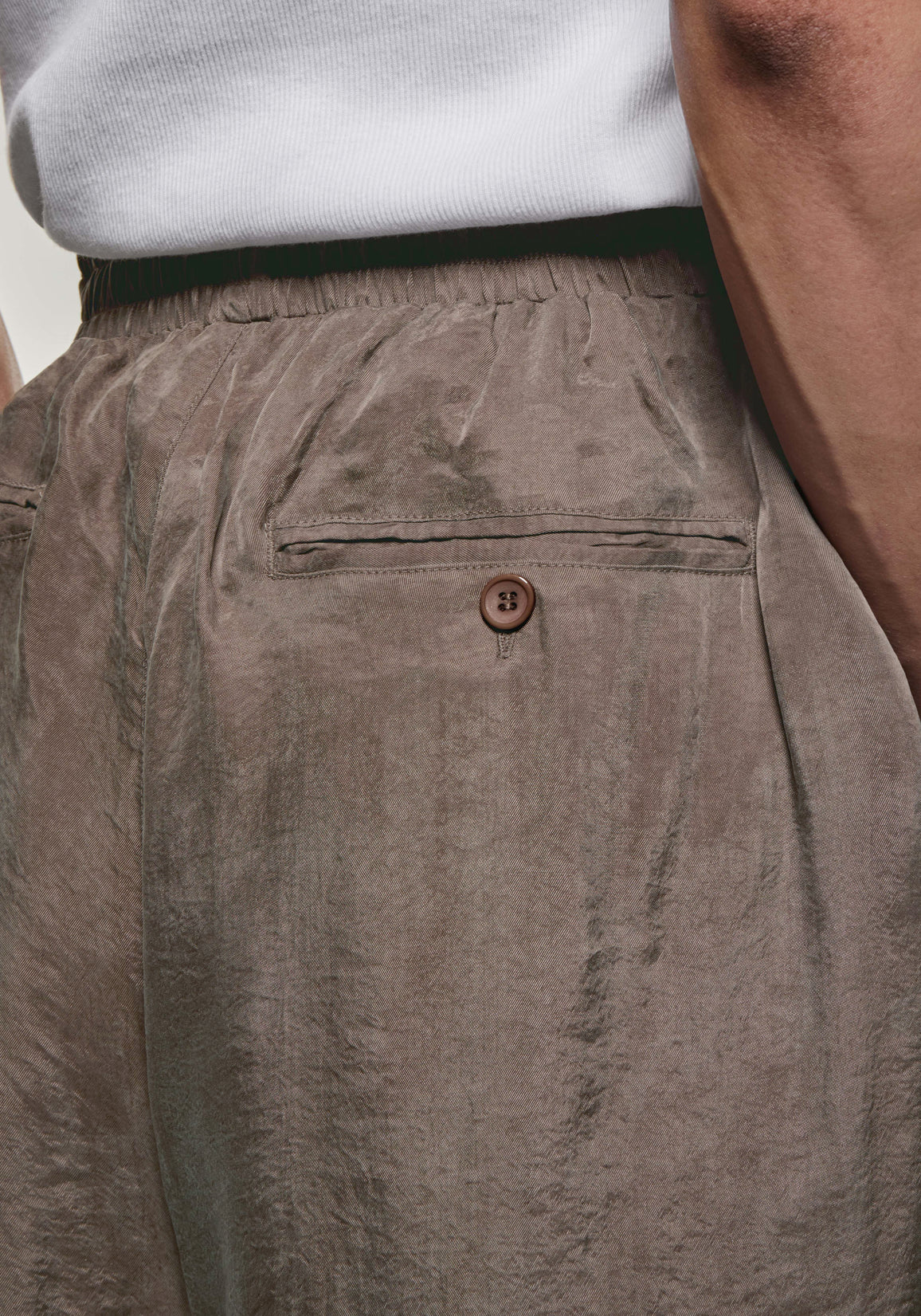 MKI SANDWASH CUPRO WIDE LEG TROUSERS IN BROWN. THIS LIGHTWEIGHT FABRIC, SANDWASHED FOR A SUEDE LIKE TEXTURE, OFFERS AN ULTRA SOFT FEEL WHILE RETAINING THE ELEGANT DRAPE OF THE CUPRO BLEND.