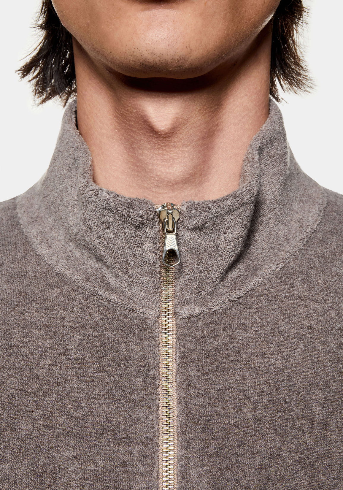 MKI TOWELLING QUARTER ZIP IN BROWN. A NEW ADDITION TO MKI’S ENGINEERED JERSEY RANGE, THE TOWELLING COLLECTION IS A FABRICATION EVOLUTION OF THE SIGNATURE 220 GSM SLUB SILHOUETTE. CRAFTED FROM MELANGE-TEXTURED STRETCH JERSEY, IT FEATURES A DISTINCTIVE KNIT STRUCTURE WITH SOFT FABRIC LOOPS THAT FORM A WARM, TACTILE PILE AND A GENTLE DRAPE. ENHANCING BOTH MOVEMENT AND COMFORT AGAINST THE SKIN.