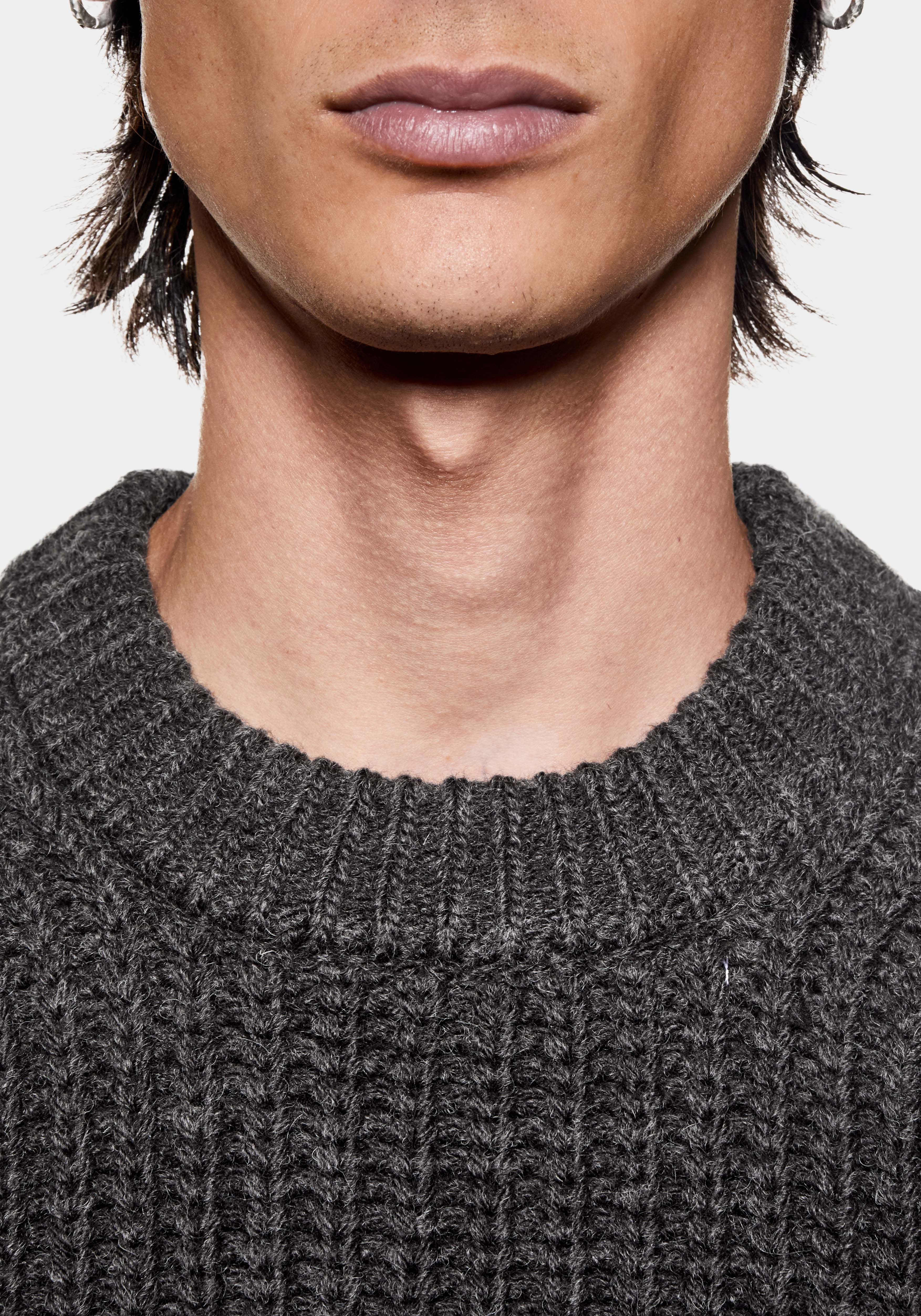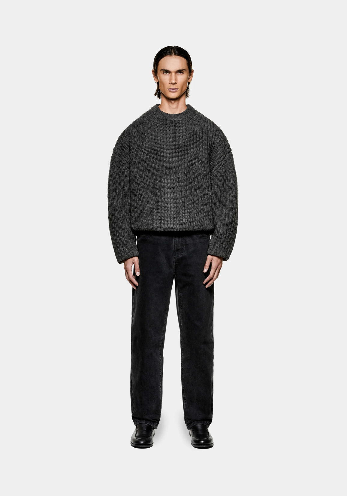 MKI CHUNKY RIB KNIT CREWNECK IN CHARCOAL MELANGE. TRUE TO MKI’S DEDICATION TO DEVELOPMENT AND ELEVATION IN ALL ASPECTS, THE FW25 CHUNKY RIB KNIT COLLECTION HAS A NEW REFINED FIT.