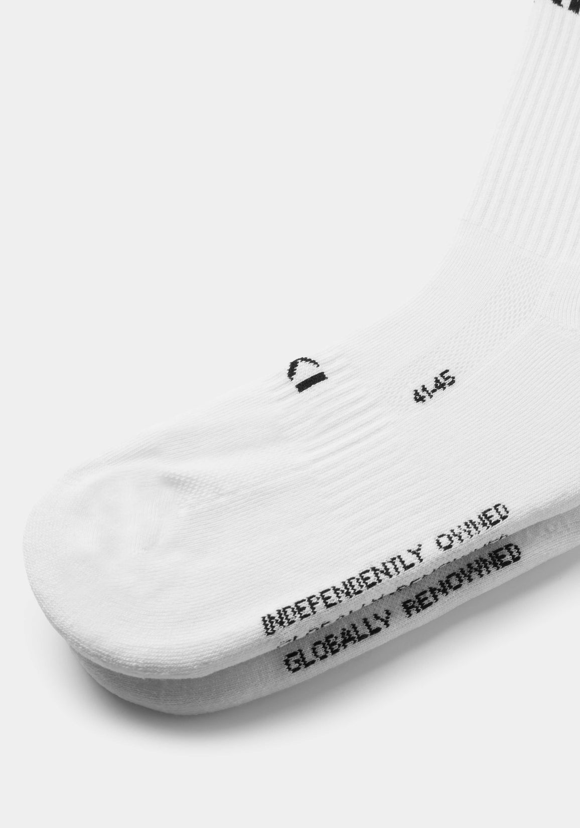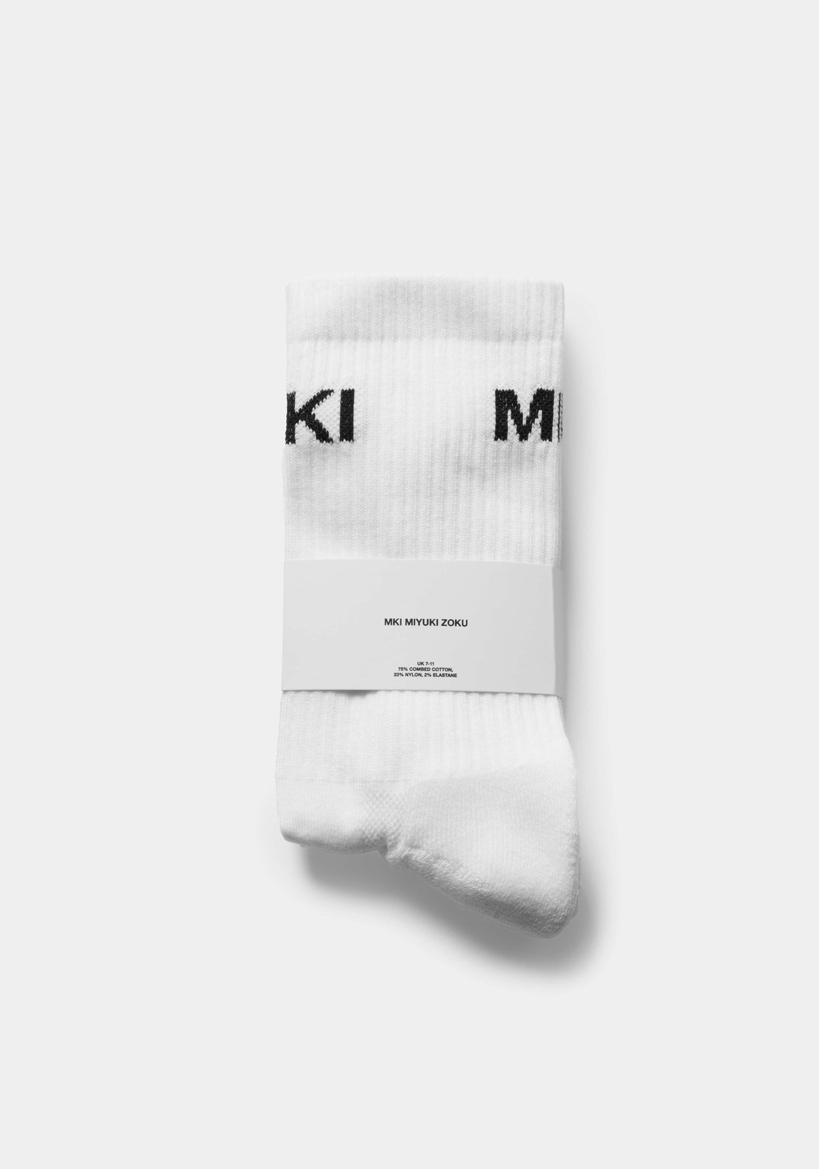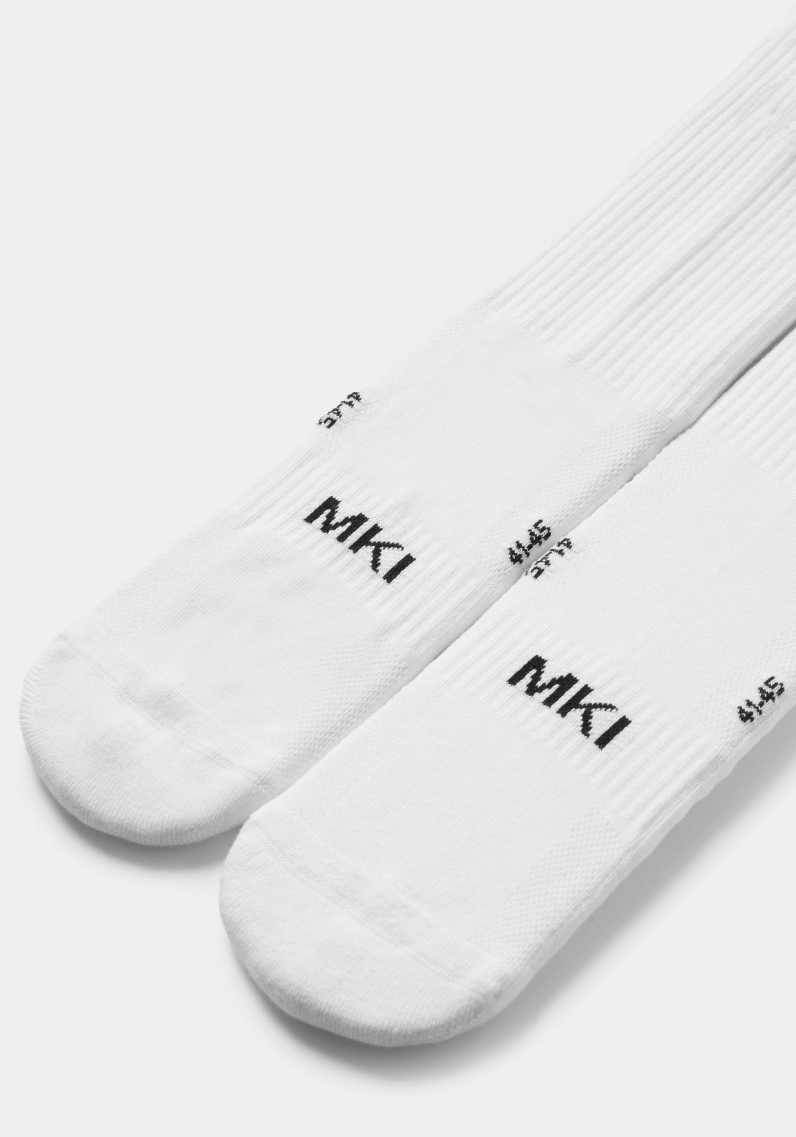 MKI CLASSIC SOCKS IN WHITE. THE MKI CLASSIC SOCKS ARE AN ESSENTIAL PART OF THE MKI UNIFORM. PROUDLY DISPLAYING THE MKI CLASSIC LOGO ON THE FRONT AND REAR OF THE RIBBED ANKLE SHAFT, THE SOCKS ARE CRAFTED FROM A COMBED COTTON BLEND, WITH ADDED NYLON AND ELASTANE FOR LONG-LASTING COMFORT AND DURABILITY. MKI’S ETHOS OF “INDEPENDENTLY OWNED, GLOBALLY RENOWNED" IS APPLIED TO THE BASE.