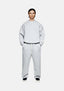 THE MODEL IS 6FT, HAS A 29' WAIST, CHEST MEASURING 37', AND WEARS A SIZE LARGE. THE MODEL IS ALSO WEARING MKI 800 GSM SUPERWEIGHT WIDE LEG JOGGERS IN GREY.
