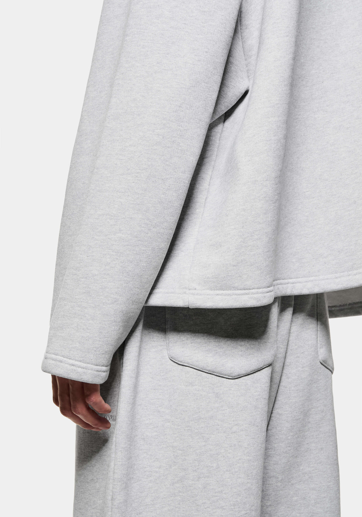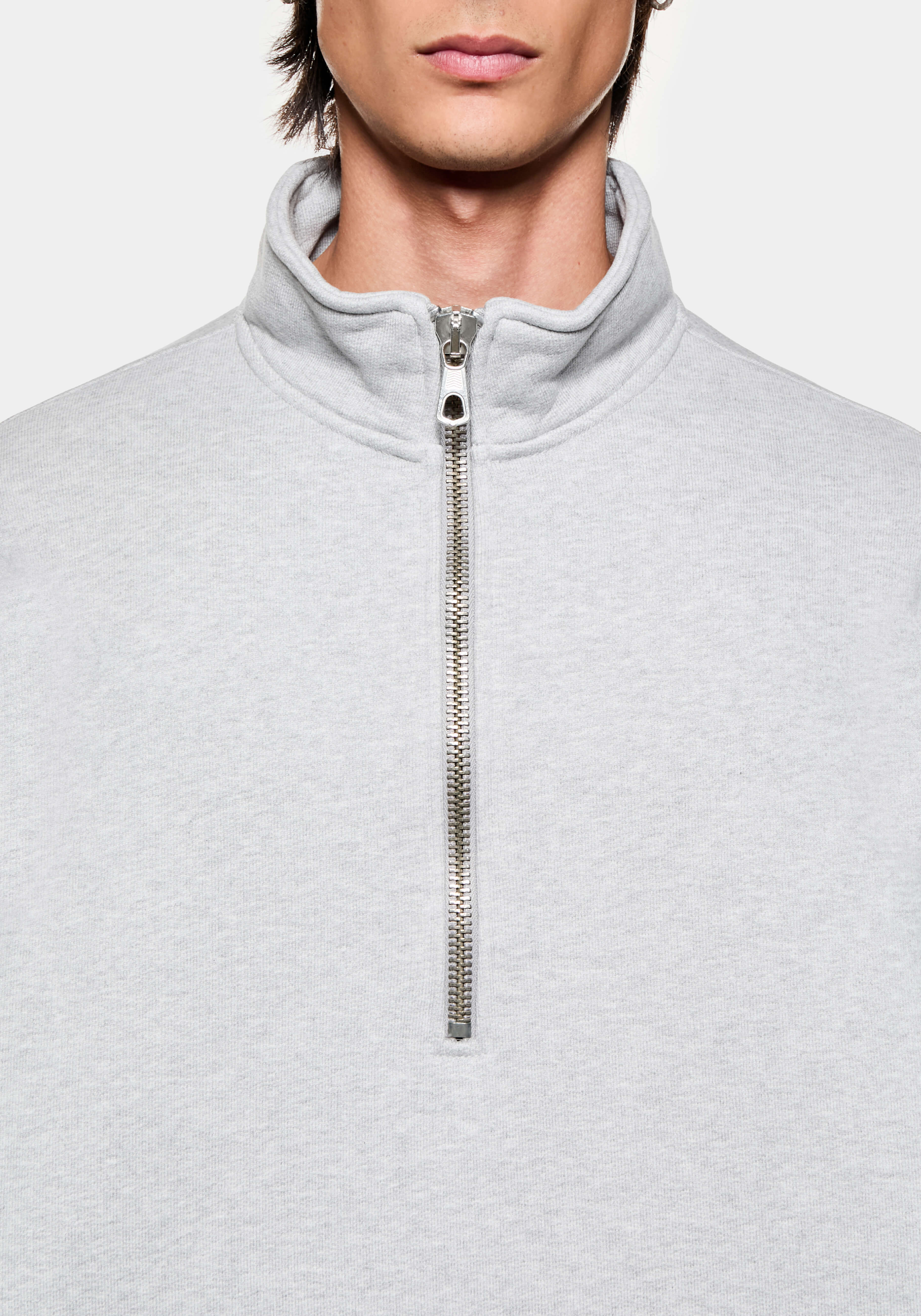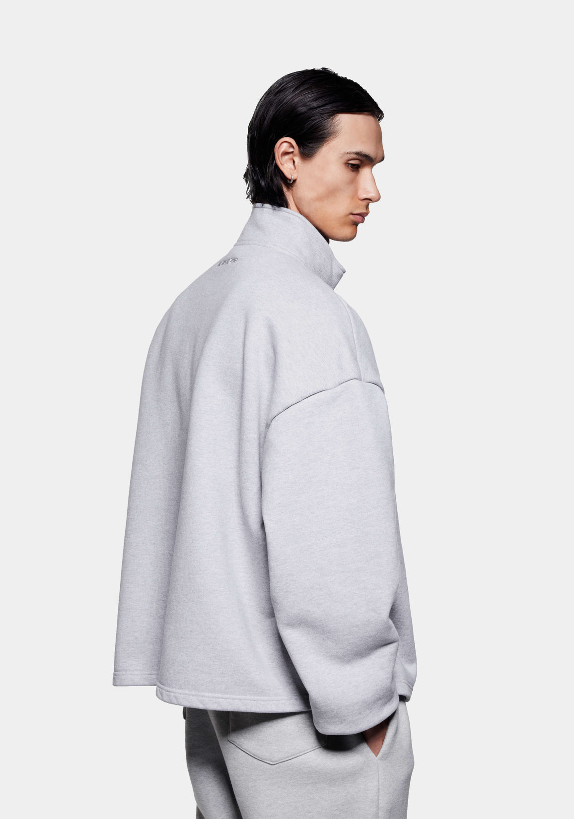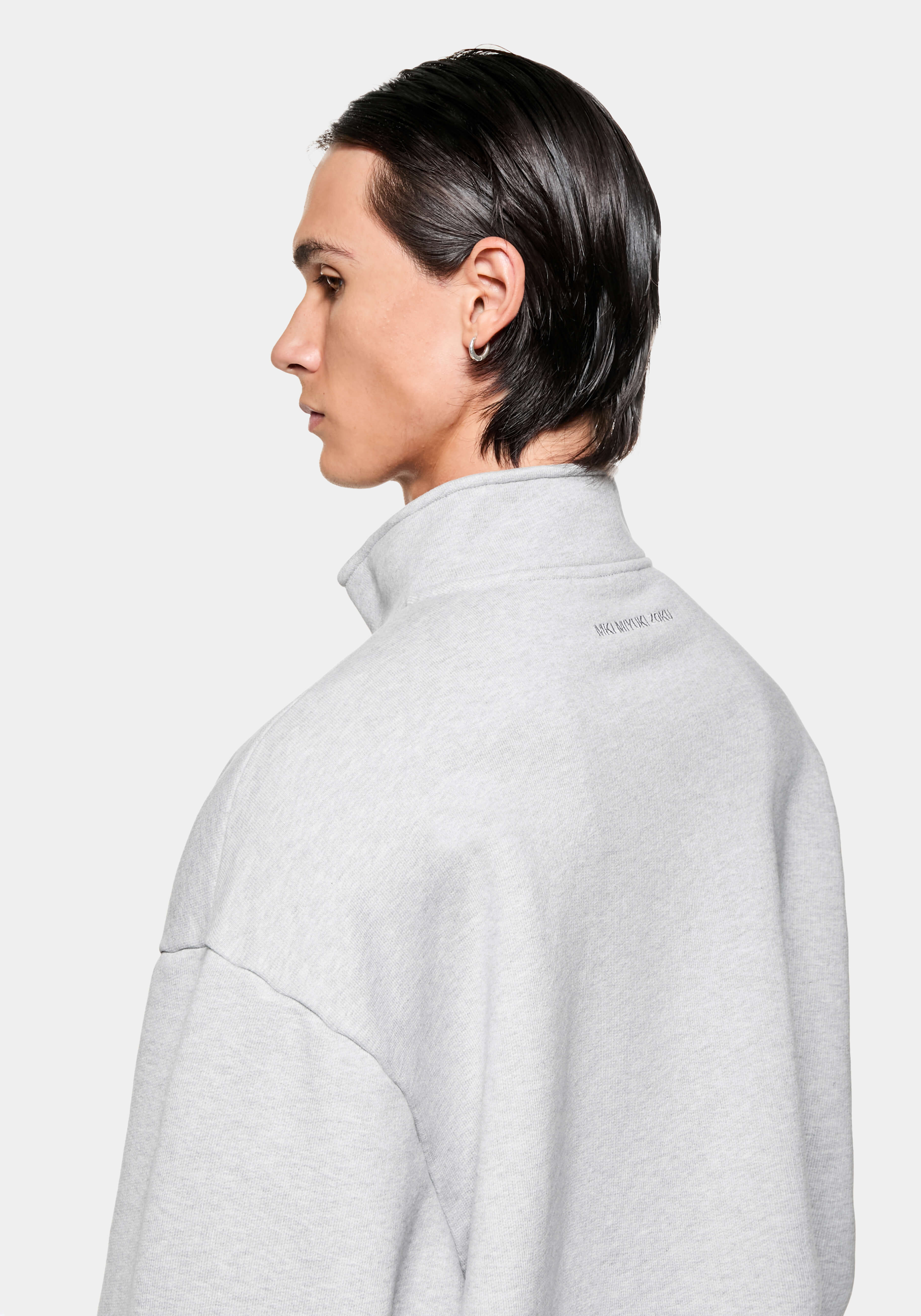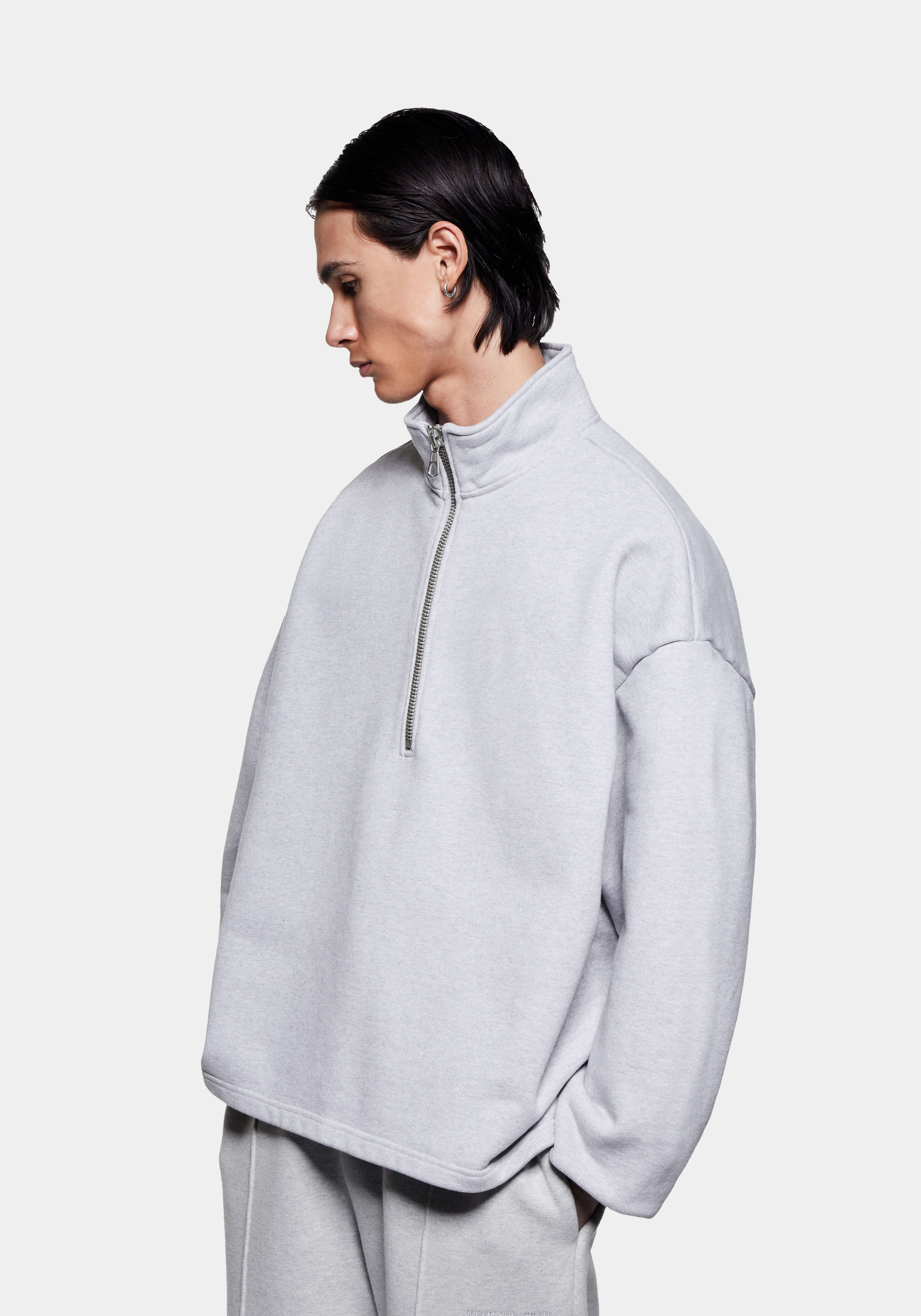 MKI 800 GSM SUPERWEIGHT QUARTER ZIP IN GREY. WITH COMFORT AND FUNCTION AT ITS CORE, THE MKI SUPERWEIGHT COLLECTION EXPANDS TO OFFER THE SUPERWEIGHT QUARTER ZIP SWEATSHIRT IN A CORE GREY COLOURWAY. CRAFTED FROM HEAVYWEIGHT, 800GSM COTTON JERSEY, THE OVERSIZED QUARTER ZIP SWEATSHIRT DISPLAYS DROPPED SHOULDERS AND A FUNNEL NECK BUILD, FINISHED WITH A #8 SILVER METAL ZIP FRONT AND TONAL EMBROIDERY AT THE REAR NECKLINE.
