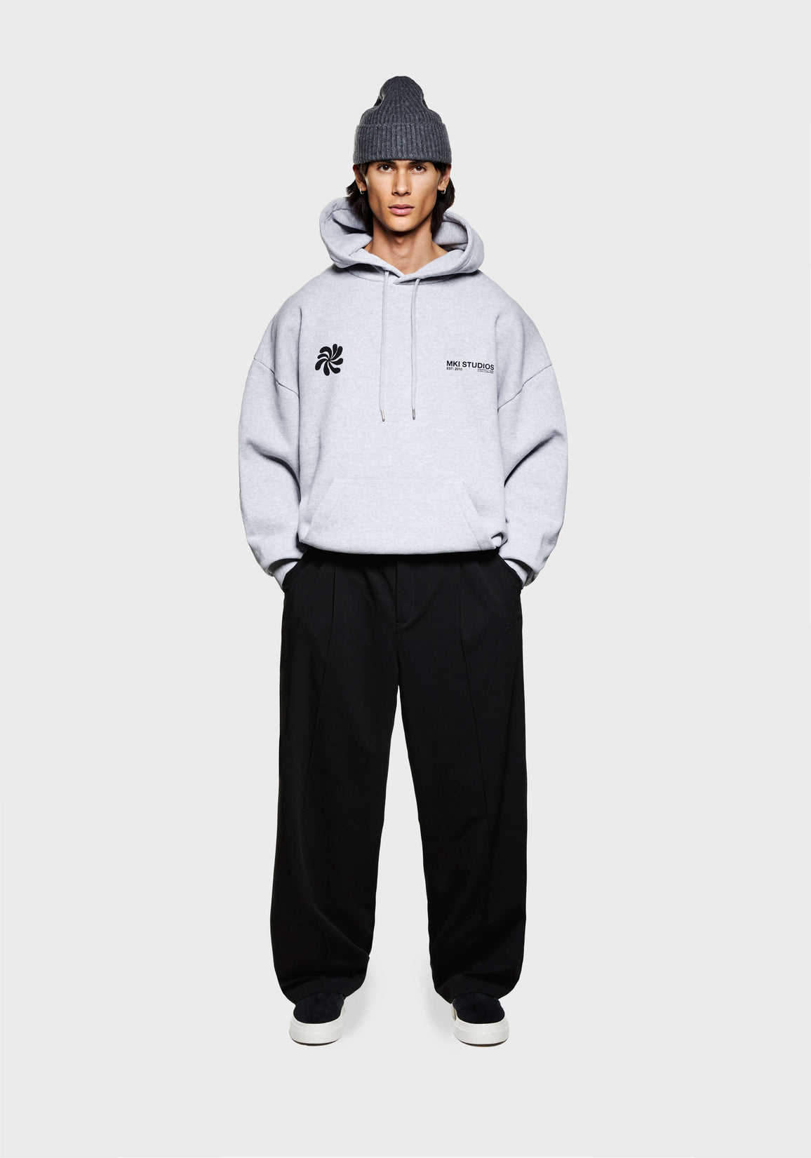 THE MODEL IS 6FT WITH A 38" CHEST AND 31" WAIST AND HAS BEEN STYLED IN A MEDIUM. WE RECOMMEND PURCHASING YOUR REGULAR SIZE, FOR THE DESIRED OVERSIZED FIT. THE MODEL IS ALSO WEARING MKI WIDE FIT SUIT PANTS IN BLACK.