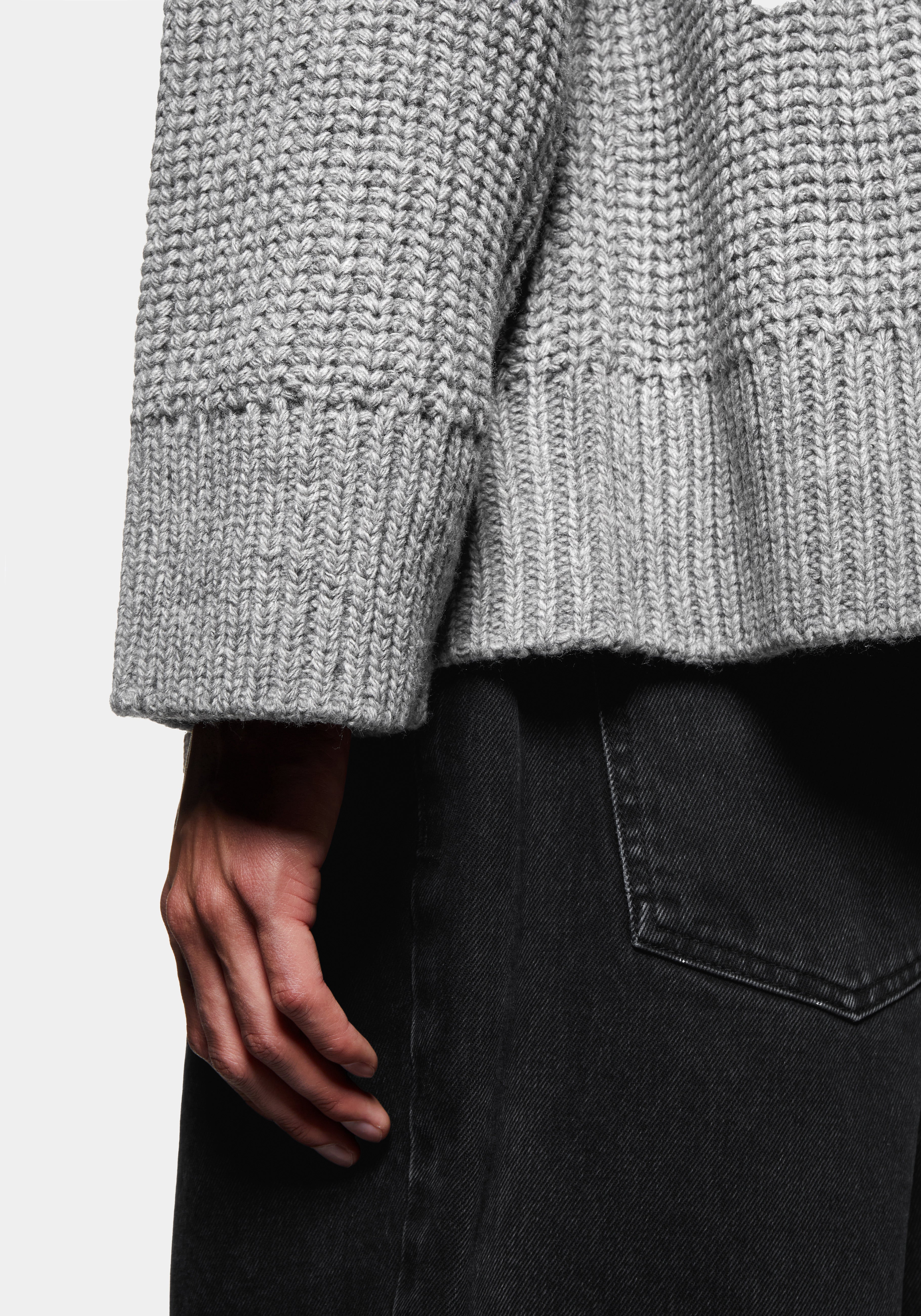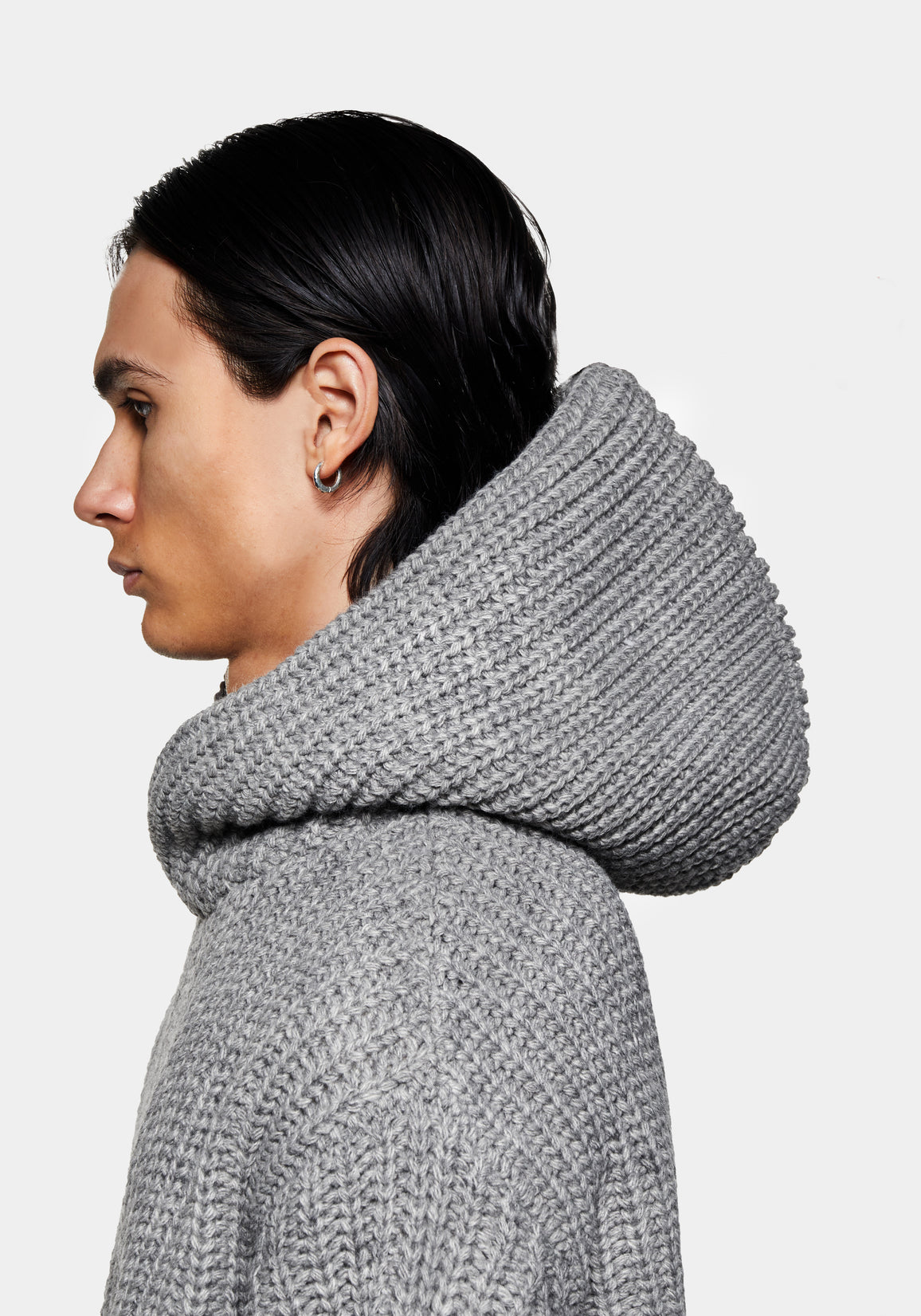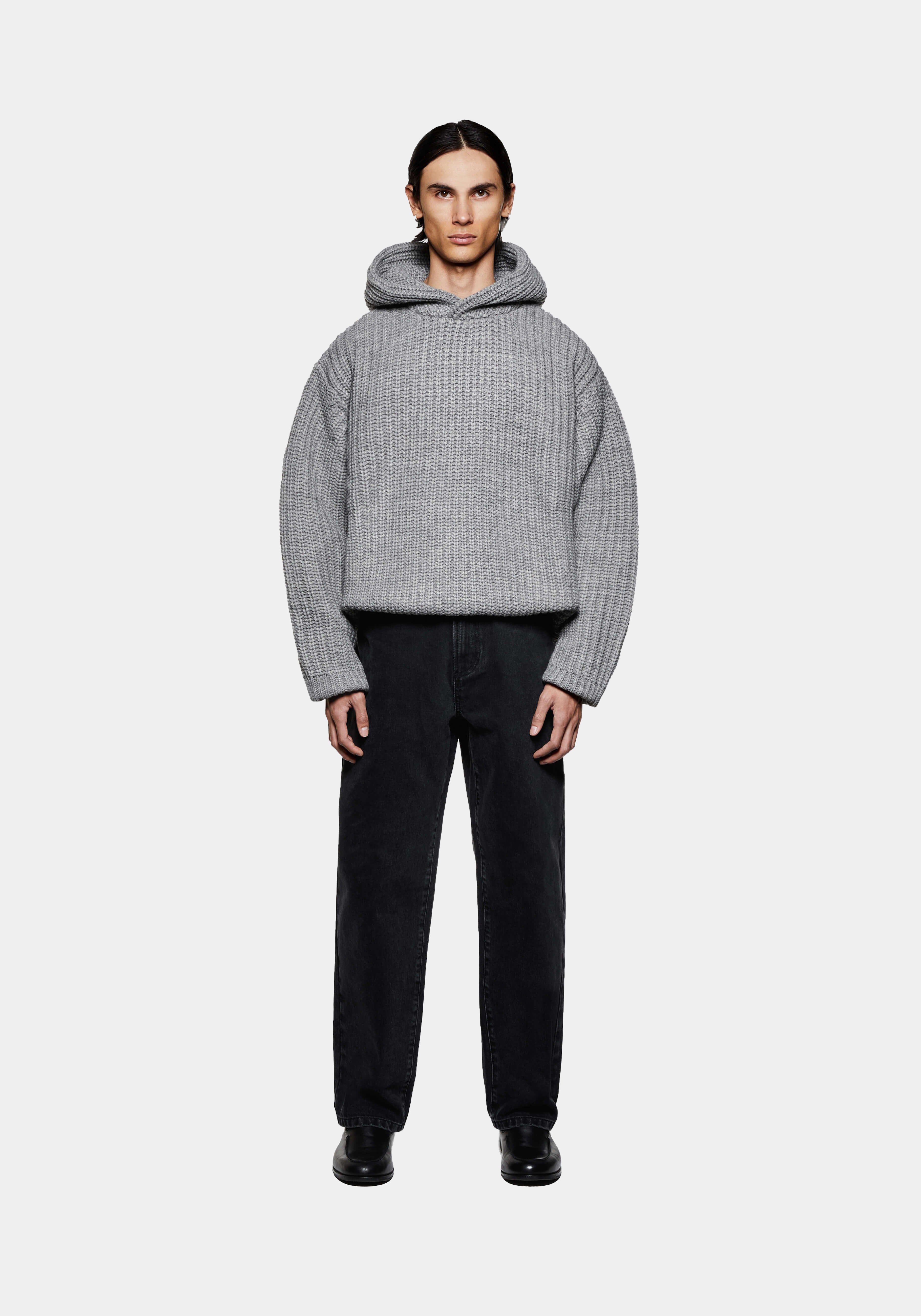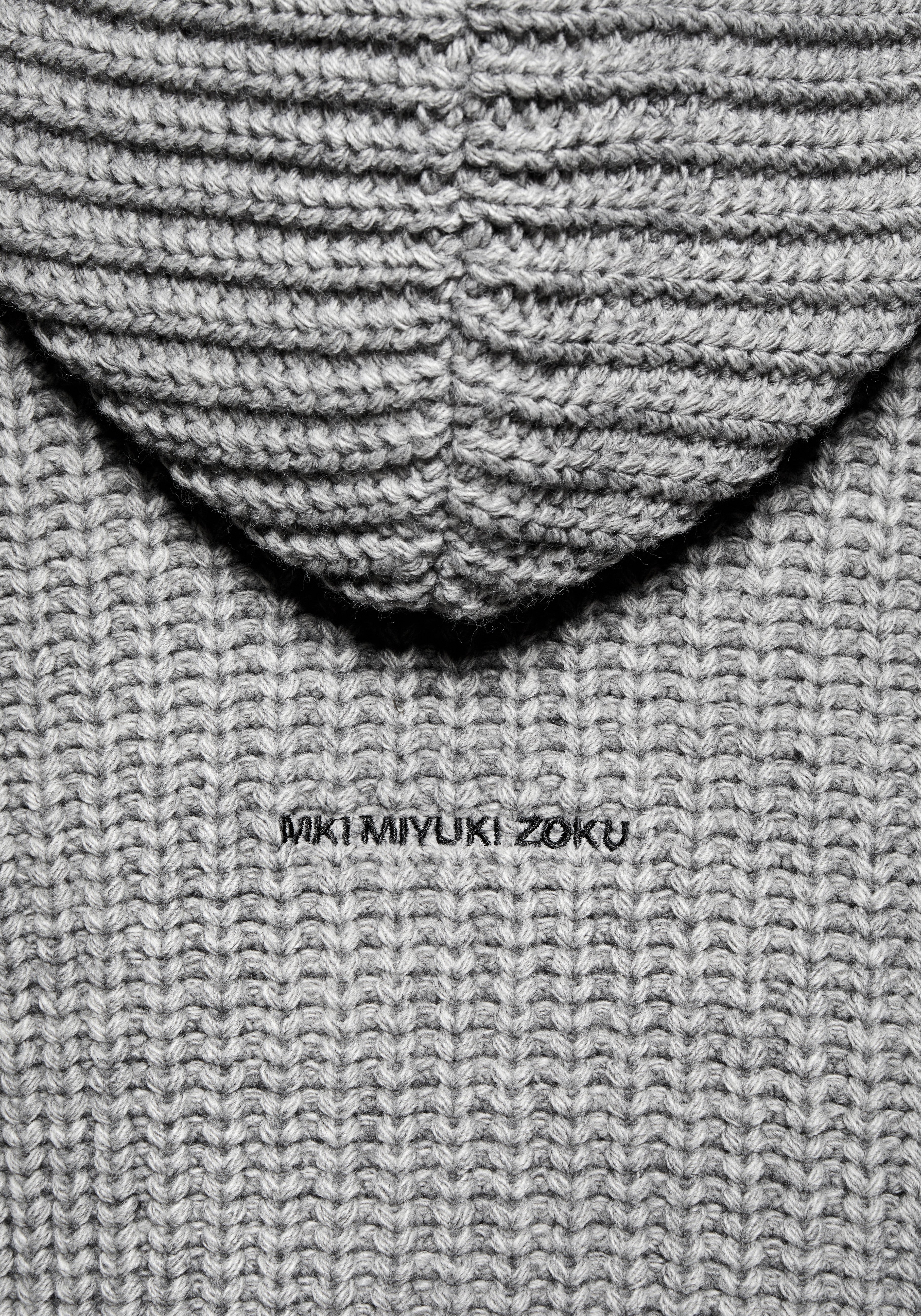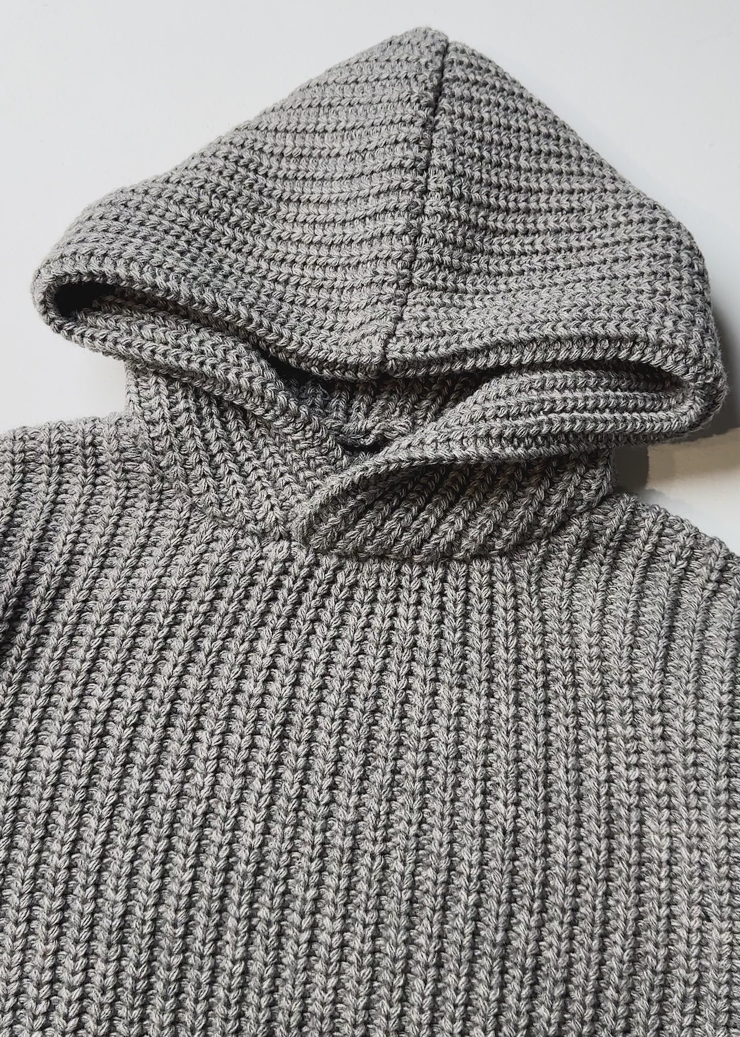 MKI CHUNKY RIB KNIT HOODY IN GREY MELANGE. TRUE TO MKI’S DEDICATION TO DEVELOPMENT AND ELEVATION IN ALL ASPECTS, THE FW25 CHUNKY RIB KNIT COLLECTION HAS A NEW REFINED FIT.