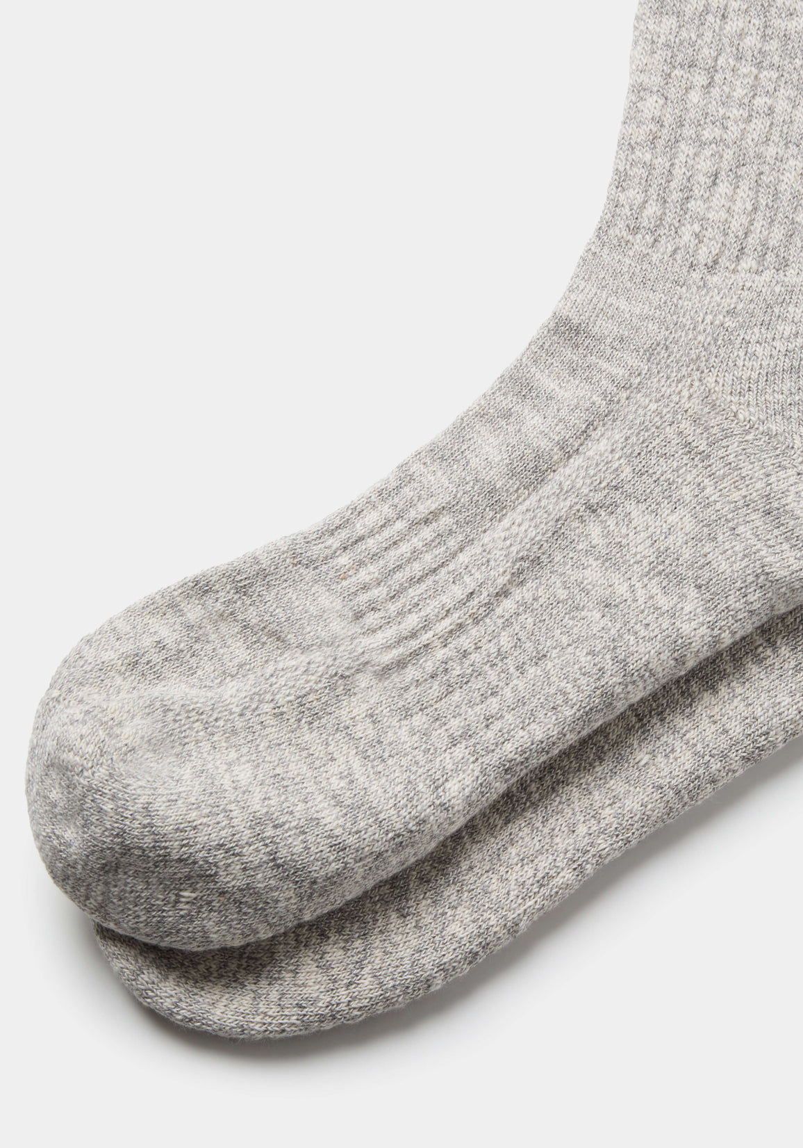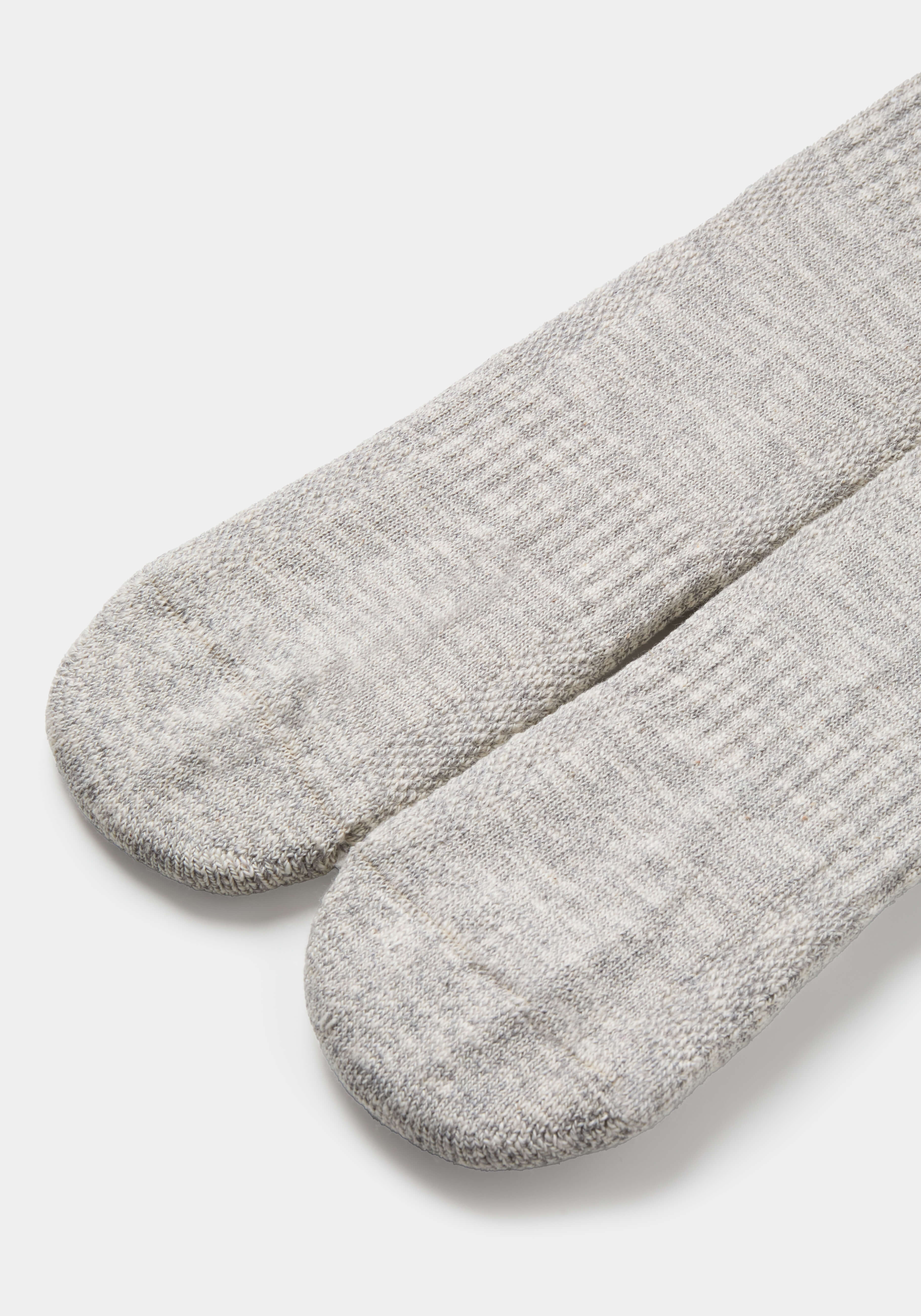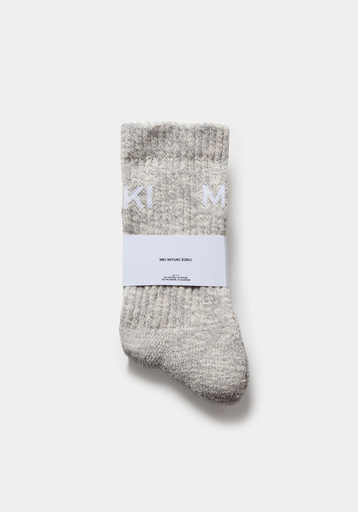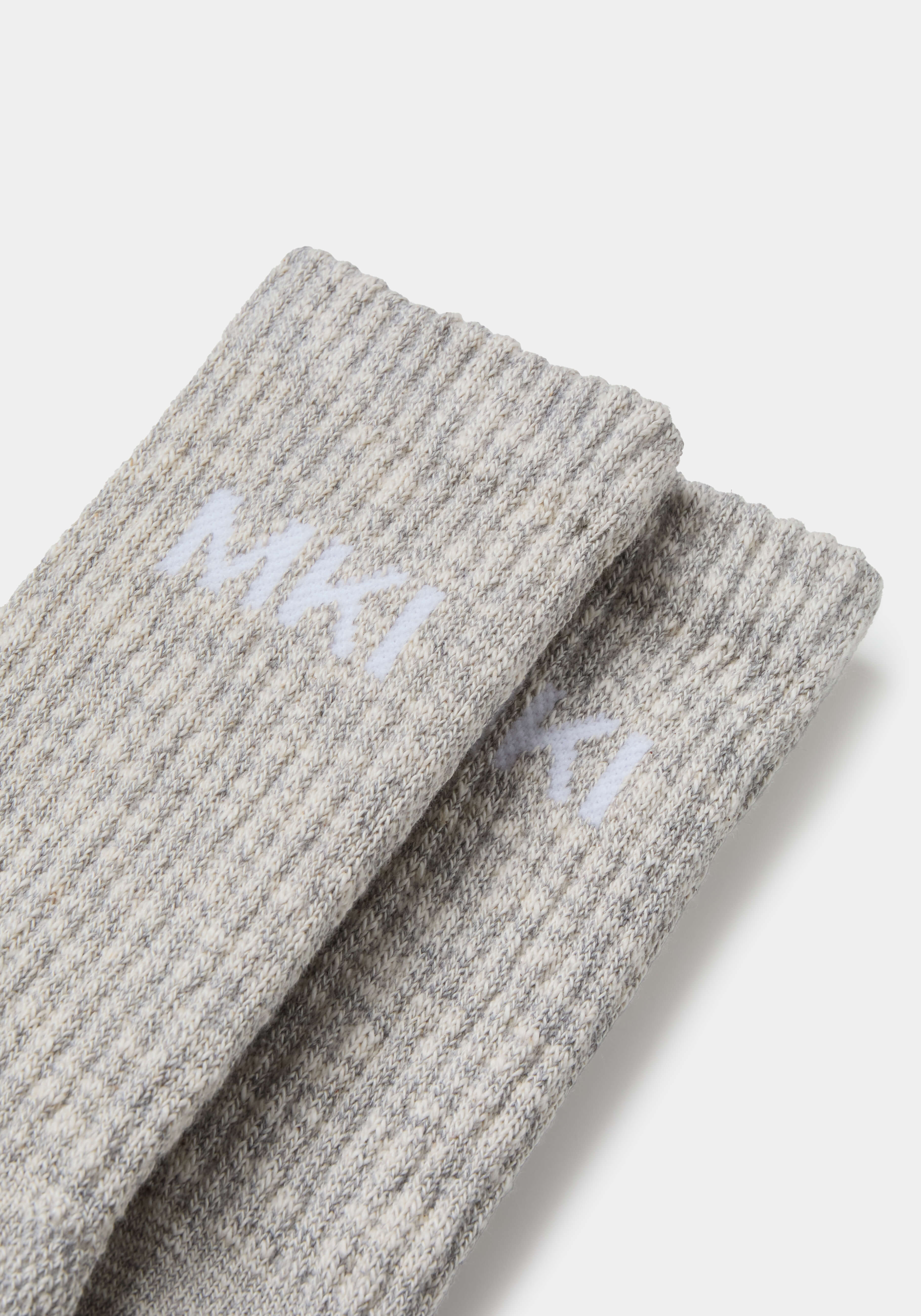 MKI CLASSIC SLUB SOCKS IN GREY MELANGE. A TEXTURED UPDATE TO THE MKI CLASSIC SOCKS, PRESENTED IN A COMBED COTTON BLEND SLUB FOR FW25. THE MID LENGTH SOCKS FEATURE A RIBBED BUILD WITH CLASSIC MKI BRANDING AT THE TOP. THE MARL KNIT CREATES CONTRAST THROUGHOUT, ADDING A UNIQUE TOUCH TO AN EVERYDAY STAPLE.