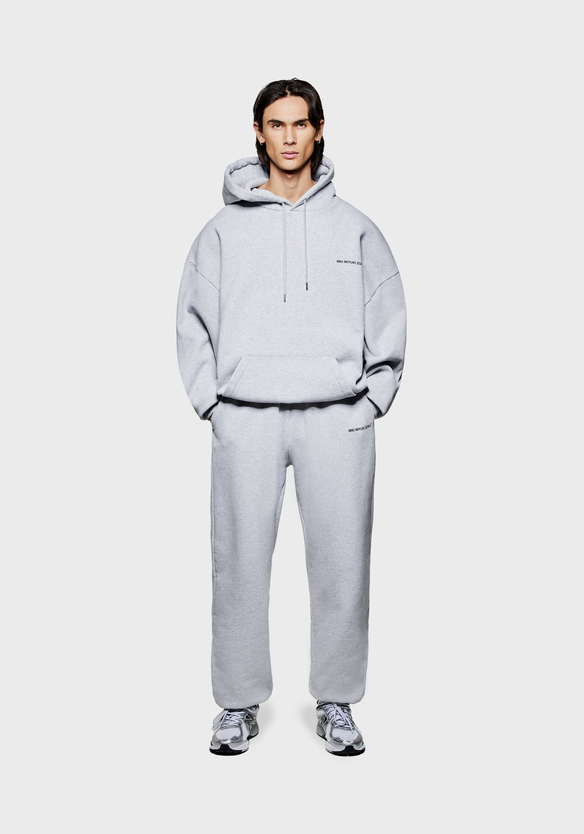 THE MODEL IS 6FT WITH A 38" CHEST AND 31" WAIST AND HAS BEEN STYLED IN A MEDIUM. WE RECOMMEND PURCHASING YOUR REGULAR SIZE, FOR THE DESIRED OVERSIZED FIT. THE MODEL IS ALSO WEARING MKI UNIFORM JOGGERS IN GREY.