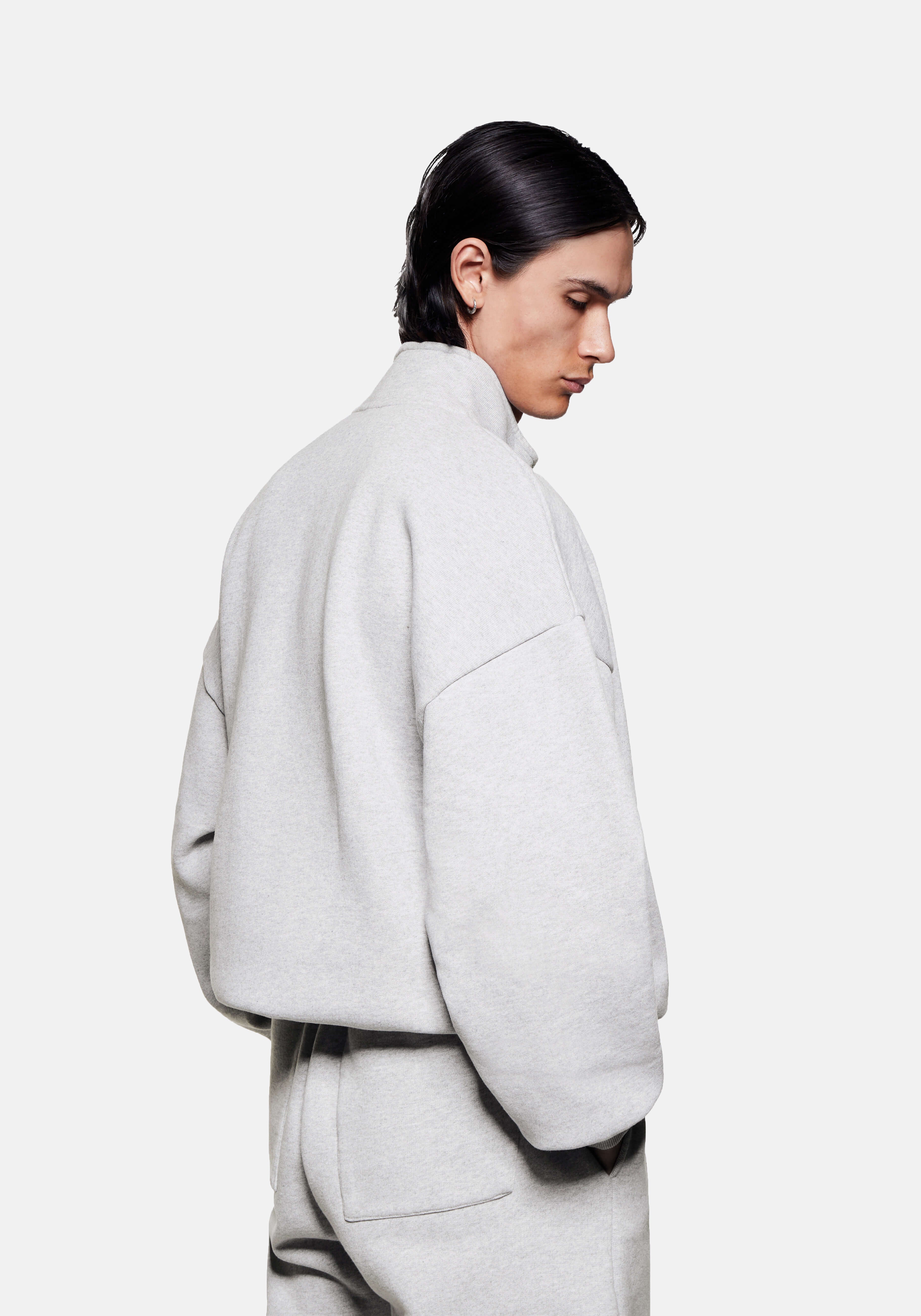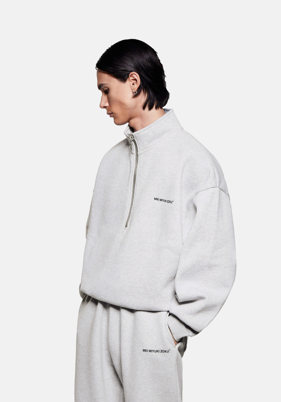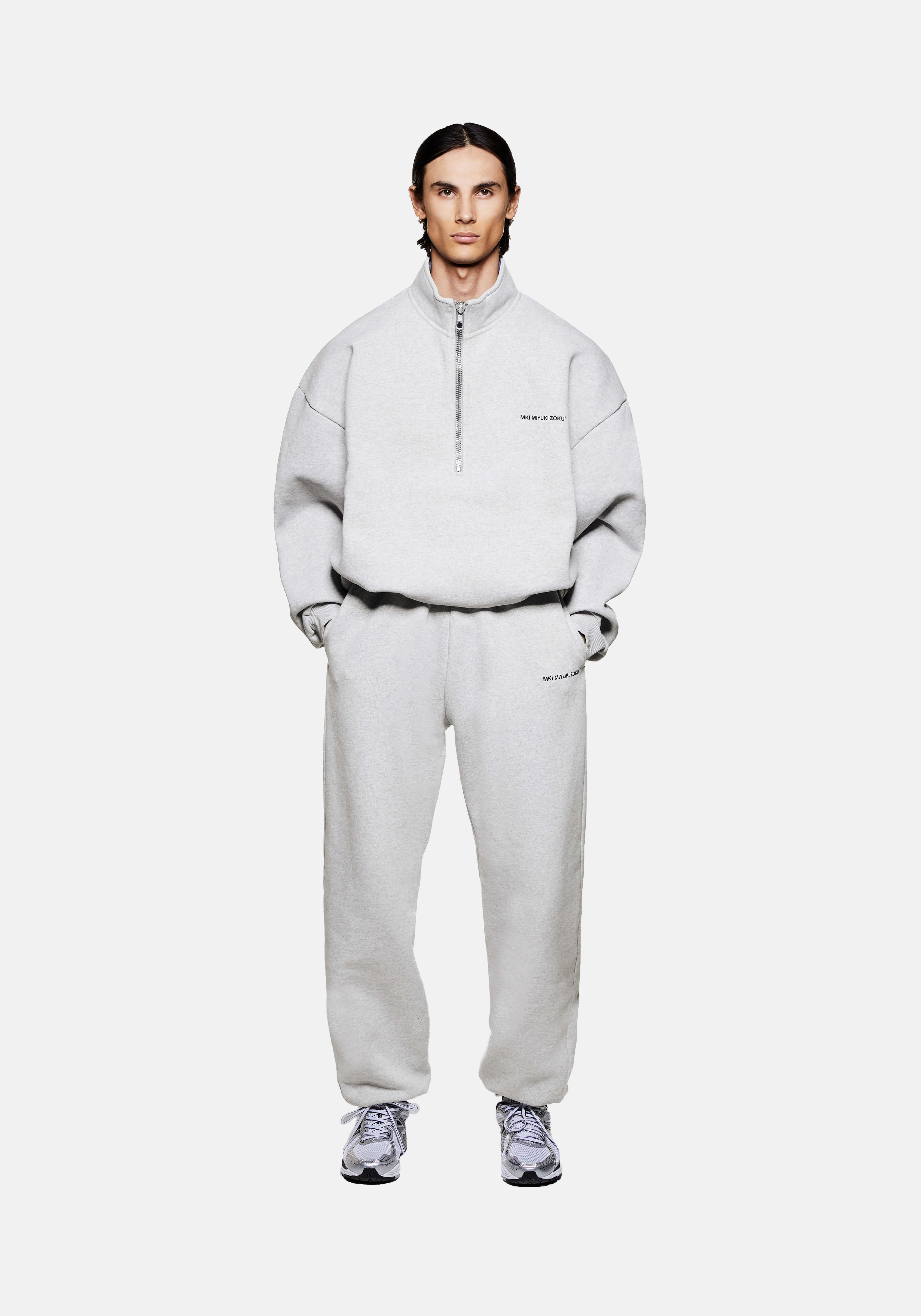 MKI UNIFORM QUARTER ZIP IN GREY. THE QUARTER ZIP SWEATSHIRT IS THE LATEST ADDITION TO THE STAPLE MKI UNIFORM COLLECTION. CRAFTED FROM HEAVYWEIGHT 500GSM COTTON JERSEY, THE QUARTER ZIP IS PRESENTED IN MKI’S OVERSIZED BOX FIT IN A CORE GREY COLOURWAY. FUNCTIONAL WEARABILITY IS UNDERSCORED BY THE #8 SILVER METAL ZIP FRONT AND FUNNEL NECK BUILD.