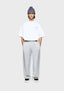 THE MODEL IS 6FT, HAS A 29' WAIST, CHEST MEASURING 37', AND WEARS A SIZE LARGE. THE MODEL IS ALSO WEARING MKI UNIFORM T-SHIRT IN WHITE.