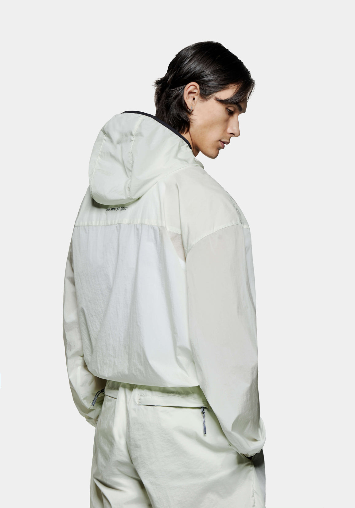 MKI ULTRALIGHT NYLON HOODED JACKET IN MINT. THE ULTRALIGHT NYLON COLLECTION IS MADE FROM ULTRALIGHT RIPSTOP FABRIC, KNOWN FOR ITS DURABILITY AND ULTRA LIGHTWEIGHT TEXTURE. THE UNLINED STRUCTURE OF THE HOODED JACKET EXPOSES A TRANSLUCENT FINISH, ACCENTUATING THE INTRICATE TECHNICAL DETAILS, SUCH AS THE CURVED POCKET DESIGN. DESIGNED WITH PURPOSE AND PRECISION, WITH A WINDBREAKER FEEL.