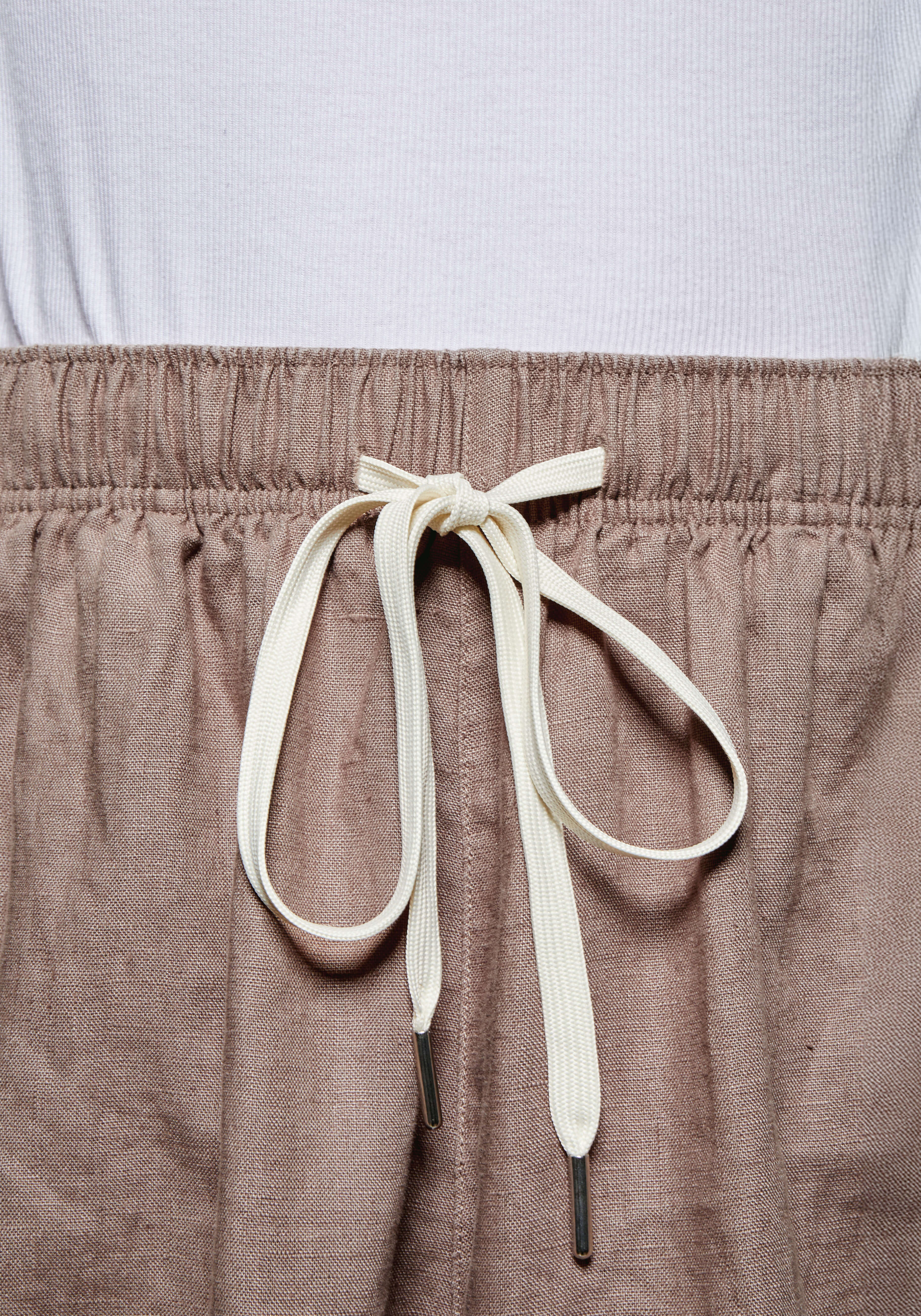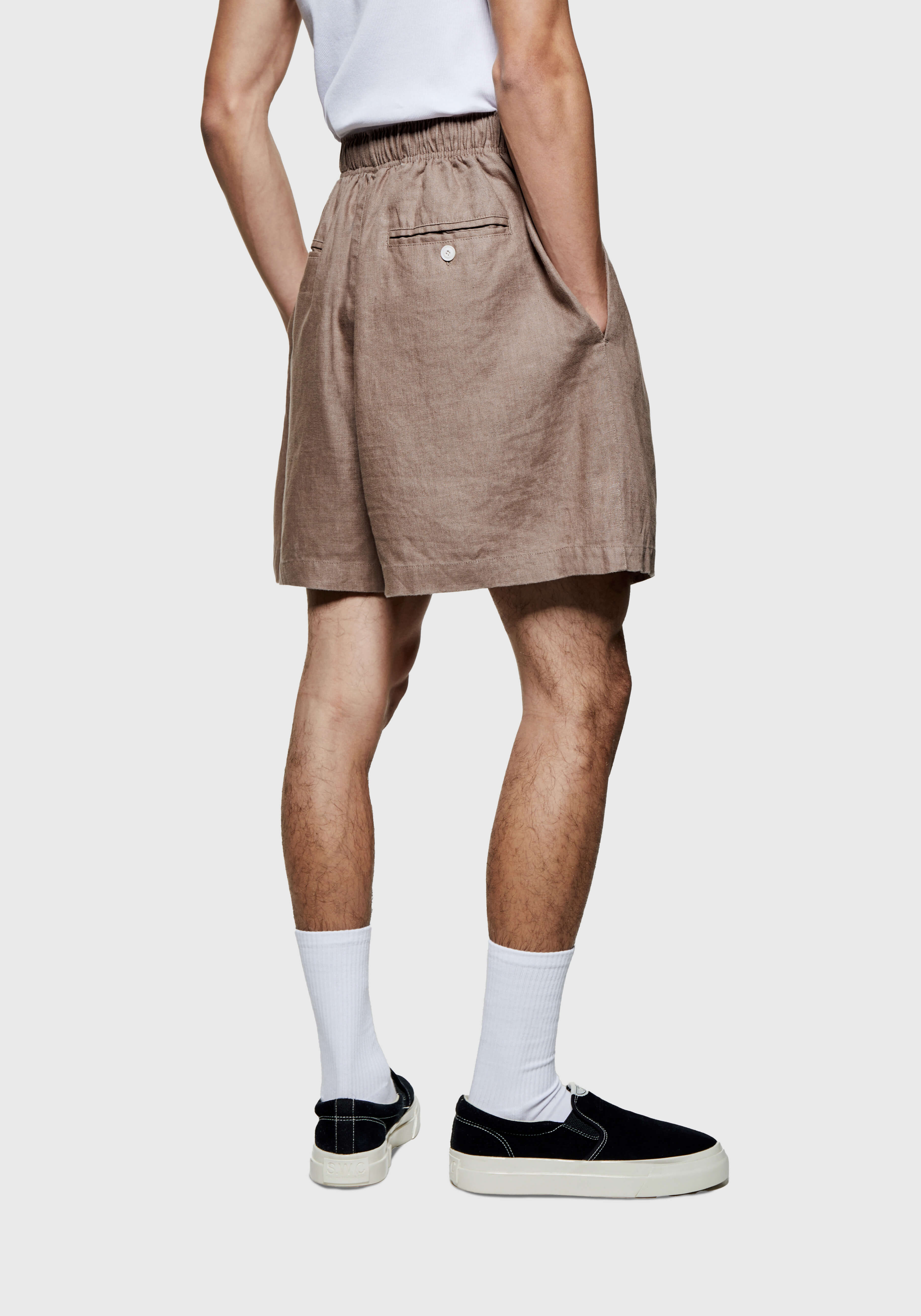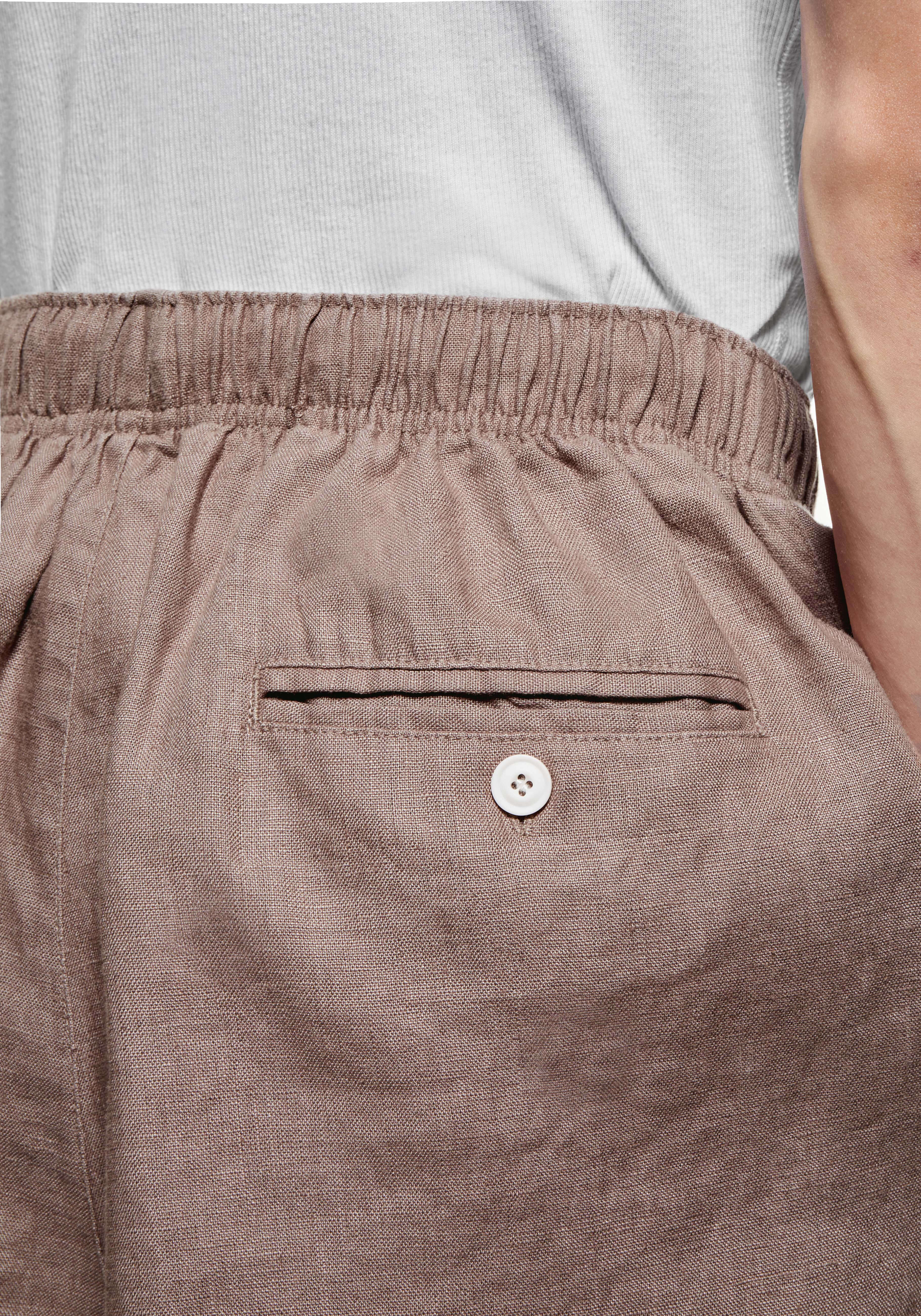 MKI LINEN SHORTS IN MUSHROOM. THE MKI LINEN SHORTS ARE CRAFTED FROM LIGHT, BREATHABLE LINEN, FEATURING A RELAXED, WIDE FIT AND AN ELASTICATED WAISTBAND WITH DRAWSTRINGS FOR A CUSTOM FIT. IDEAL FOR SUNNY DAYS, THESE SHORTS COMBINE COMFORT AND STYLE FOR THE PERFECT SUMMER LOOK.