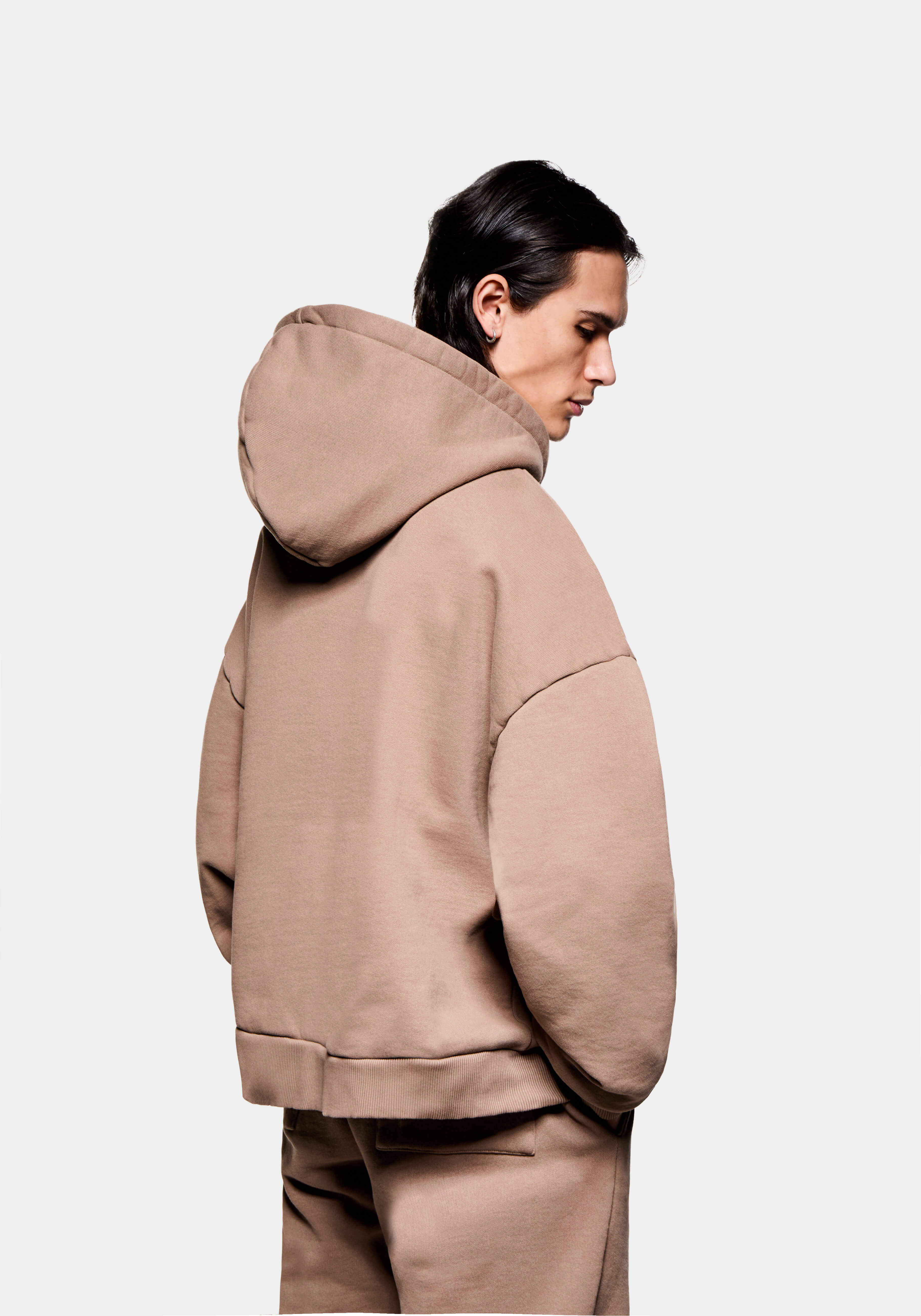MKI UNIFORM ZIP HOODY IN MUSHROOM. THE MKI UNIFORM ZIP HOODY IN MUSHROOM IS CRAFTED FROM 500GSM HEAVYWEIGHT FABRIC, MADE WITH A DURABLE 78/22 COTTON/POLY BLEND. FOR SS25, MUSHROOM HAS BEEN INTRODUCED AS PART OF THE SS25 JERSEY COLLECTION, OFFERING A BOXY FIT.