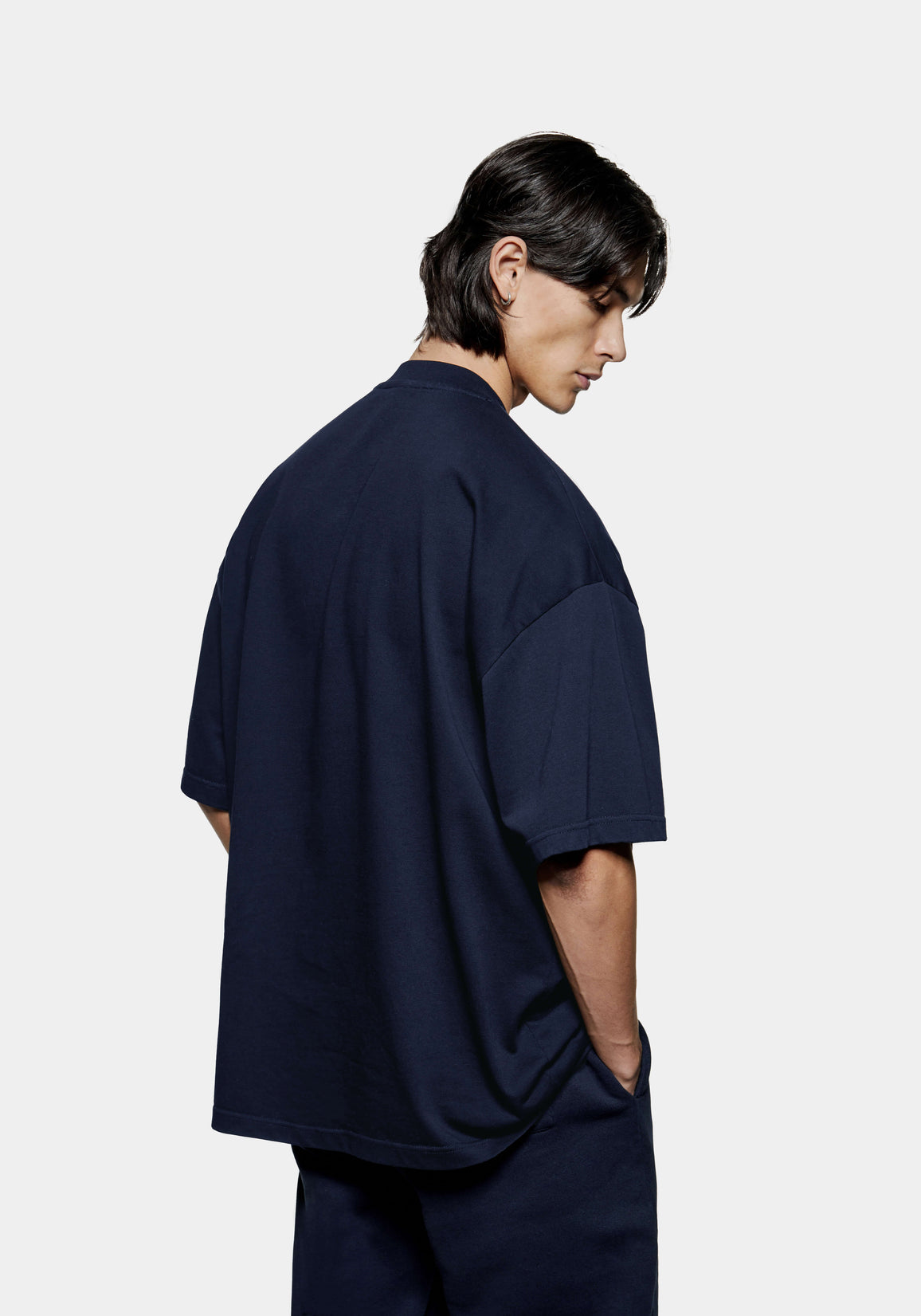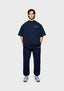 THE MODEL IS 6FT WITH A 38" CHEST AND 31" WAIST AND HAS BEEN STYLED IN A MEDIUM. WE RECOMMEND PURCHASING YOUR REGULAR SIZE, FOR THE DESIRED RELAXED FIT. THE MODEL IS ALSO WEARING MKI UNIFORM JOGGERS IN NAVY.