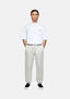 THE MODEL IS 6FT, HAS A 29' WAIST, CHEST MEASURING 37', AND WEARS A SIZE LARGE. THE MODEL IS ALSO WEARING MKI UNIFORM T-SHIRT IN WHITE.