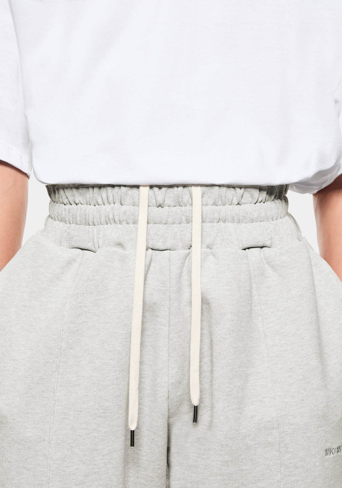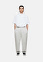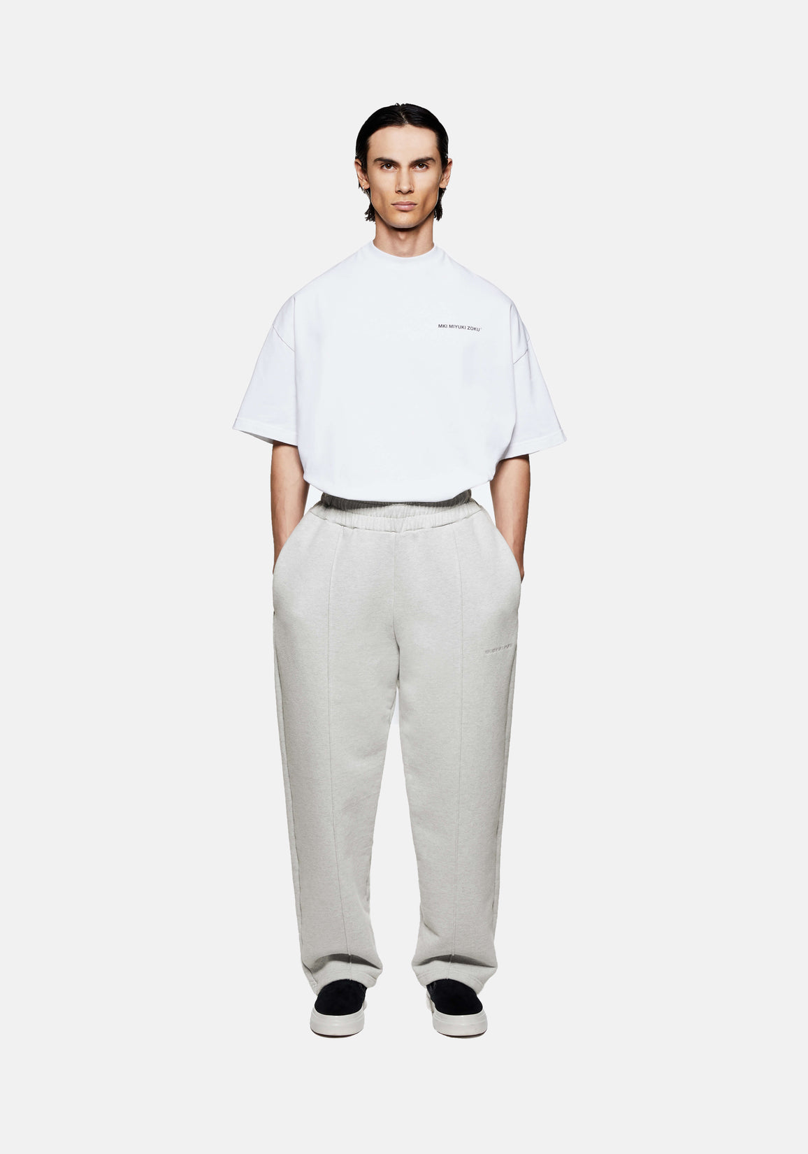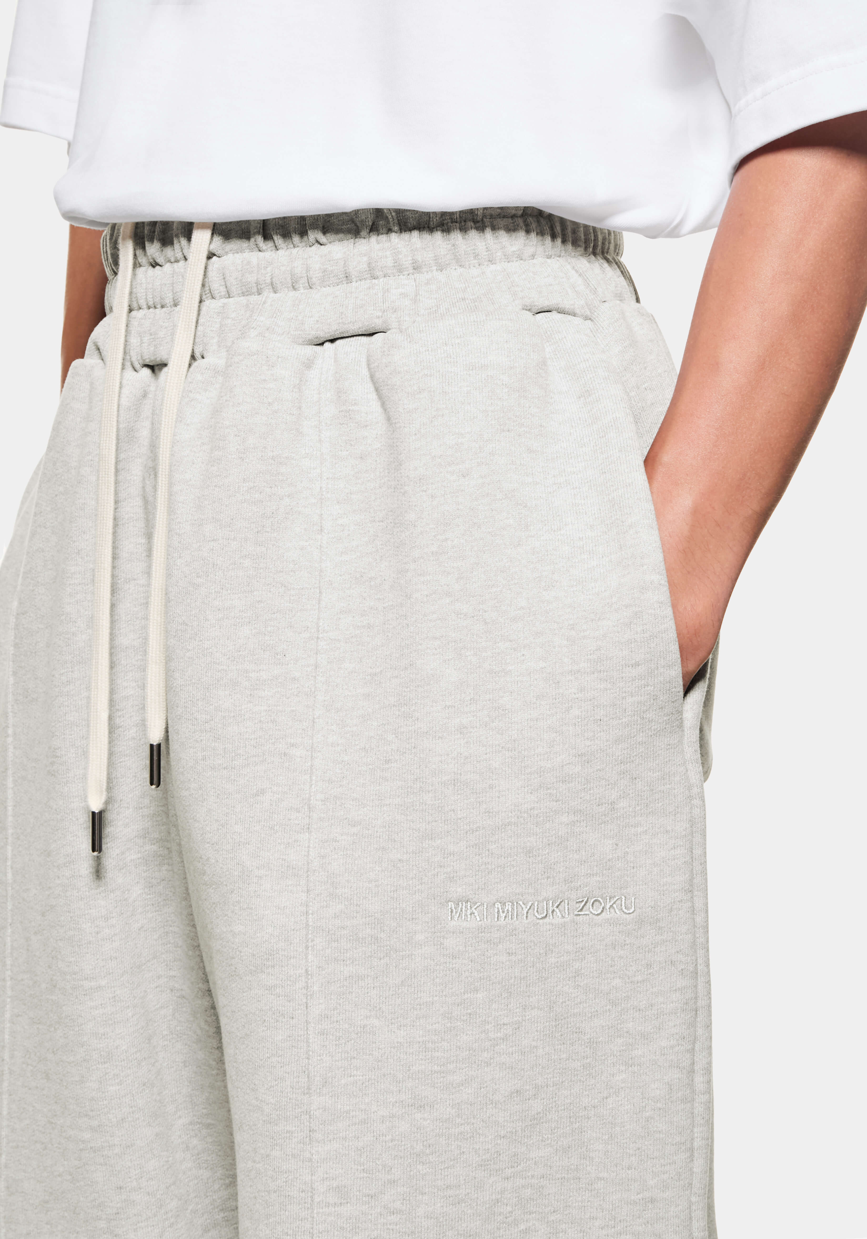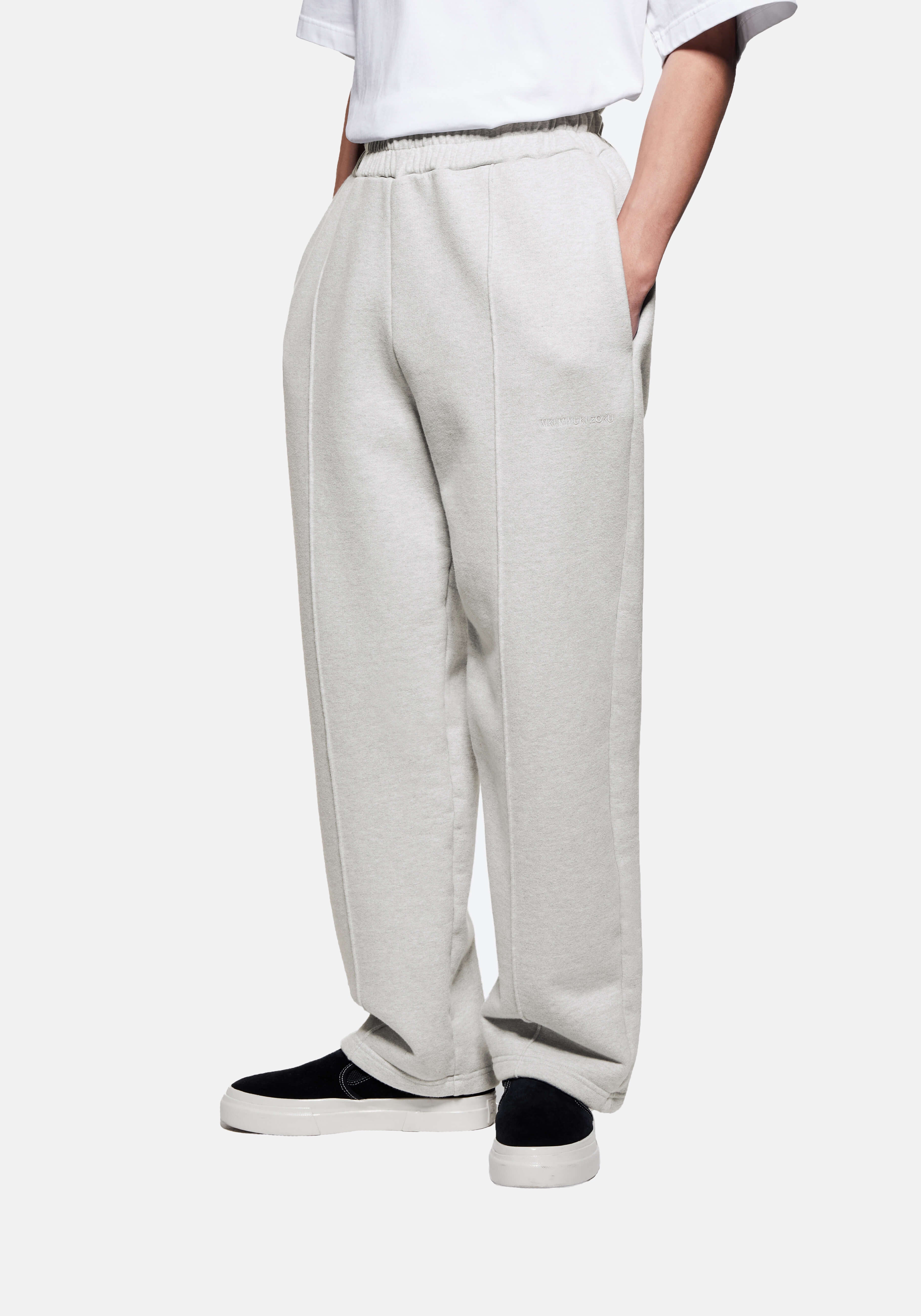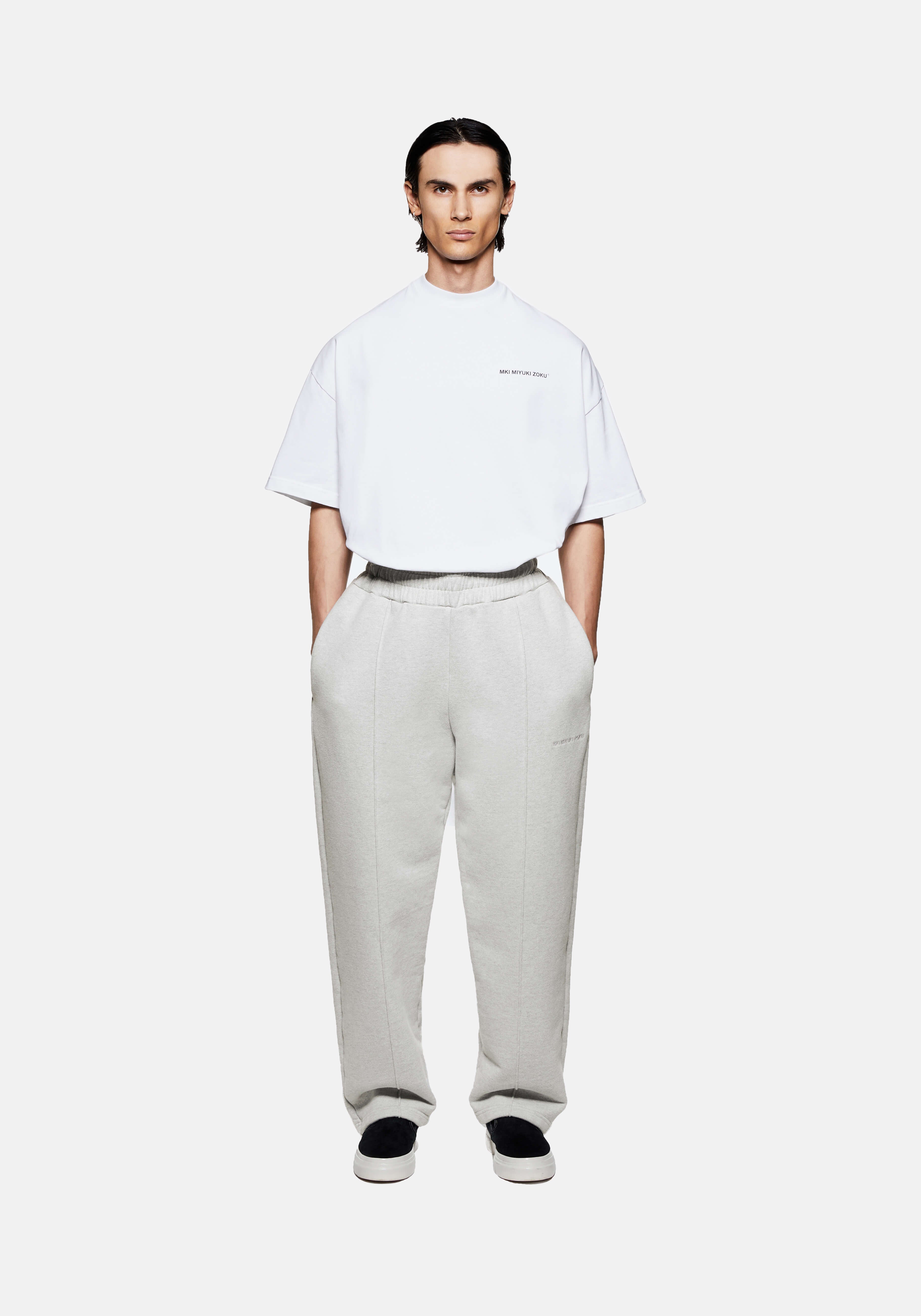 MKI 800 GSM SUPERWEIGHT WIDE LEG JOGGERS IN OATMEAL. THE MKI SUPERWEIGHT WIDE LEG JOGGERS ARE CRAFTED FROM 800GSM HEAVYWEIGHT COTTON JERSEY THAT LENDS ITSELF TO THE DRAPE-FOCUSED, LOOSE FIT OF THE DESIGN. STRUCTURE IS MAINTAINED THROUGH THE SEWN–IN FRONT PLEATS AND OPEN-HEM CONSTRUCTION, WHILE A HIDDEN DRAWSTRING AND TONAL LOGO EMBROIDERY ENHANCE THE MINIMALISM OF MKI’S SUPER HEAVYWEIGHT STYLE.