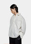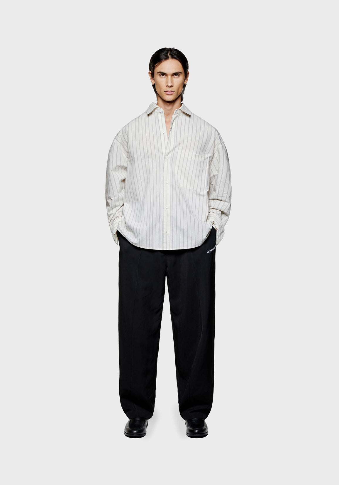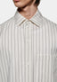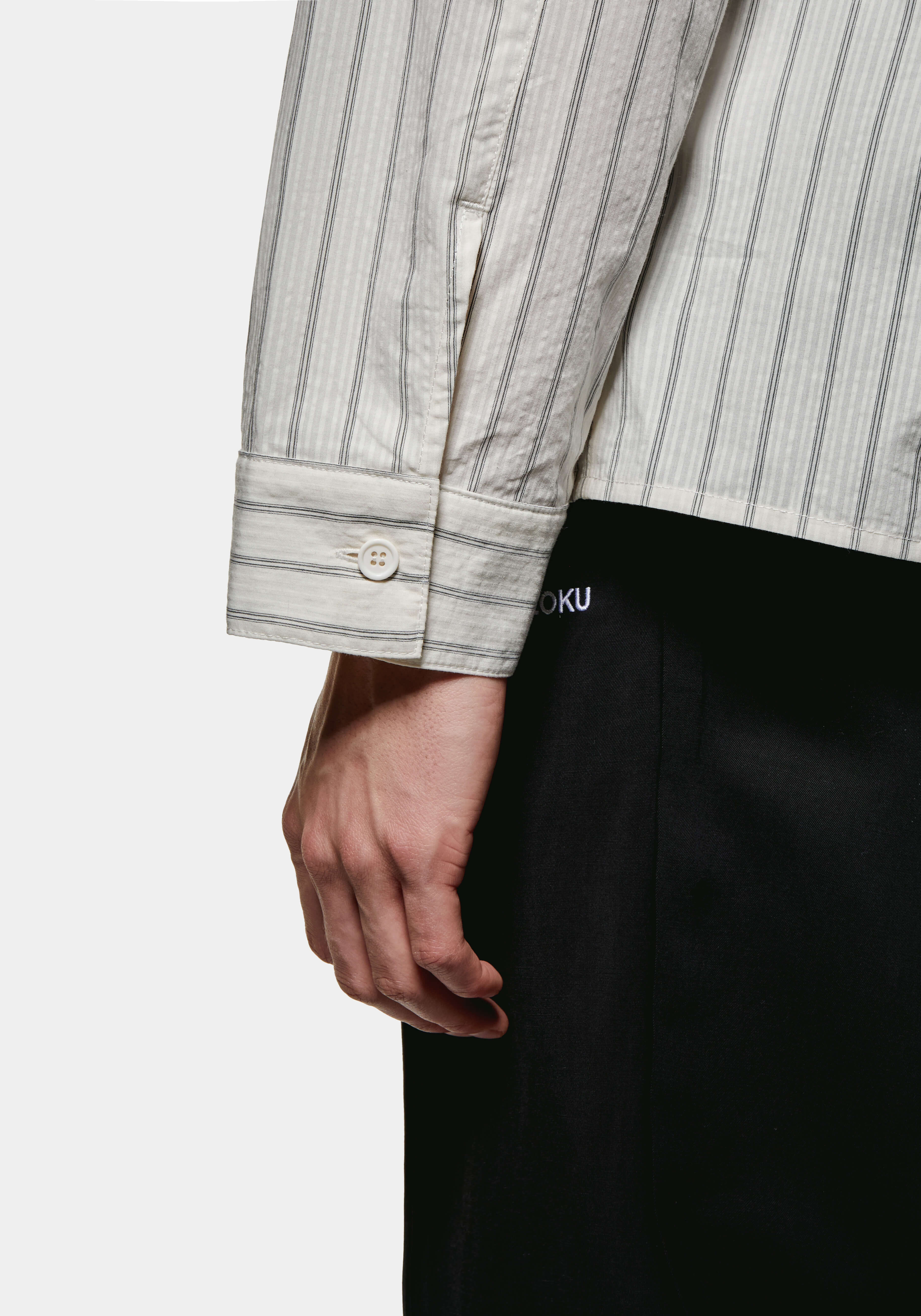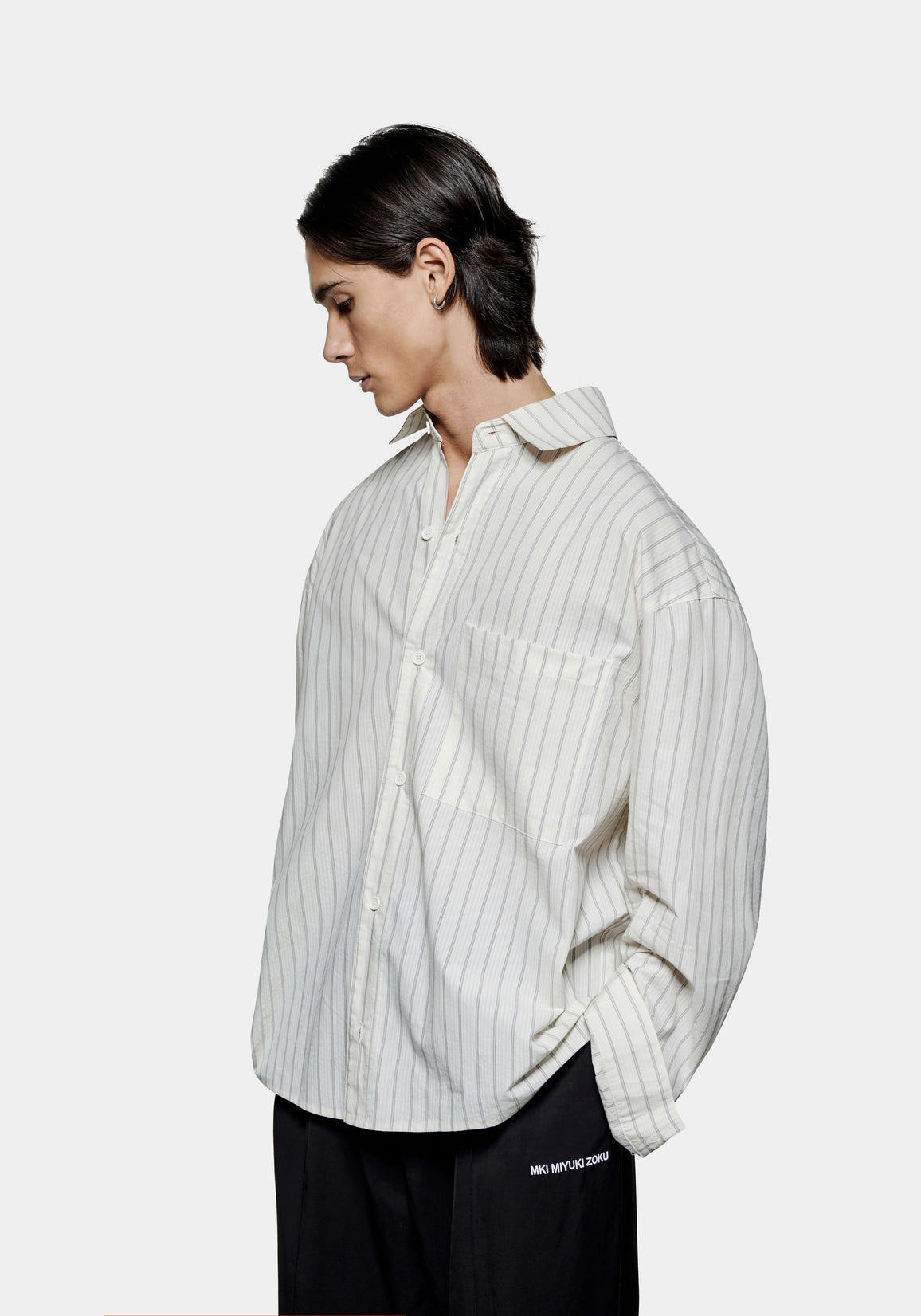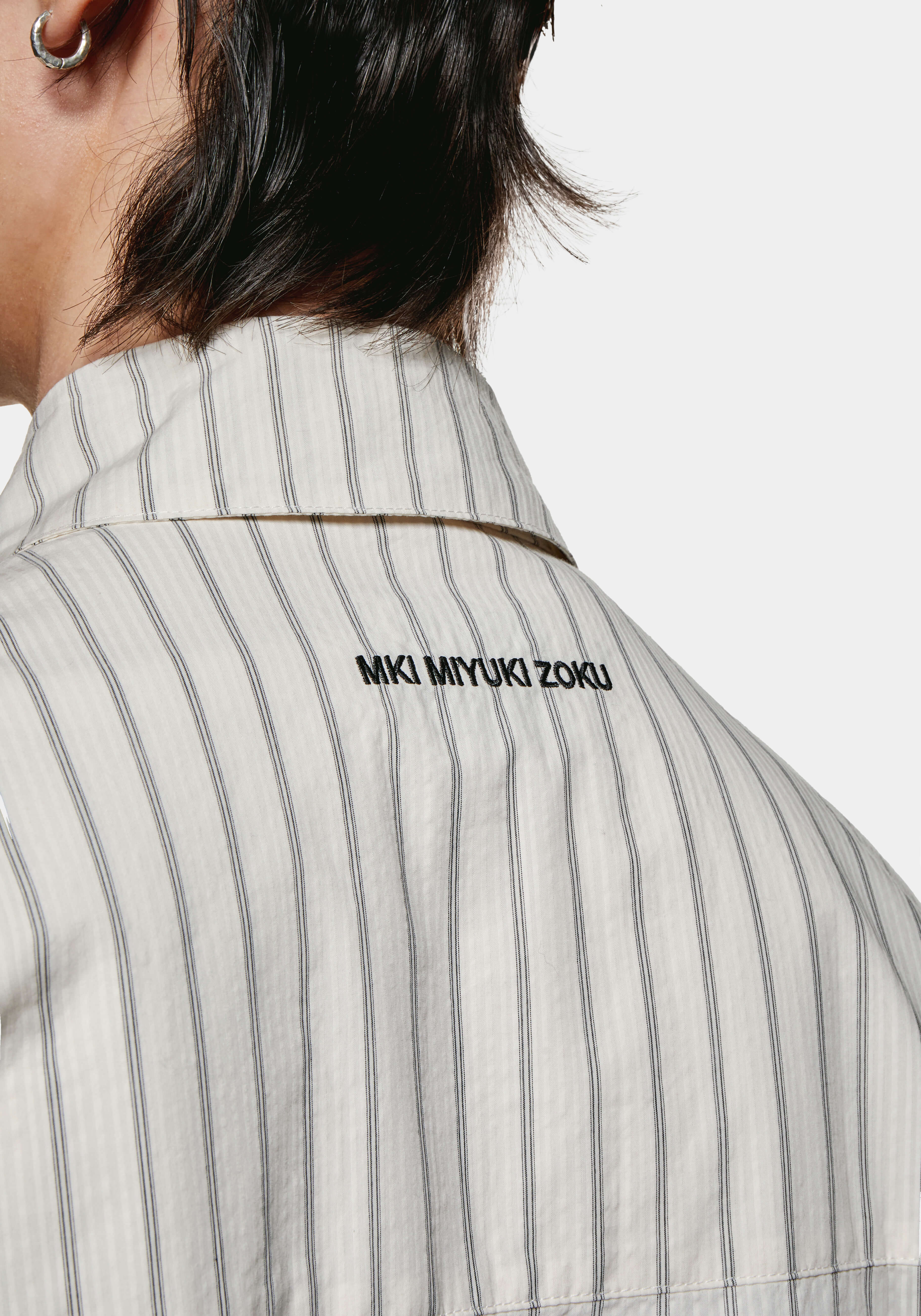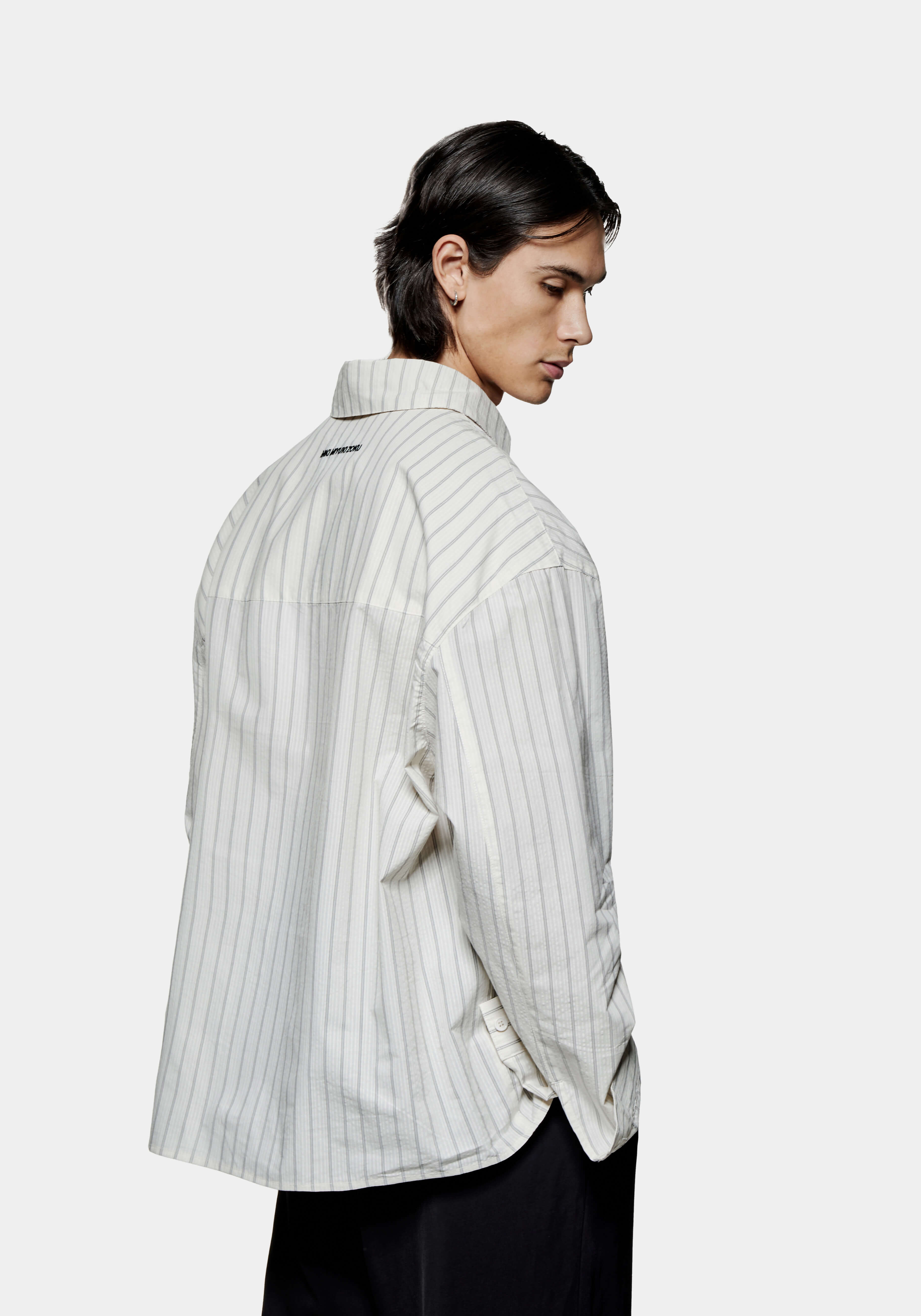 MKI BOX DRESS SHIRT IN OFF WHITE STRIPE. DESIGNED WITH AN OVERSIZED BOX FIT, THE FABRIC FEATURES A SUBTLE MICRO-SEERSUCKER TEXTURE WITH AN ENGINEERED STRIPE DESIGN.