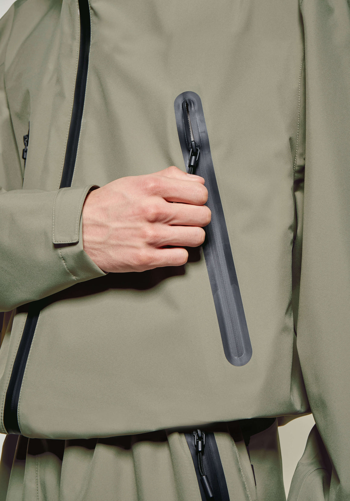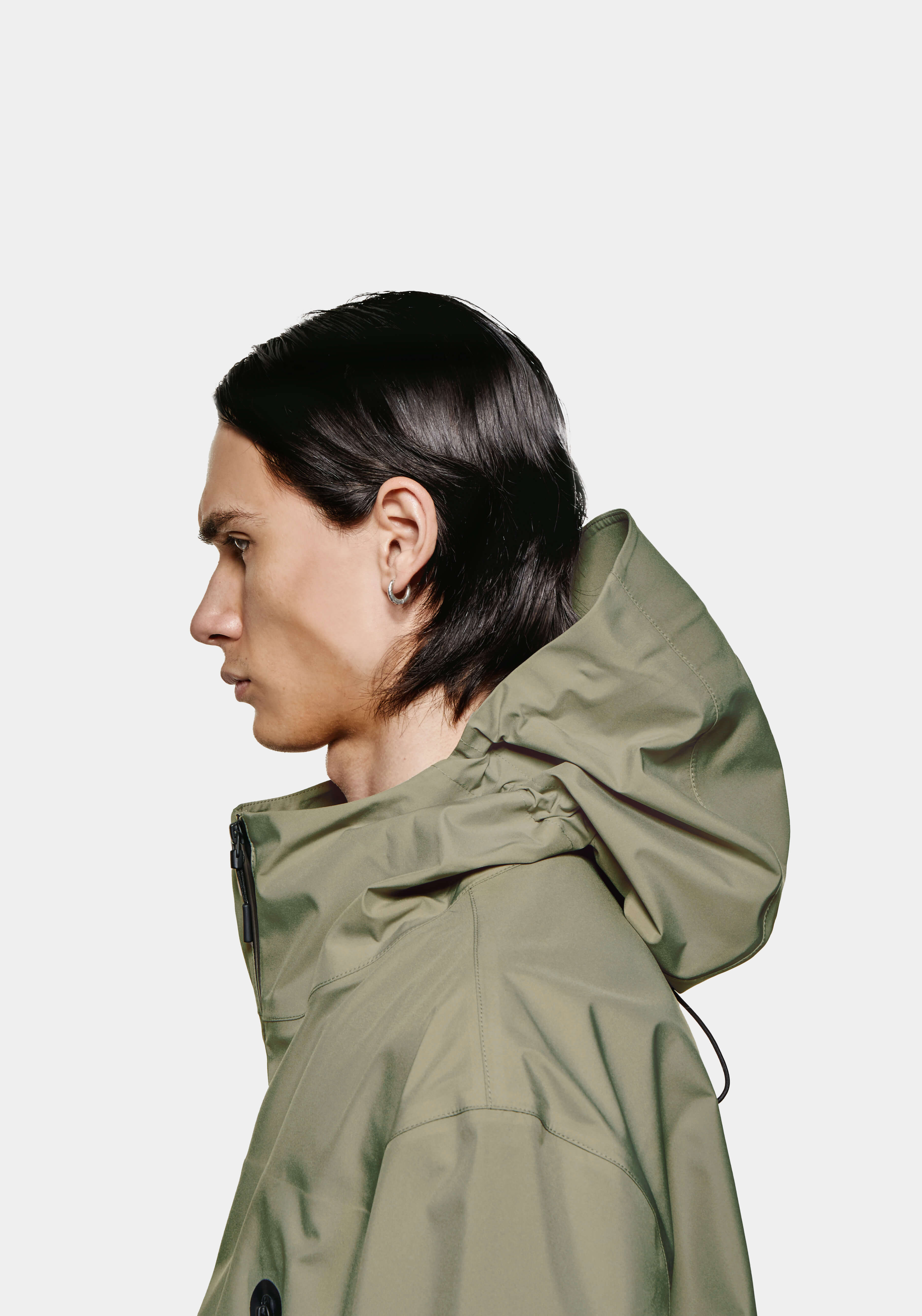 MKI V2 SHELL HOODED JACKET IN OLIVE. THE V2 SHELL COLLECTION IS CRAFTED FROM A WATERPROOF, WINDPROOF STRETCH WOVEN FABRIC WITH A COATED FINISH TO BOOST WATER-REPELLENT PERFORMANCE. THE V2 SHELL JACKET COMES EQUIPPED WITH BONDED POCKETS, TWO-WAY WATERPROOF ZIPPERS, AND TRIPLE-LAYER TAPED SEAMS FOR ADDED DURABILITY.