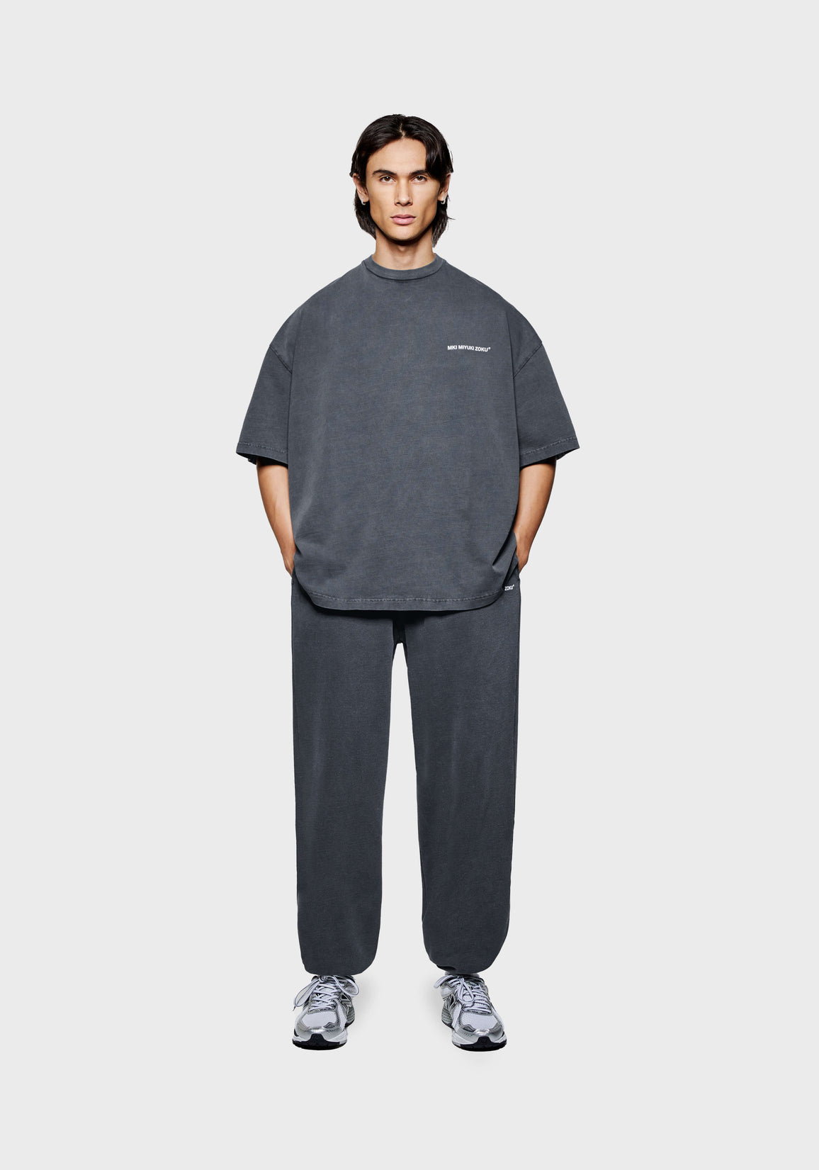 THE MODEL IS 6FT WITH A 38" CHEST AND 31" WAIST AND HAS BEEN STYLED IN A MEDIUM. THE MODEL IS ALSO WEARING MKI UNIFORM JOGGERS IN PIGMENT BLACK.