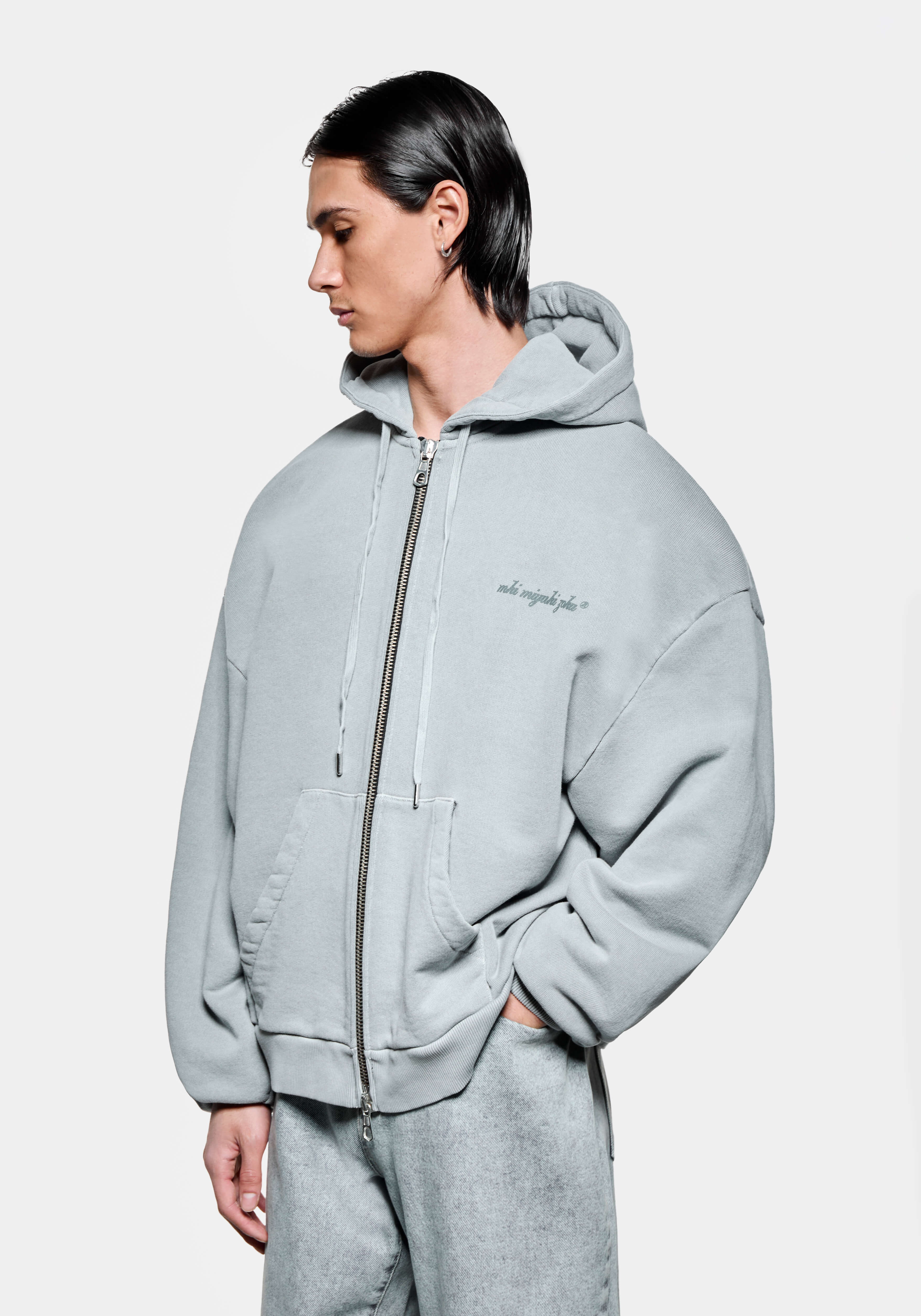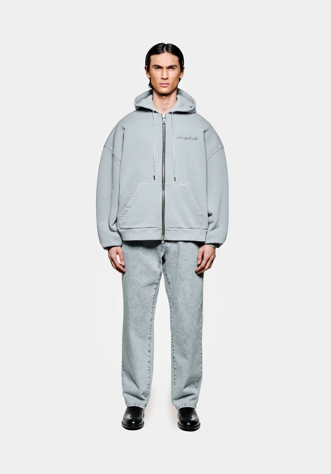 MKI INTERNATIONAL ZIP HOODY IN PIGMENT GLACIER. CRAFTED FROM 500GSM COTTON JERSEY, THE MKI INTERNATIONAL HEAVYWEIGHT ZIP HOODY IS AVAILABLE IN A COOL SHADE OF PIGMENT GLACIER. CONSTRUCTED IN MKI’S SIGNATURE OVERSIZED BOX FIT, THE FULL-ZIP STYLE DISPLAYS BOLD RENDITIONS OF MKI MIYUKI ZOKU BRANDING, SCREEN-PRINTED AT THE CHEST AND BACK. STAPLE MKI DETAILS INCLUDE THE DOUBLE TWO-WAY ZIPS AND TWIN FRONT POCKETS. A DOUBLE-LAYER HOOD WITH METAL-TIPPED DRAWSTRINGS COMPLETES THE DESIGN.