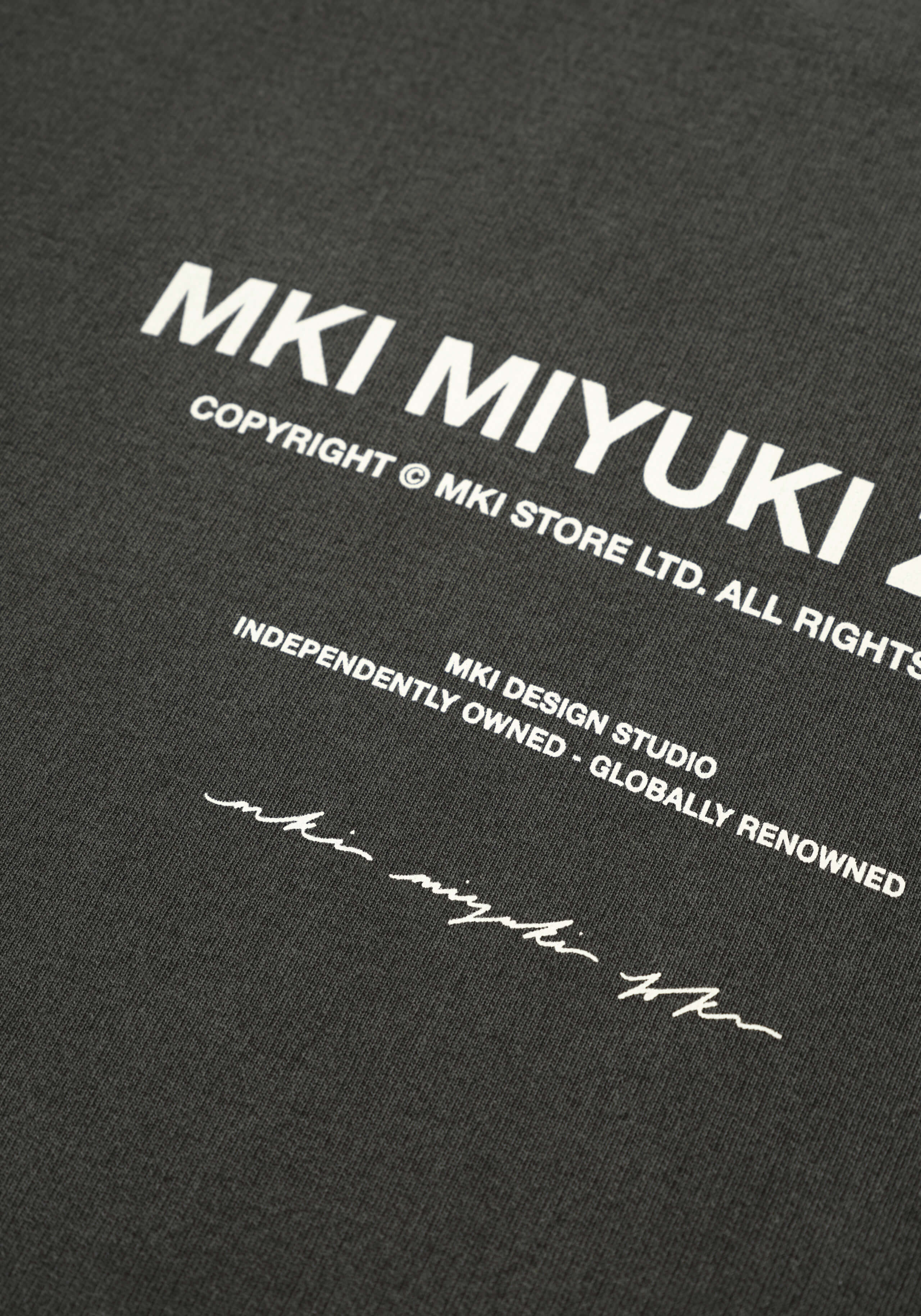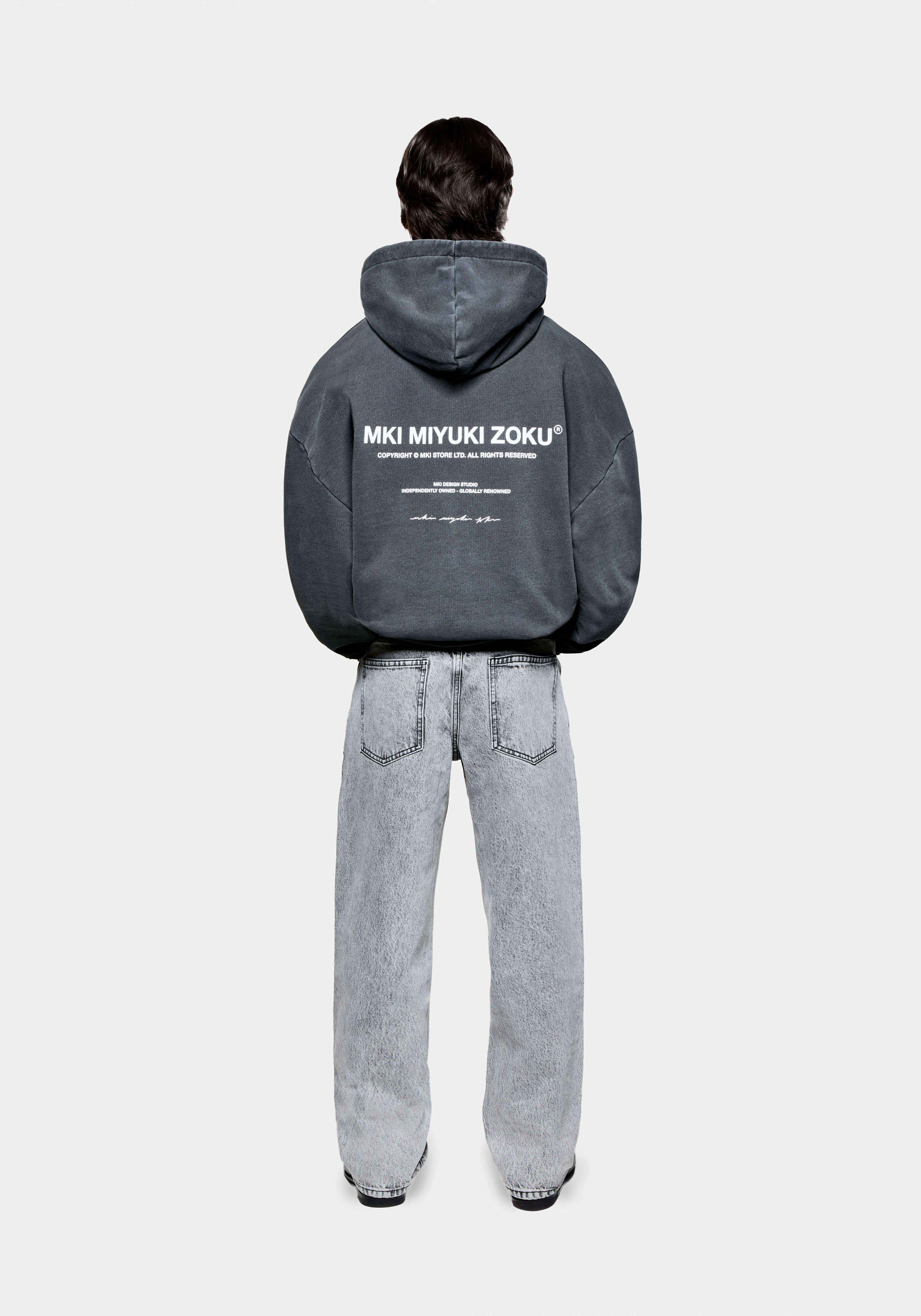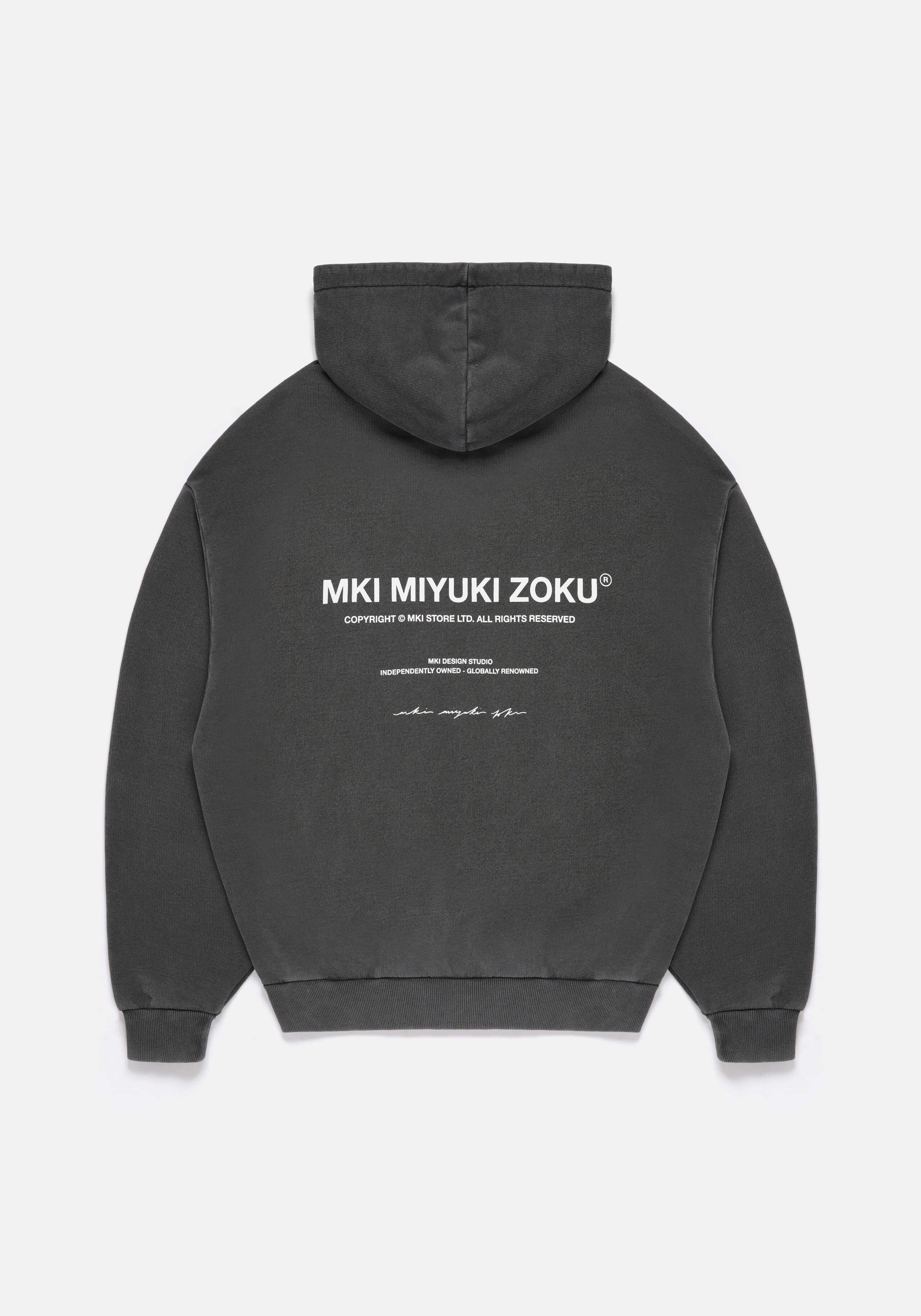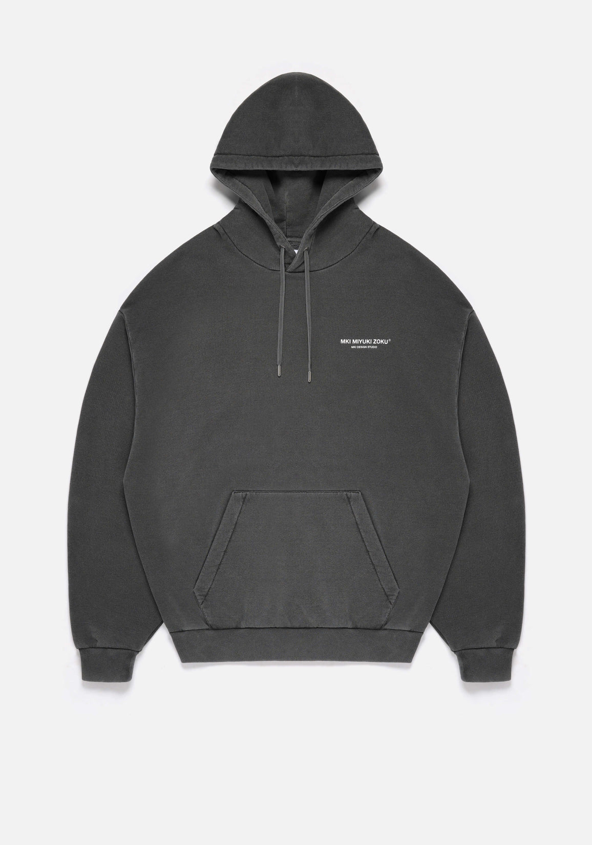 MKI DESIGN STUDIO HOODY IN PIGMENT BLACK. THE MKI DESIGN STUDIO HOODY PROVIDES THE IDEAL, OVERSIZED BOX FIT, PRESENTED IN PIGMENT BLACK WITH CONTRASTING BRANDING, SCREEN-PRINTED AT THE LEFT CHEST AND REAR. DROPPED SHOULDERS DEFINE THE STRUCTURED SILHOUETTE OF THE 500GSM, HEAVYWEIGHT COTTON JERSEY BASE, WHILE A DOUBLE-LAYER HOOD, DRAWSTRINGS AND FRONT POUCH POCKET REINFORCE FUNCTIONALITY.