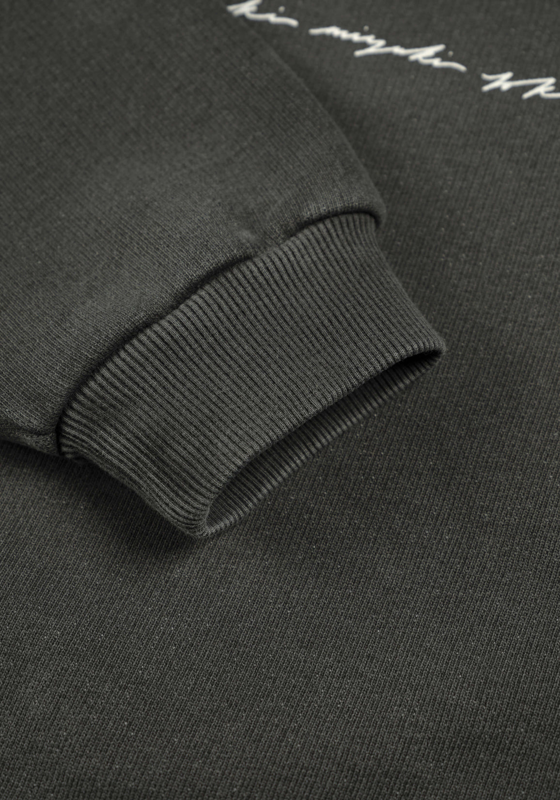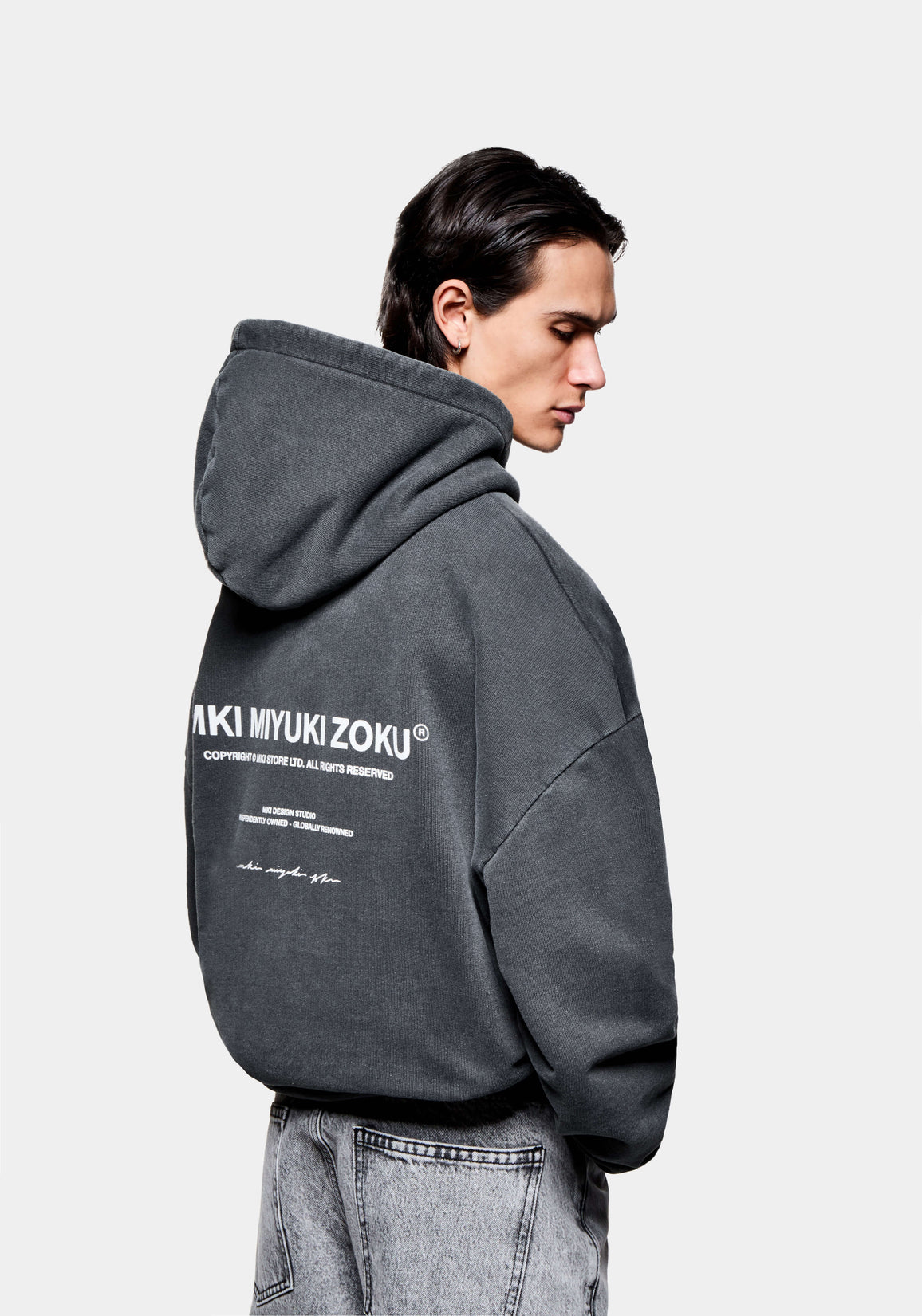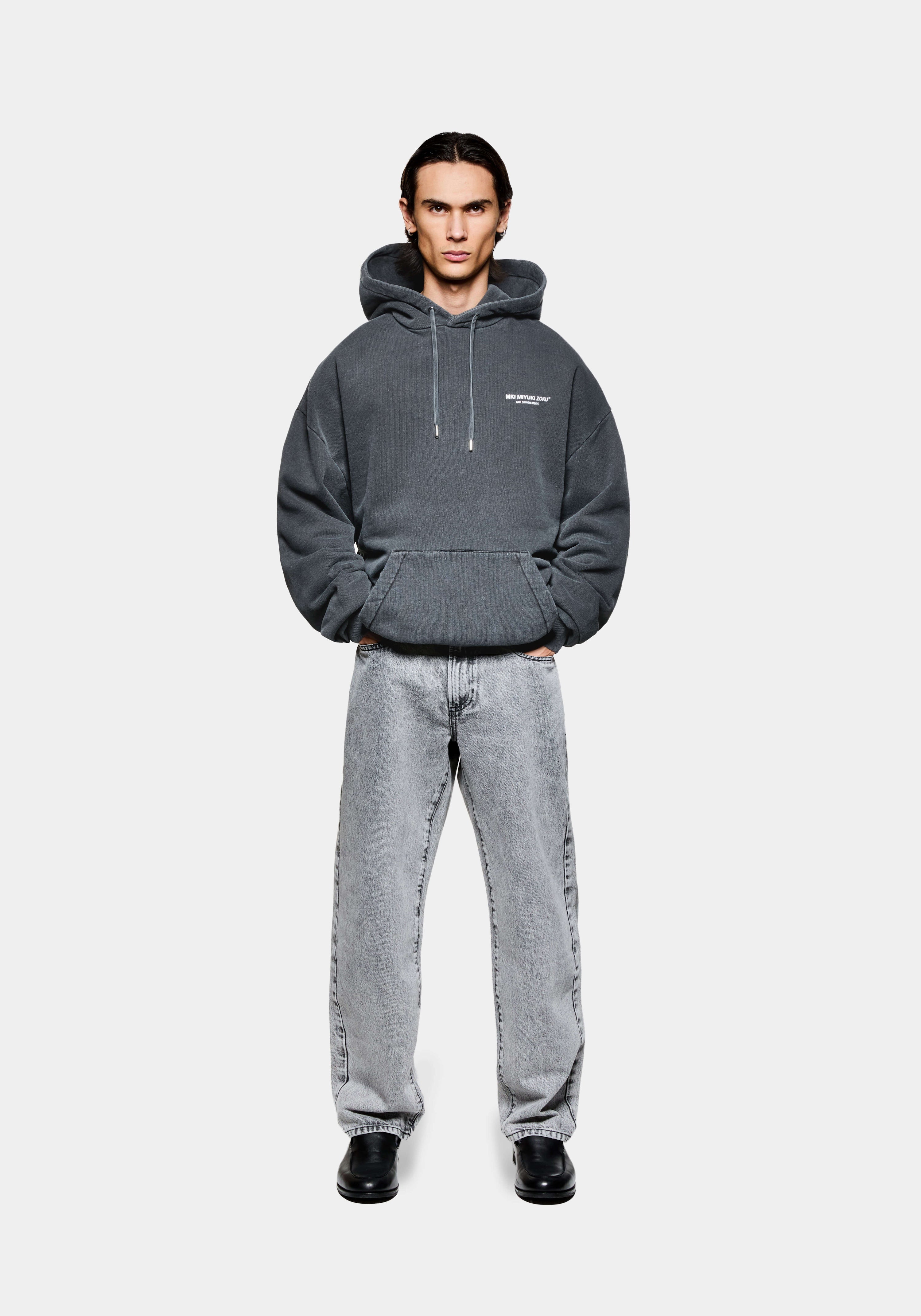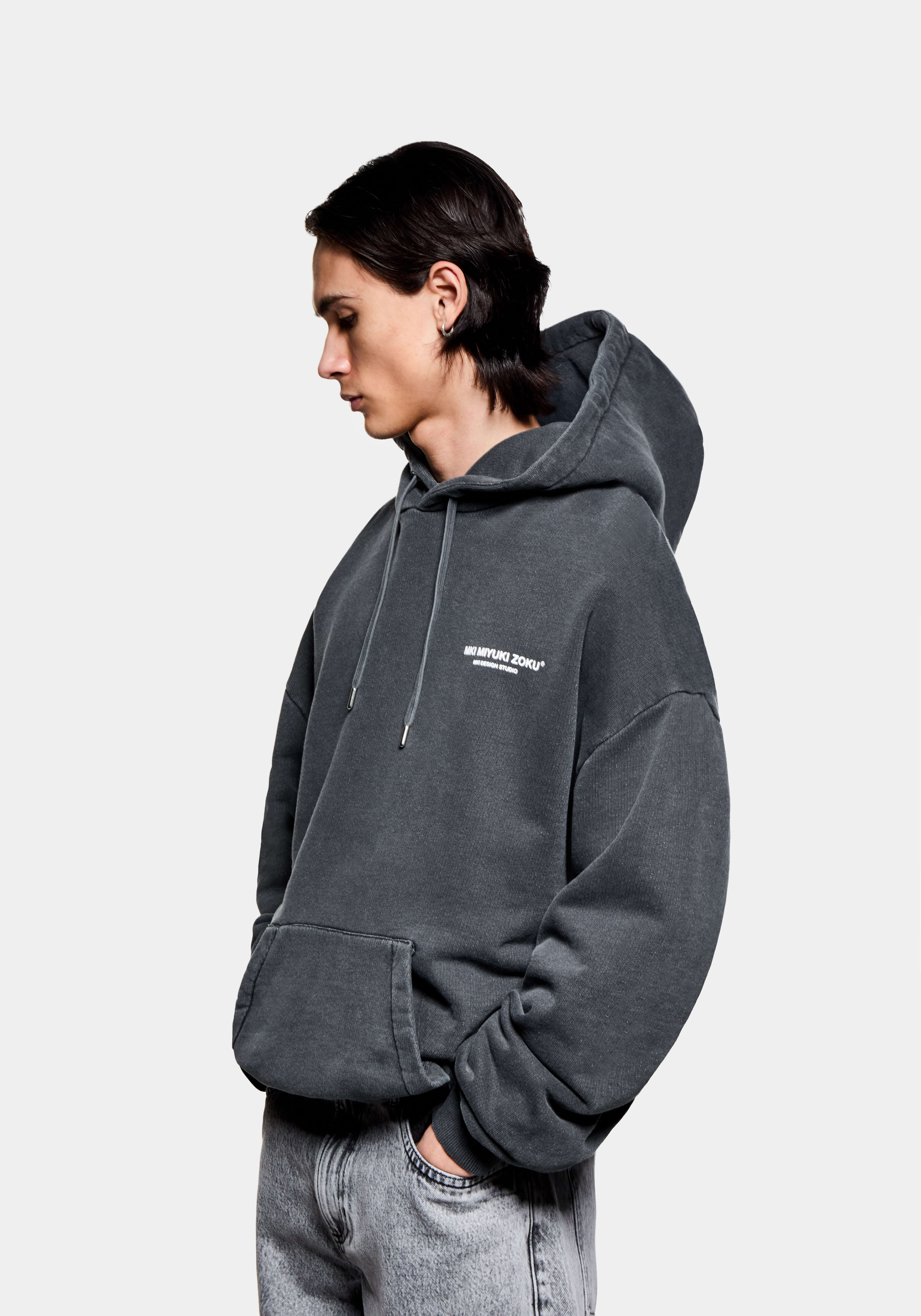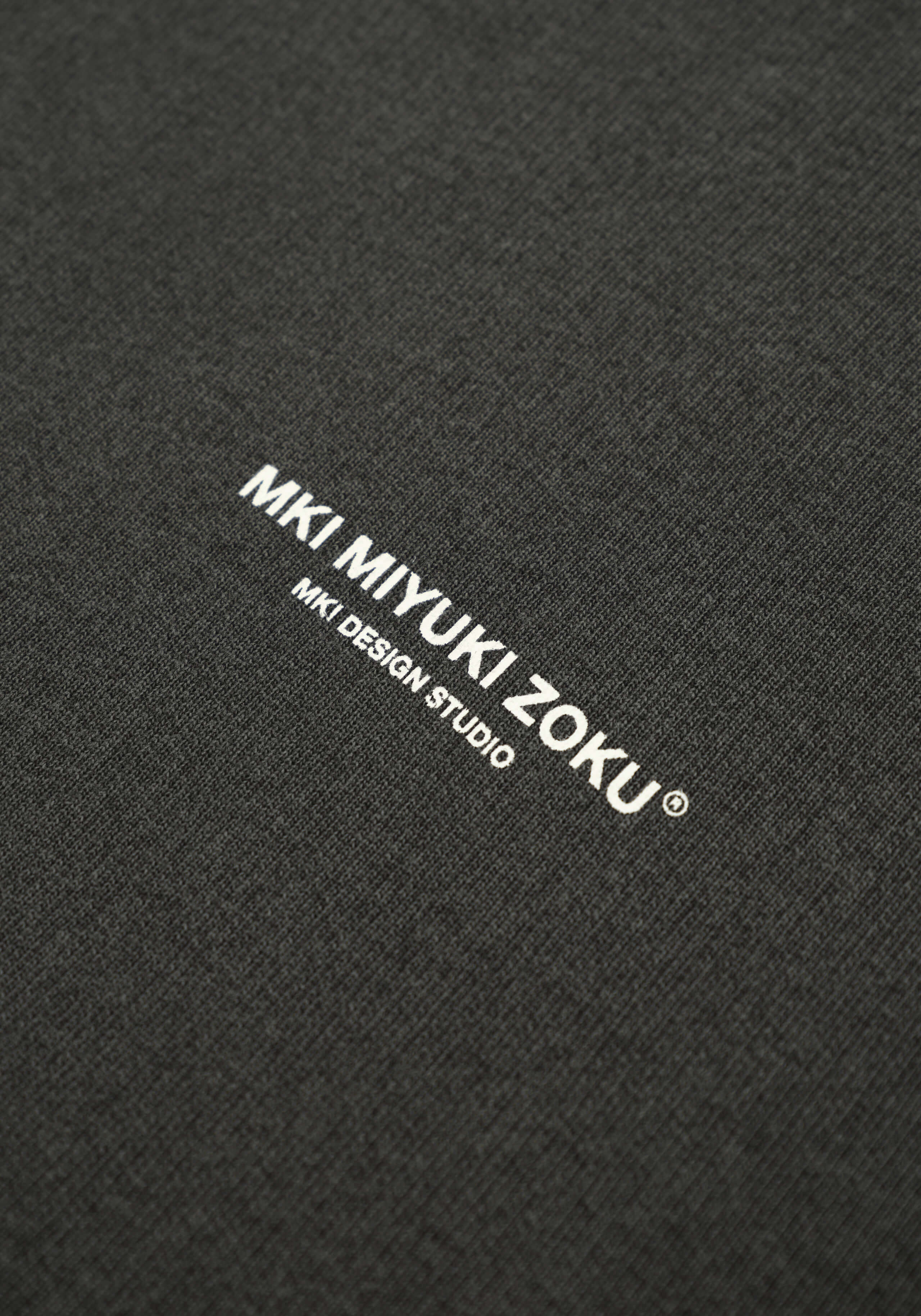 MKI DESIGN STUDIO HOODY IN PIGMENT BLACK. THE MKI DESIGN STUDIO HOODY PROVIDES THE IDEAL, OVERSIZED BOX FIT, PRESENTED IN PIGMENT BLACK WITH CONTRASTING BRANDING, SCREEN-PRINTED AT THE LEFT CHEST AND REAR. DROPPED SHOULDERS DEFINE THE STRUCTURED SILHOUETTE OF THE 500GSM, HEAVYWEIGHT COTTON JERSEY BASE, WHILE A DOUBLE-LAYER HOOD, DRAWSTRINGS AND FRONT POUCH POCKET REINFORCE FUNCTIONALITY.