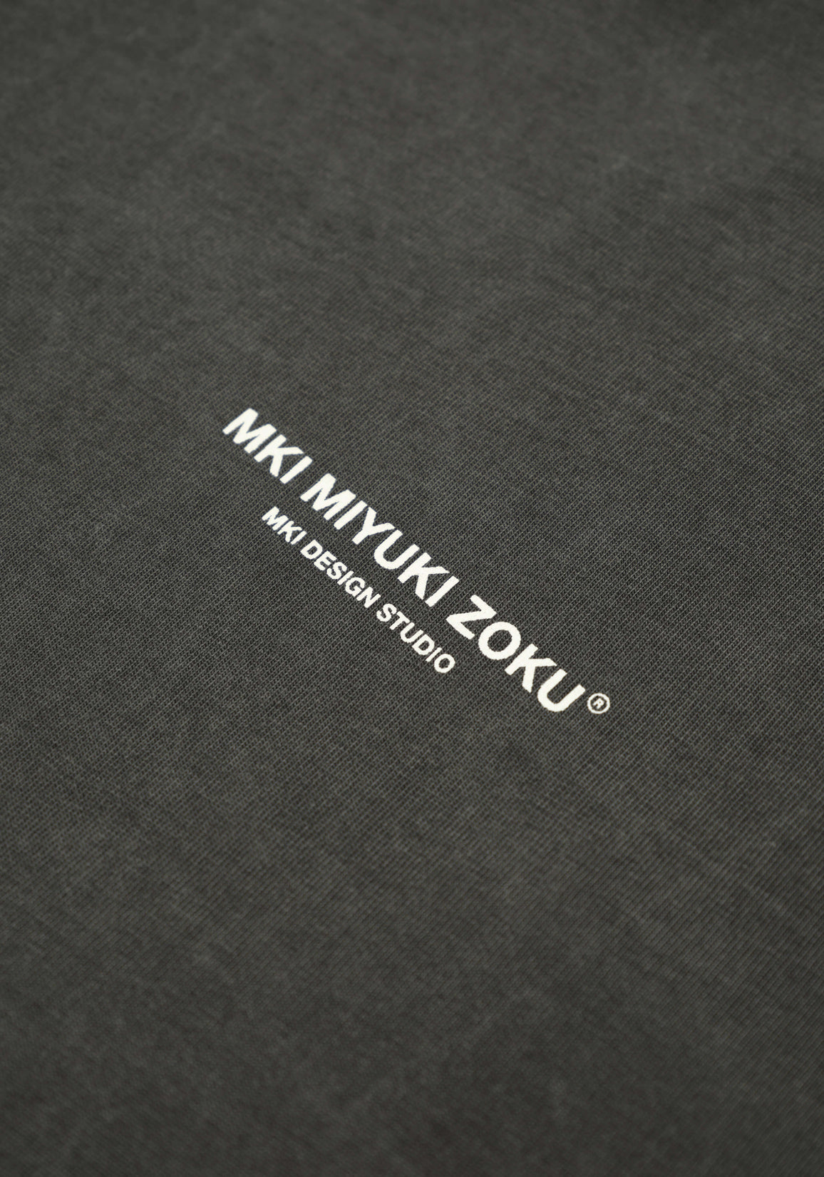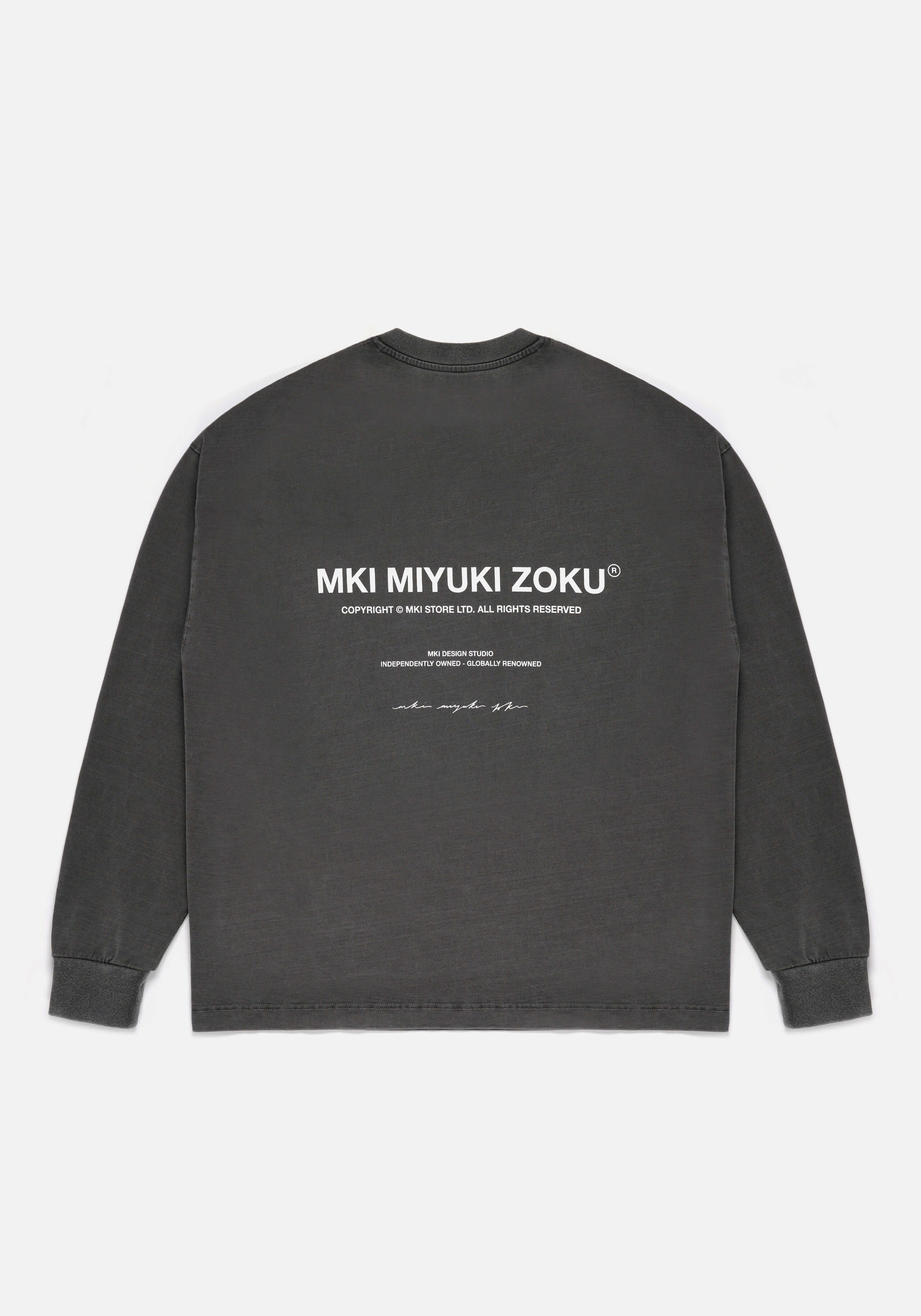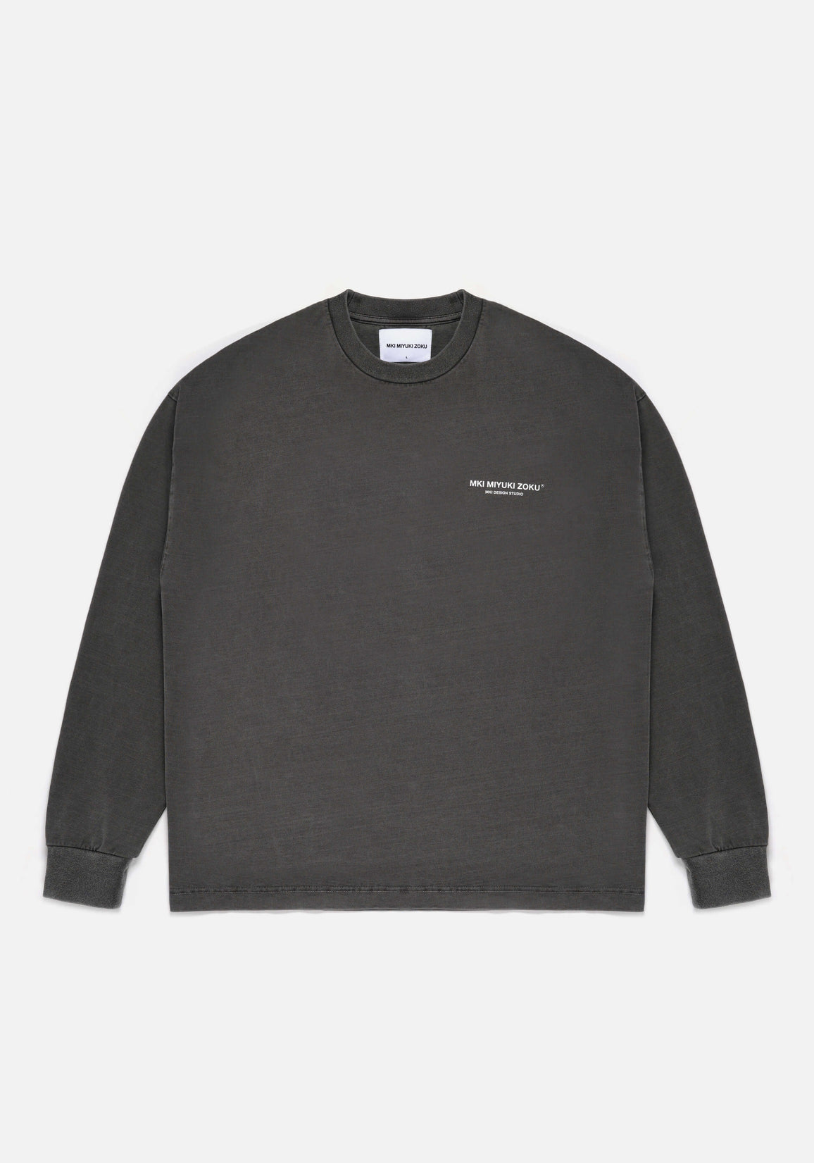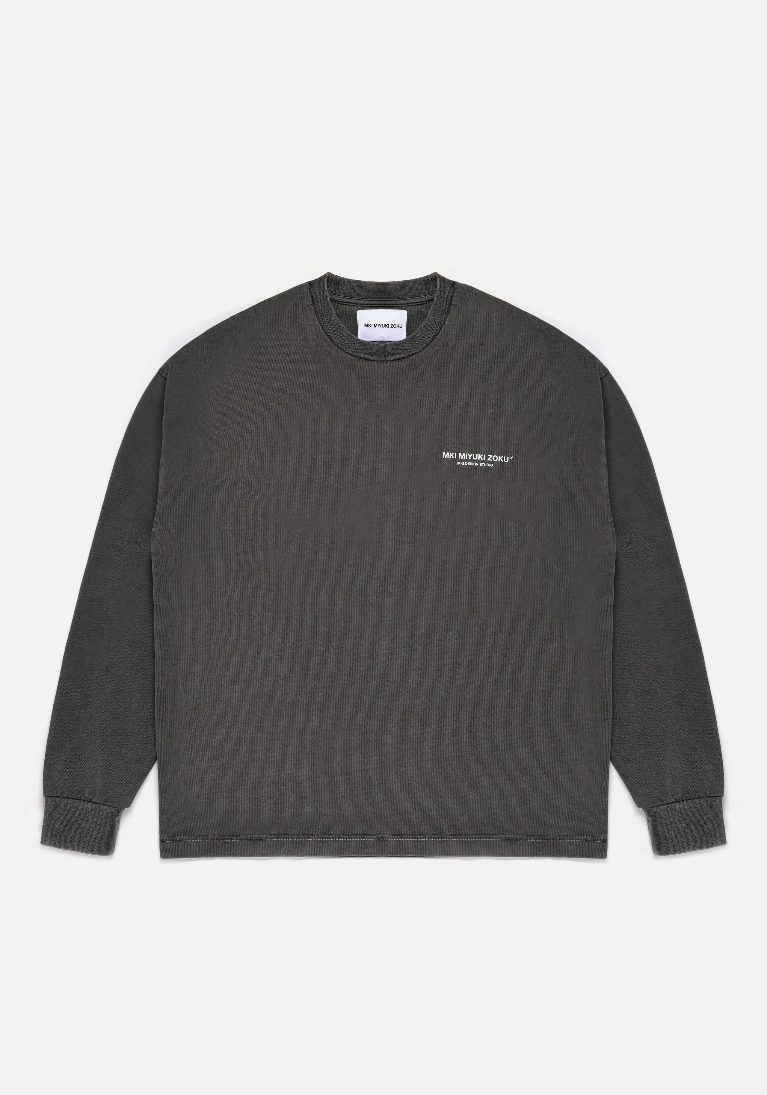 MKI DESIGN STUDIO LONGSLEEVE T-SHIRT IN PIGMENT BLACK. CRAFTED FROM 300GSM HEAVYWEIGHT COTTON JERSEY, THE MKI DESIGN STUDIO LONGSLEEVE ACHIEVES MKI’S SIGNATURE OVERSIZED BOX FIT THROUGH THE DROPPED-SHOULDER BUILD AND CLOSE-FITTING NECKLINE. A SPECIAL WASHING PROCESS ADDS DEPTH TO THE FADED PIGMENT BLACK COLOURWAY, WHILE WHITE DESIGN STUDIO GRAPHICS CREATE CONTRAST AT THE LEFT CHEST AND BACK.