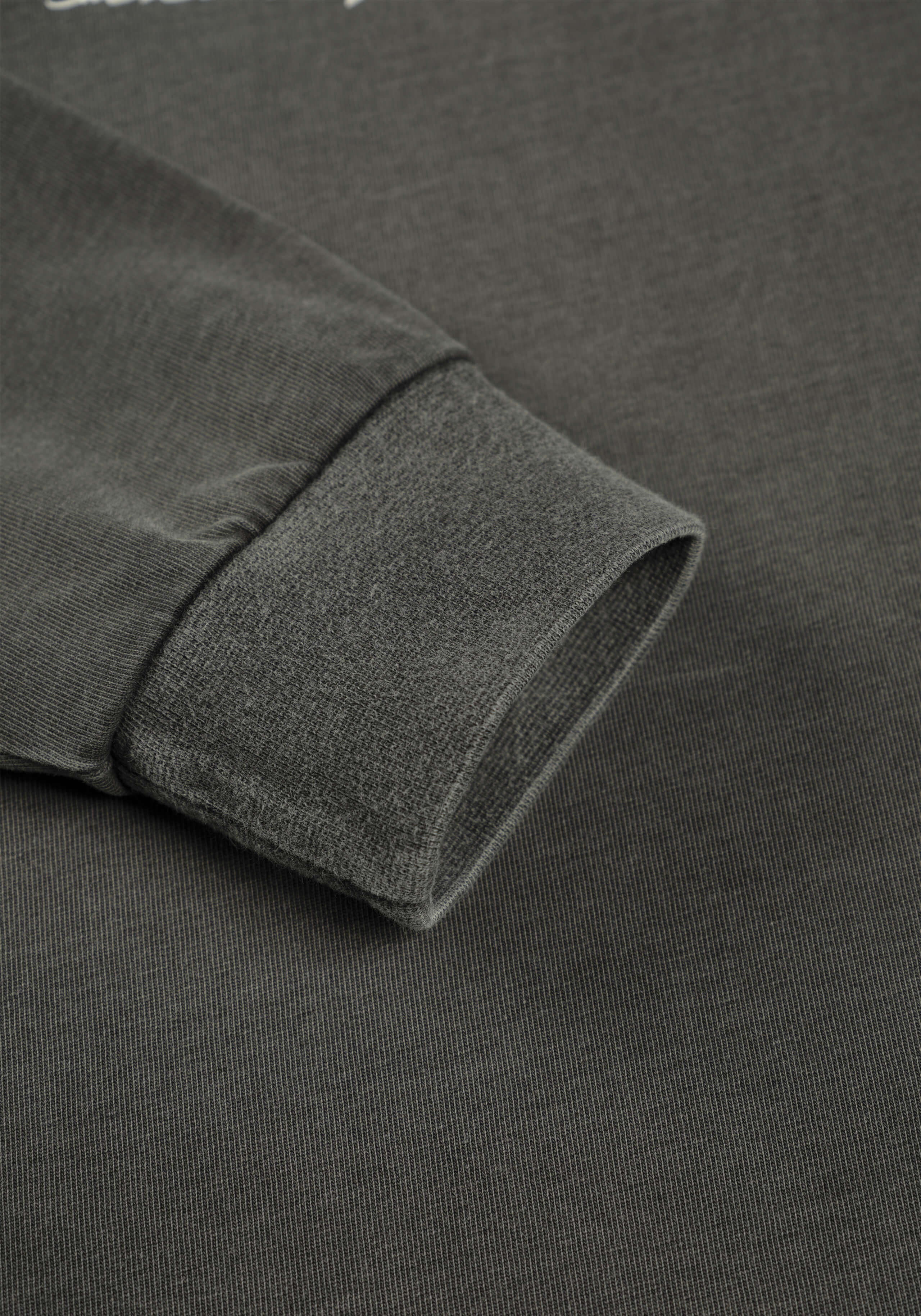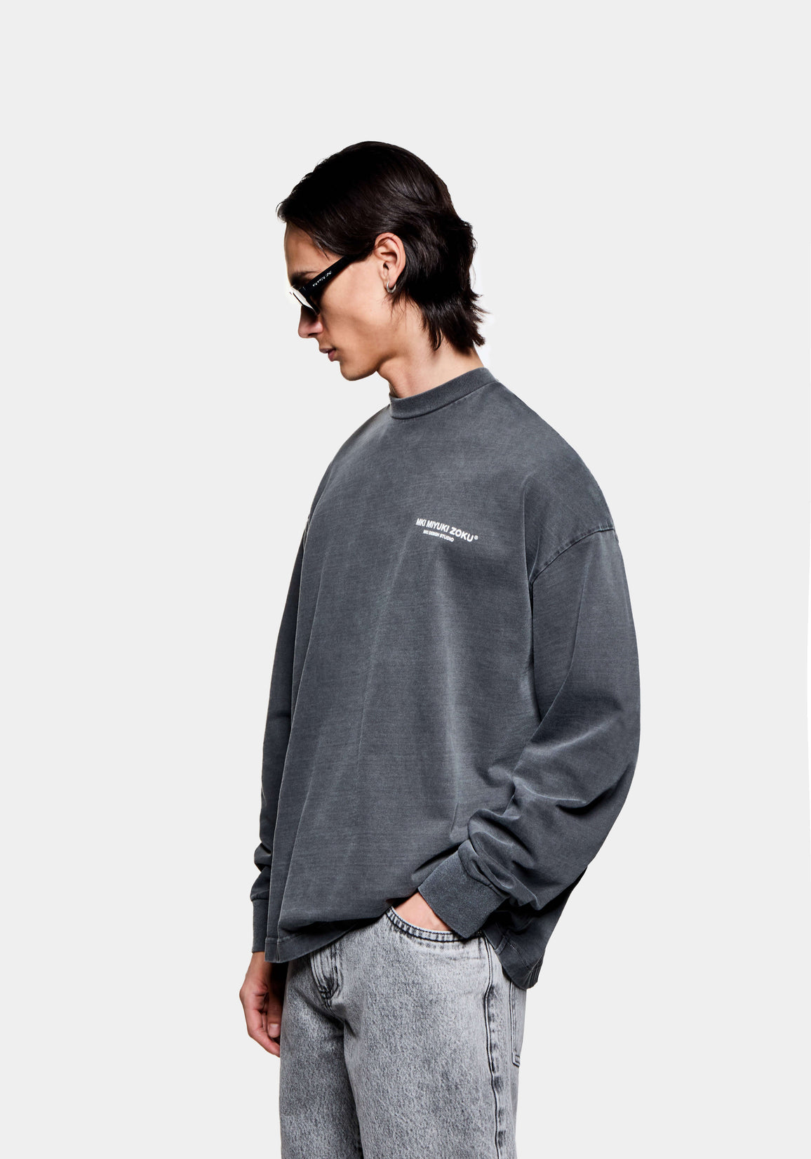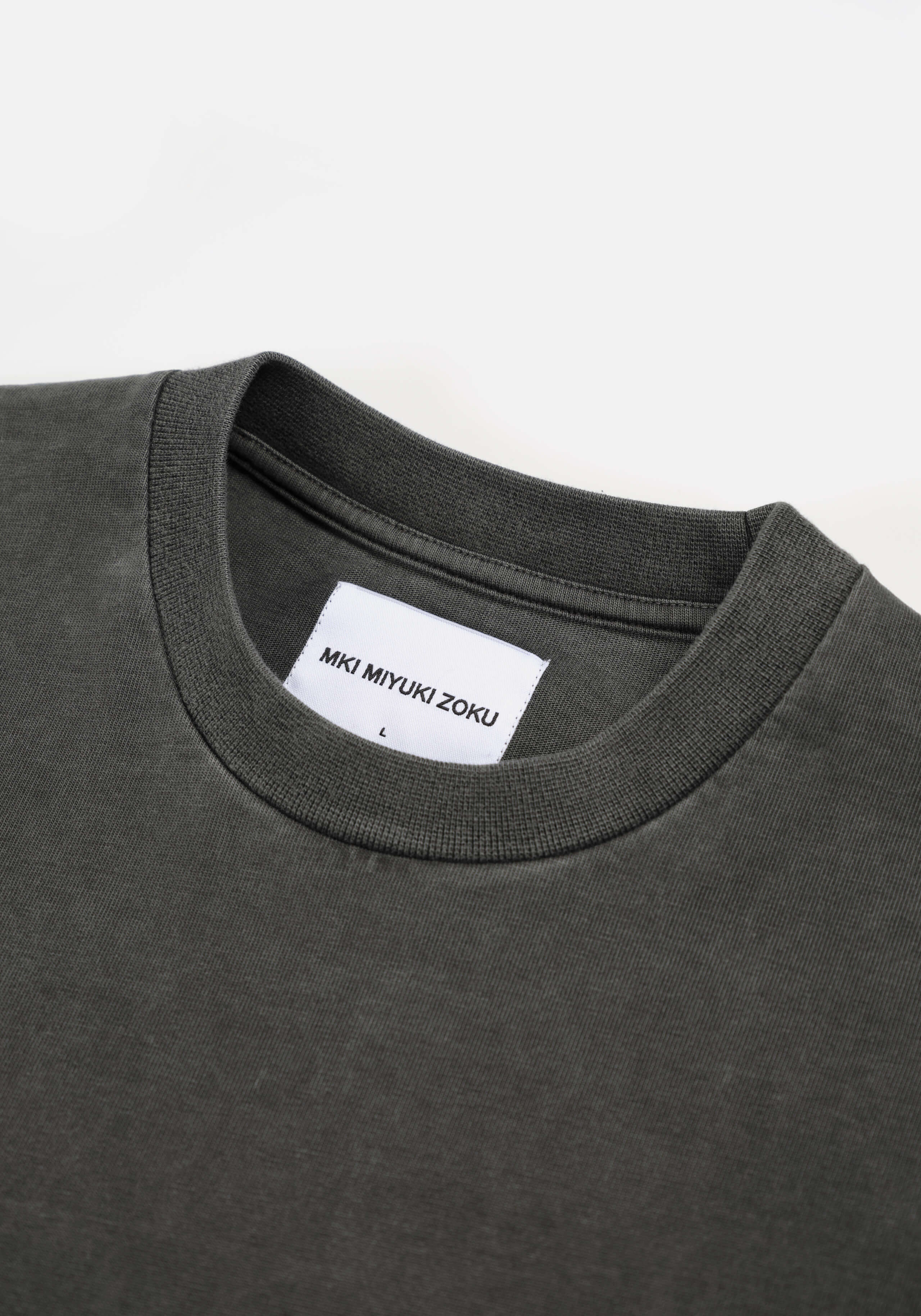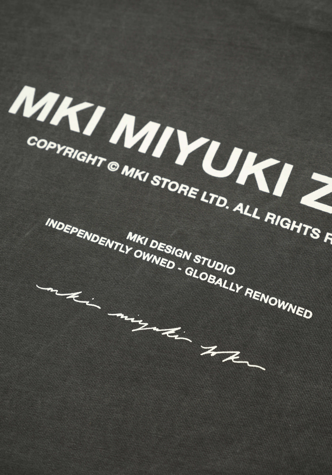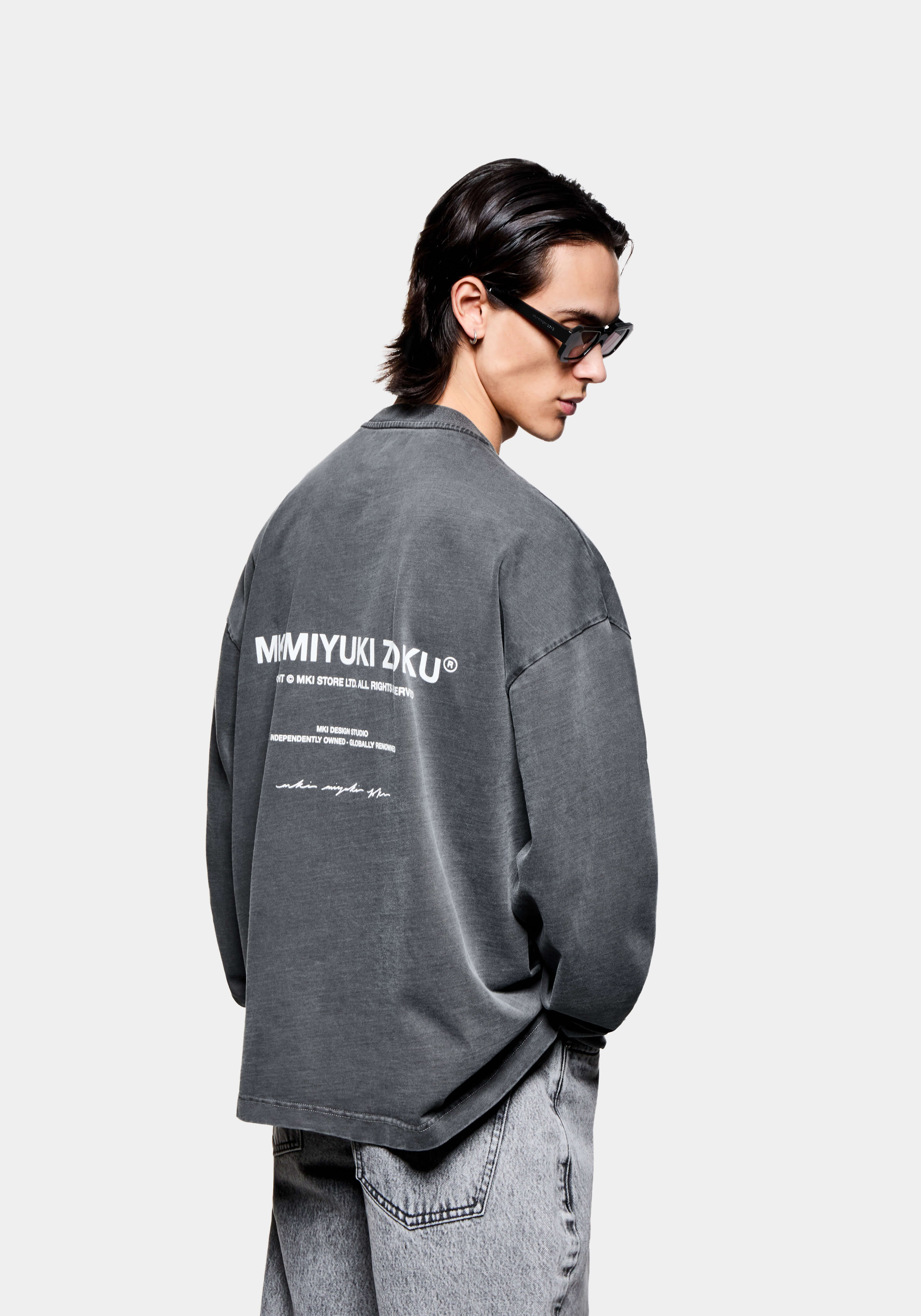 MKI DESIGN STUDIO LONGSLEEVE T-SHIRT IN PIGMENT BLACK. CRAFTED FROM 300GSM HEAVYWEIGHT COTTON JERSEY, THE MKI DESIGN STUDIO LONGSLEEVE ACHIEVES MKI’S SIGNATURE OVERSIZED BOX FIT THROUGH THE DROPPED-SHOULDER BUILD AND CLOSE-FITTING NECKLINE. A SPECIAL WASHING PROCESS ADDS DEPTH TO THE FADED PIGMENT BLACK COLOURWAY, WHILE WHITE DESIGN STUDIO GRAPHICS CREATE CONTRAST AT THE LEFT CHEST AND BACK.