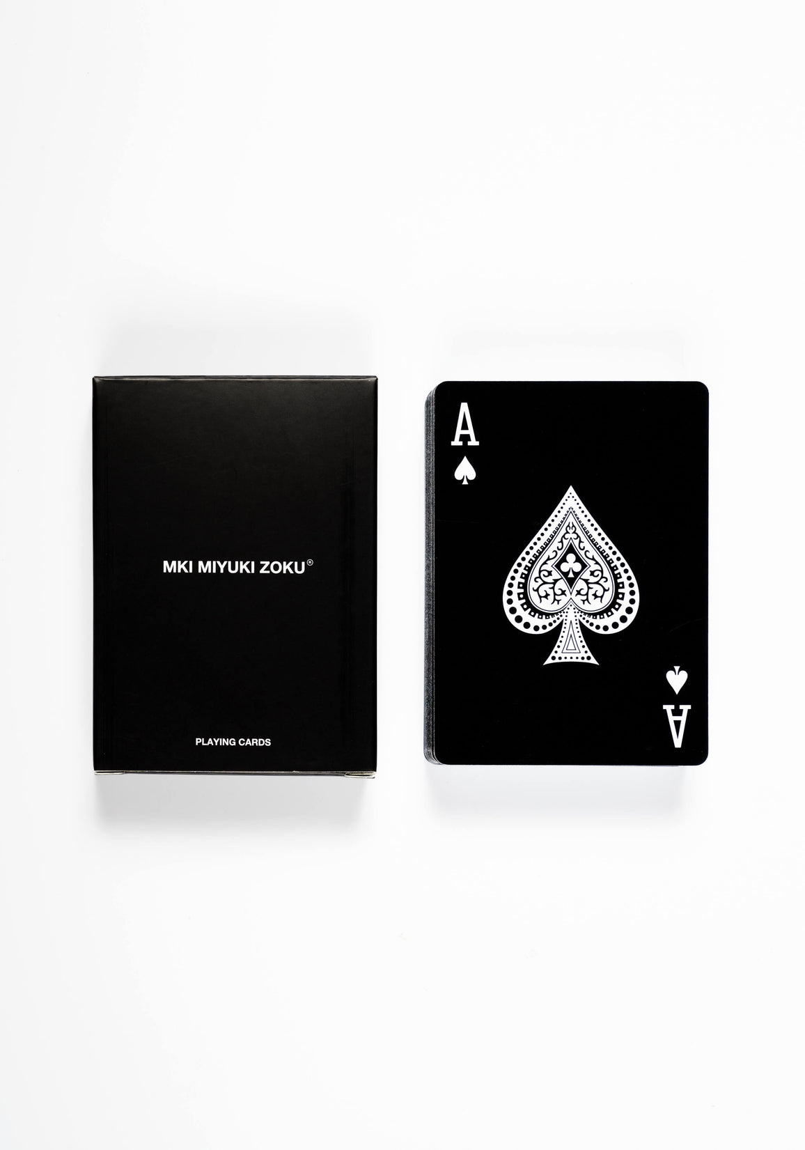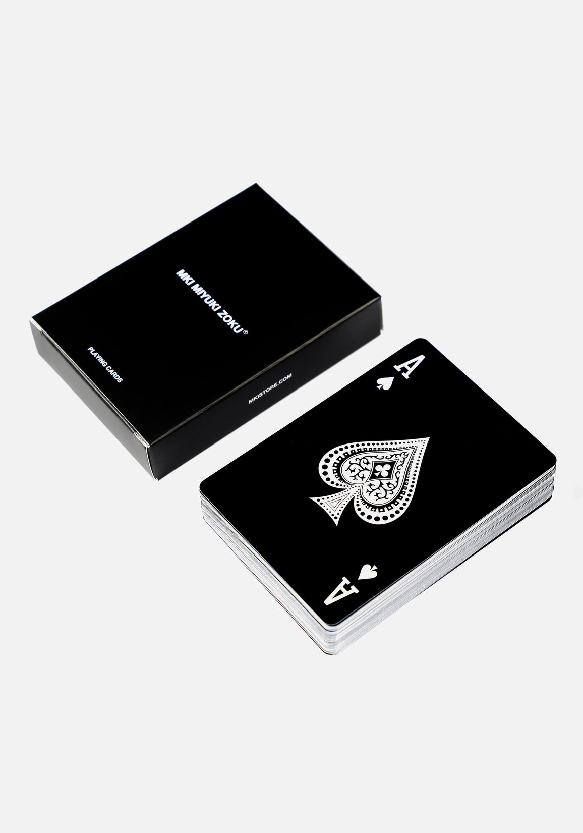 DECK OF EXCLUSIVE MKI MIYUKI ZOKU BRANDED PLAYING CARDS. A DECK OF 52 CUSTOM MKI PLAYING CARDS FEATURING TRADITIONAL GAMING IMAGERY, PRESENTED IN THE MONOCHROMATIC COLOUR PALETTE SYNONYMOUS WITH THE MKI BRAND. PACKAGED IN A BRANDED BOX, THE CARDS ARE TREATED WITH A PREMIUM, AIR CUSHION FINISH THAT ALLOWS THE CARDS TO GLIDE SMOOTHLY OVER ONE ANOTHER WHEN SHUFFLING.