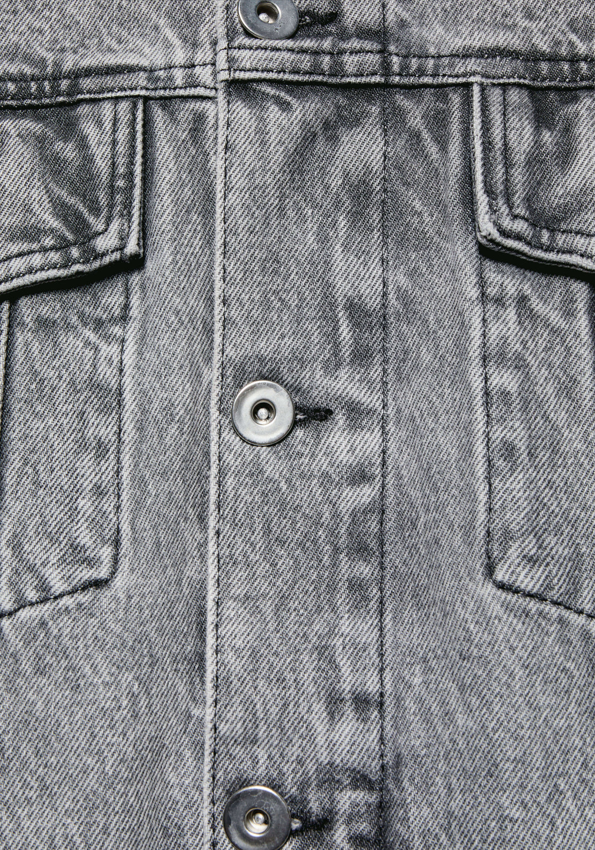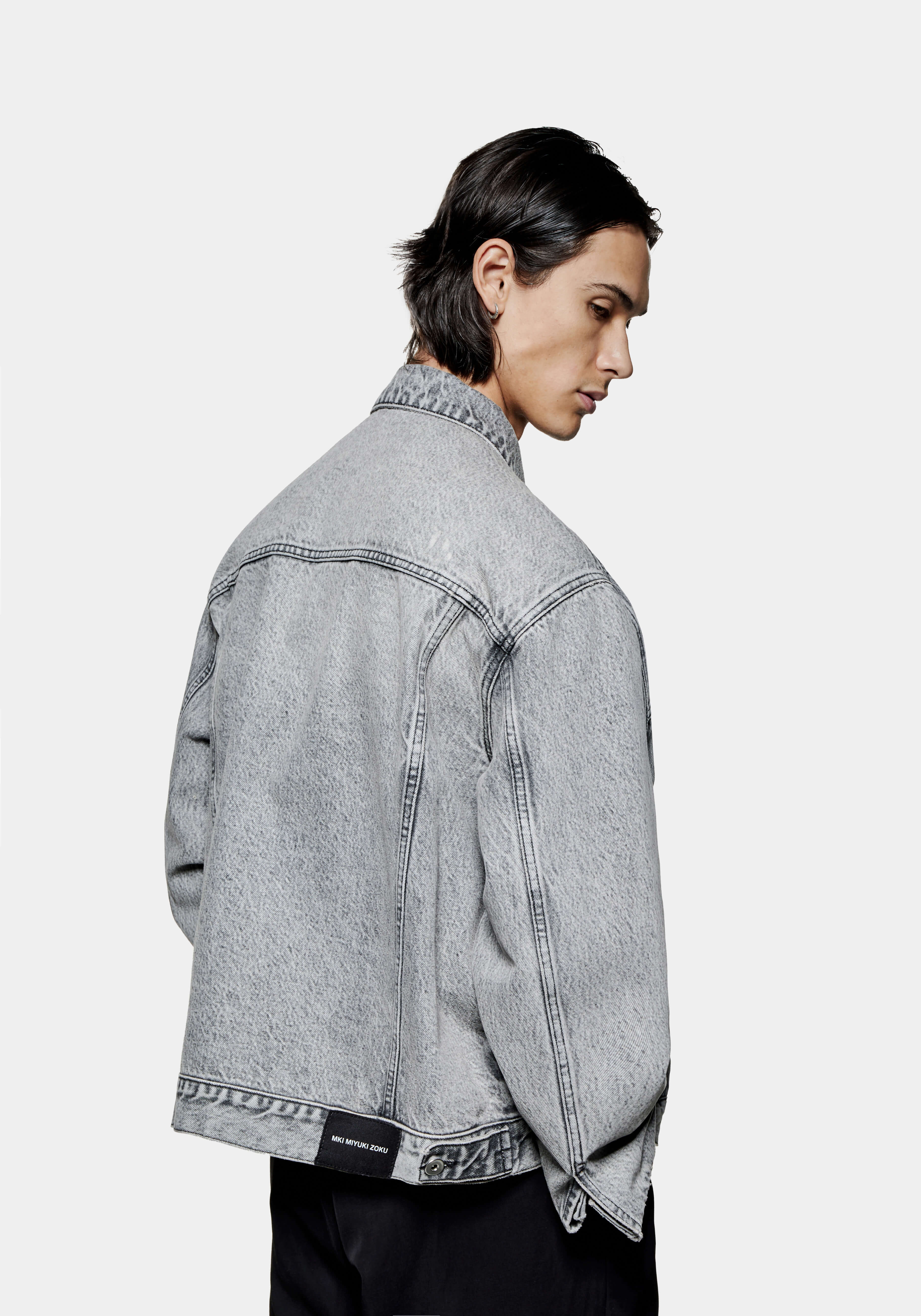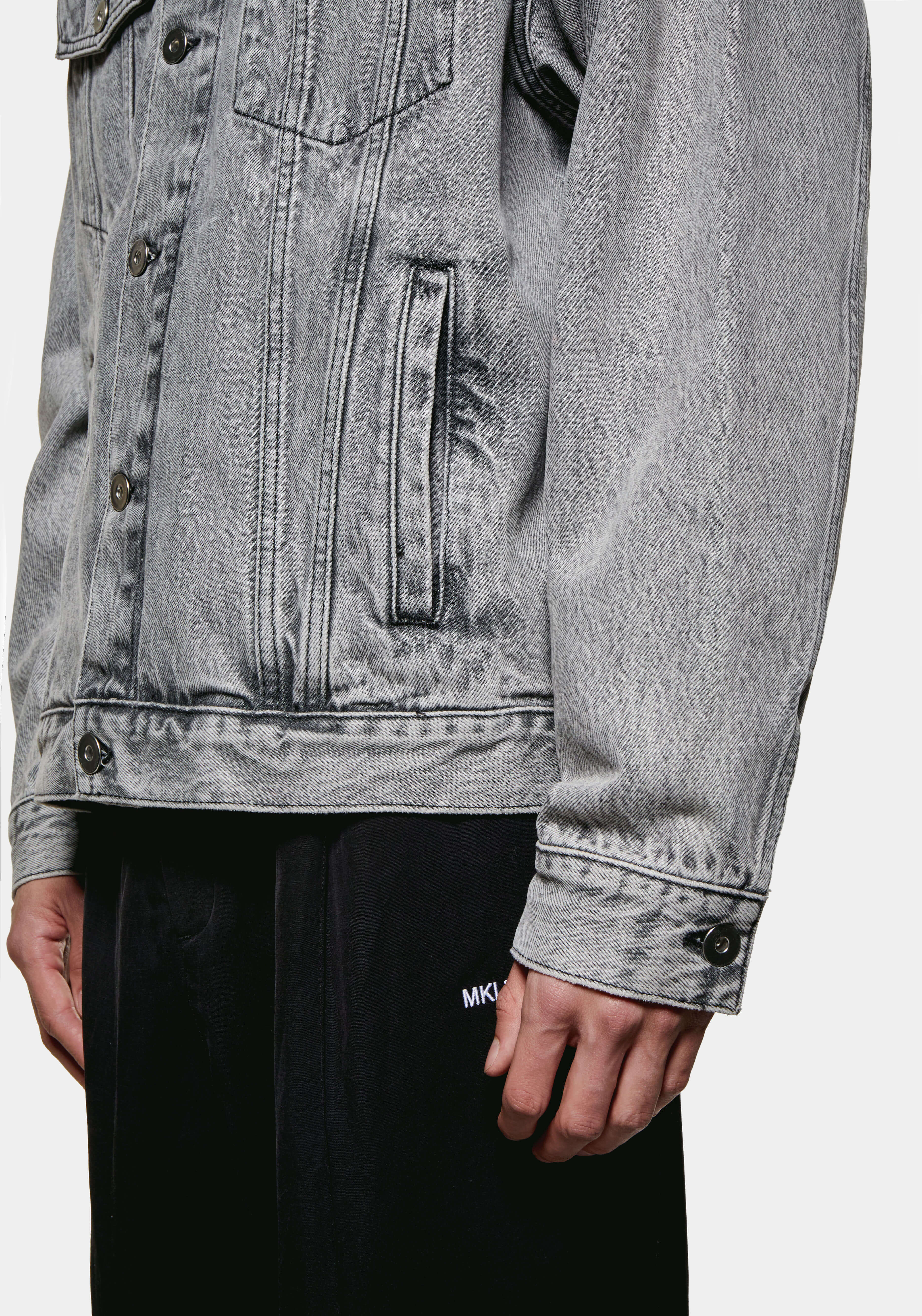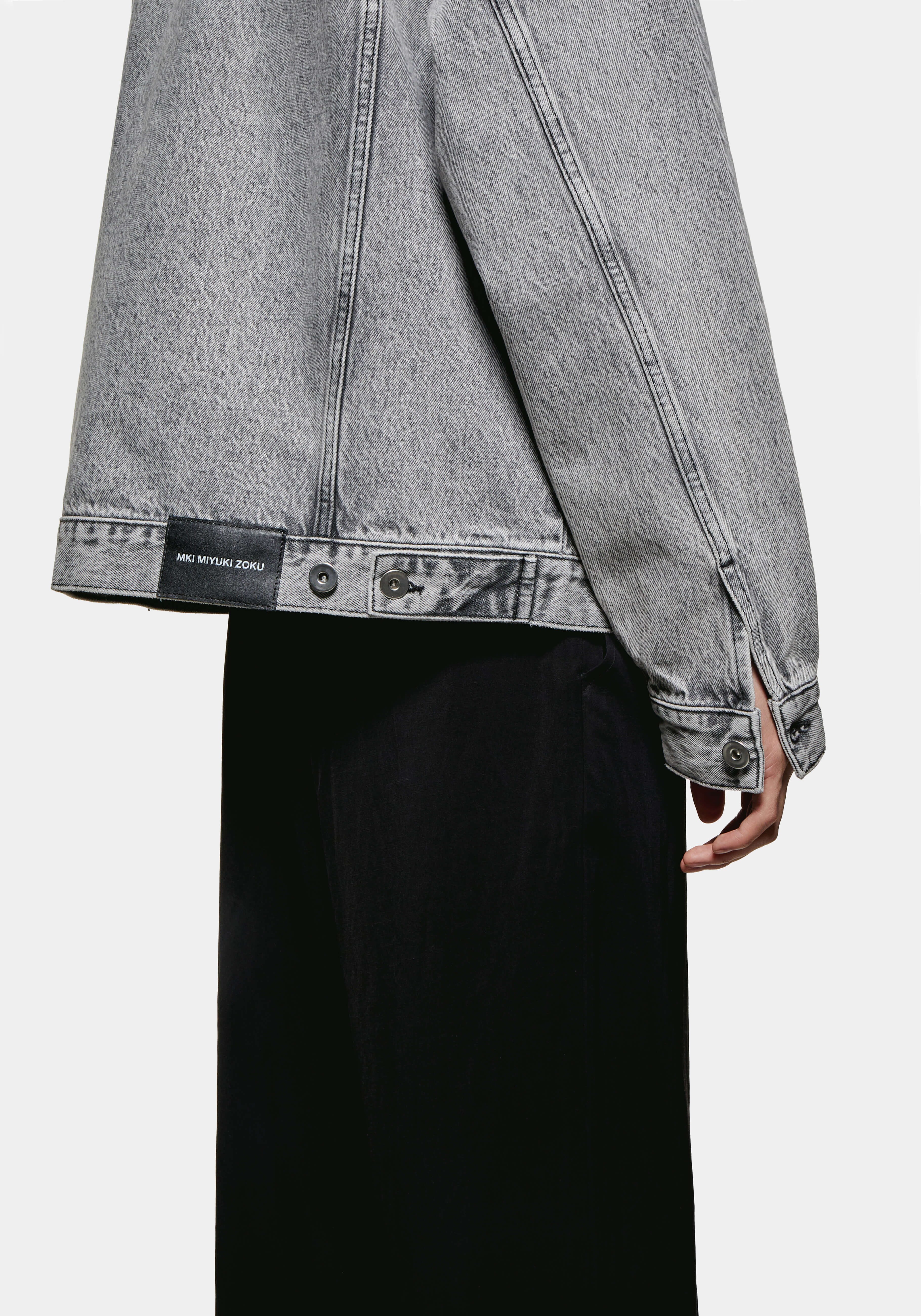 MKI DENIM TRUCKER JACKET IN WASHED BLACK. EXCLUSIVELY IN WASHED BLACK FOR SS25, THIS COLLECTION COMBINES TRADITIONAL AND MODERN SILHOUETTES. EACH PIECE FEATURES SUBTLE DISTRESSING AND A HEAVY WASH FOR A SOFT, VINTAGE LOOK.